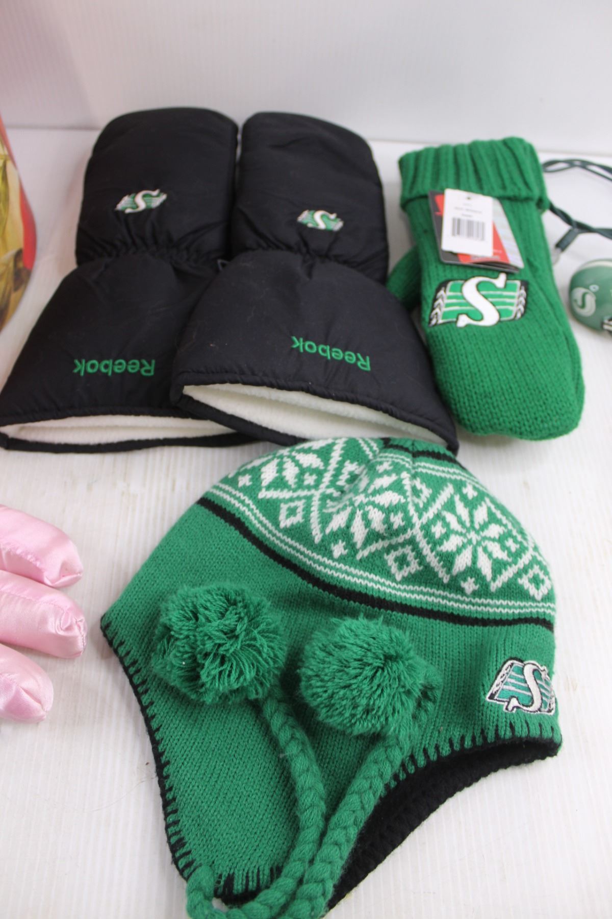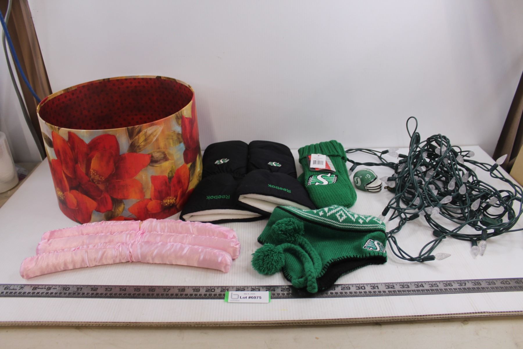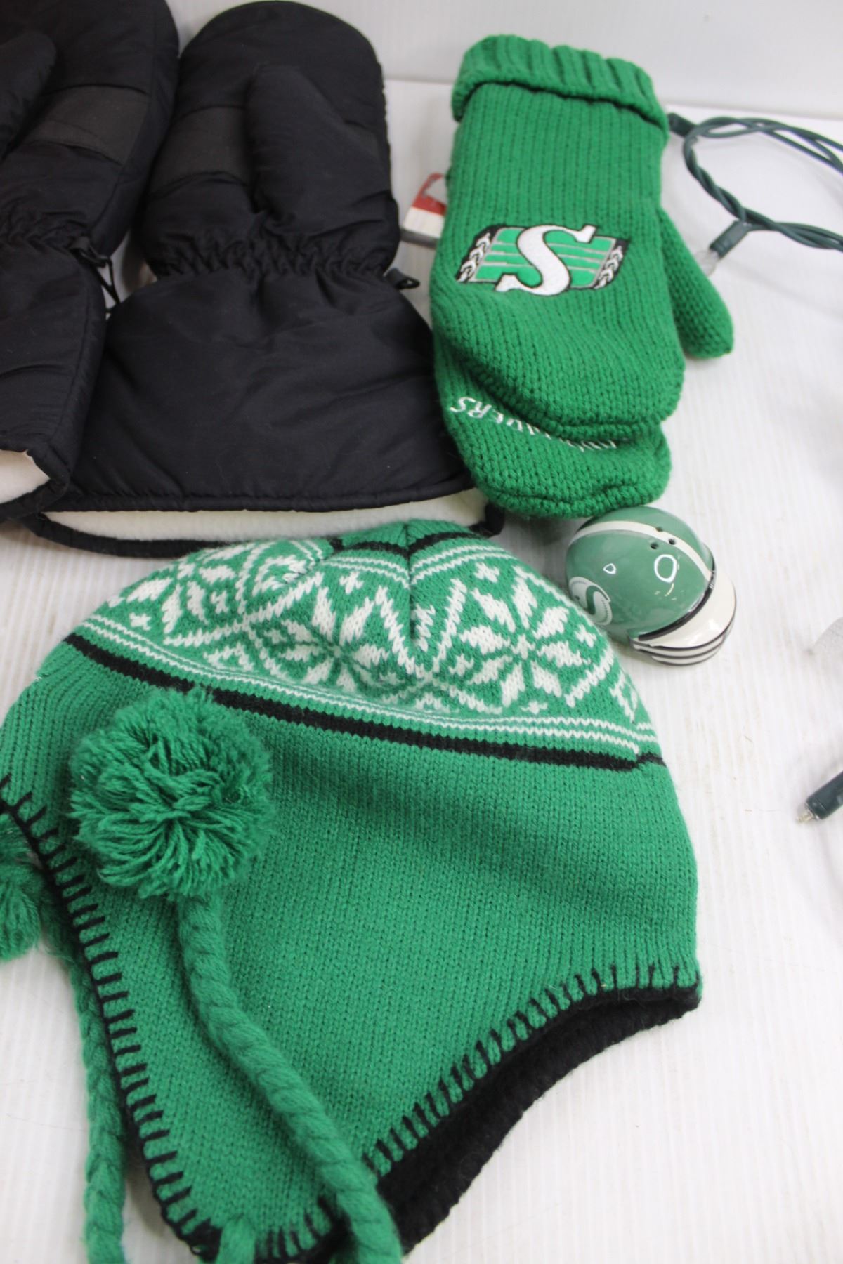 Saskatchewan Roughriders Lot (2 Pair of Mittens, Toque - Looks Unused), String Lites - Tested, Misc.