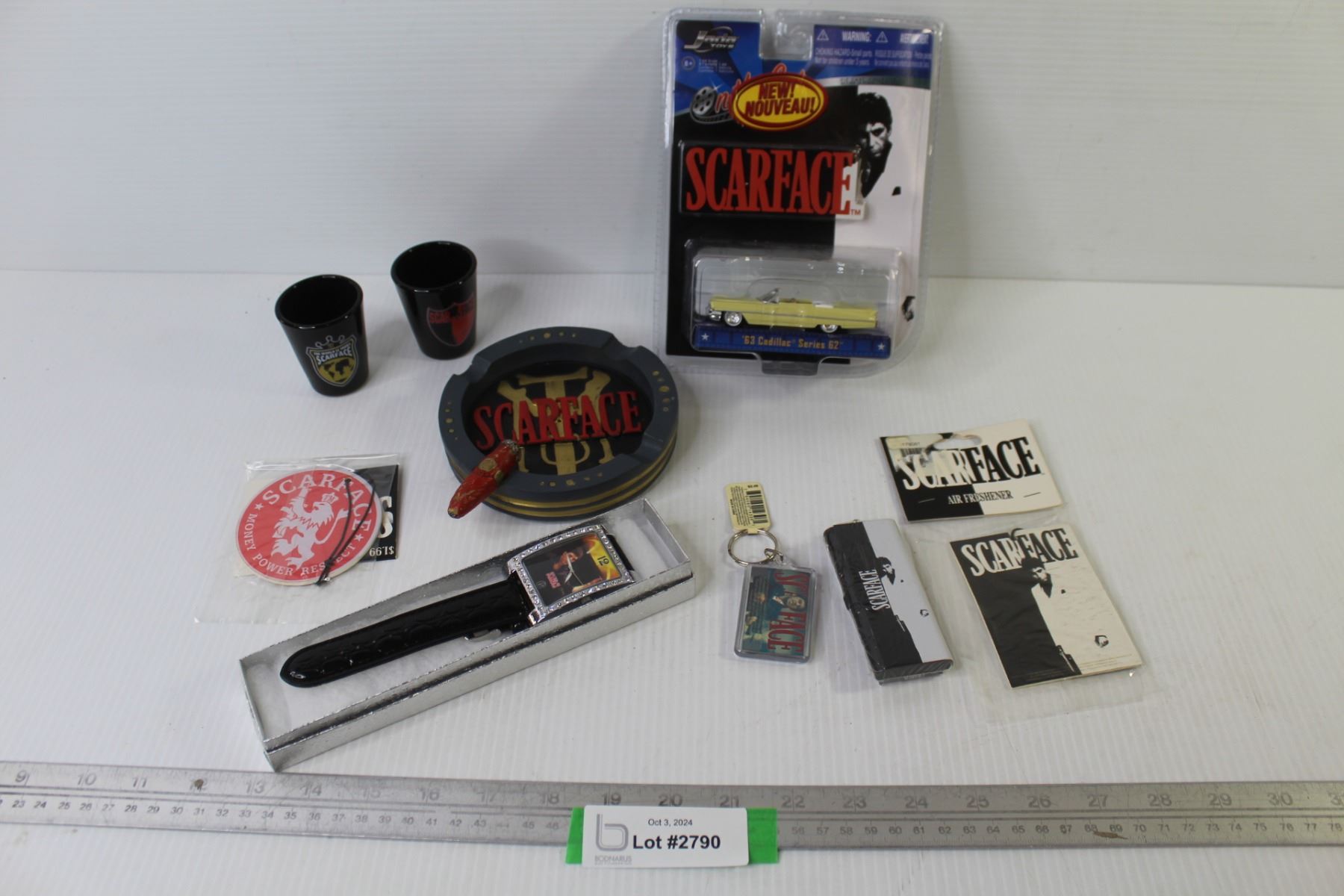 Scarface Collectable Items - Ashtray - Diecast 63 Cadillac - Ceramic - Shot Glasses - Watch (not running) - Misc. Items