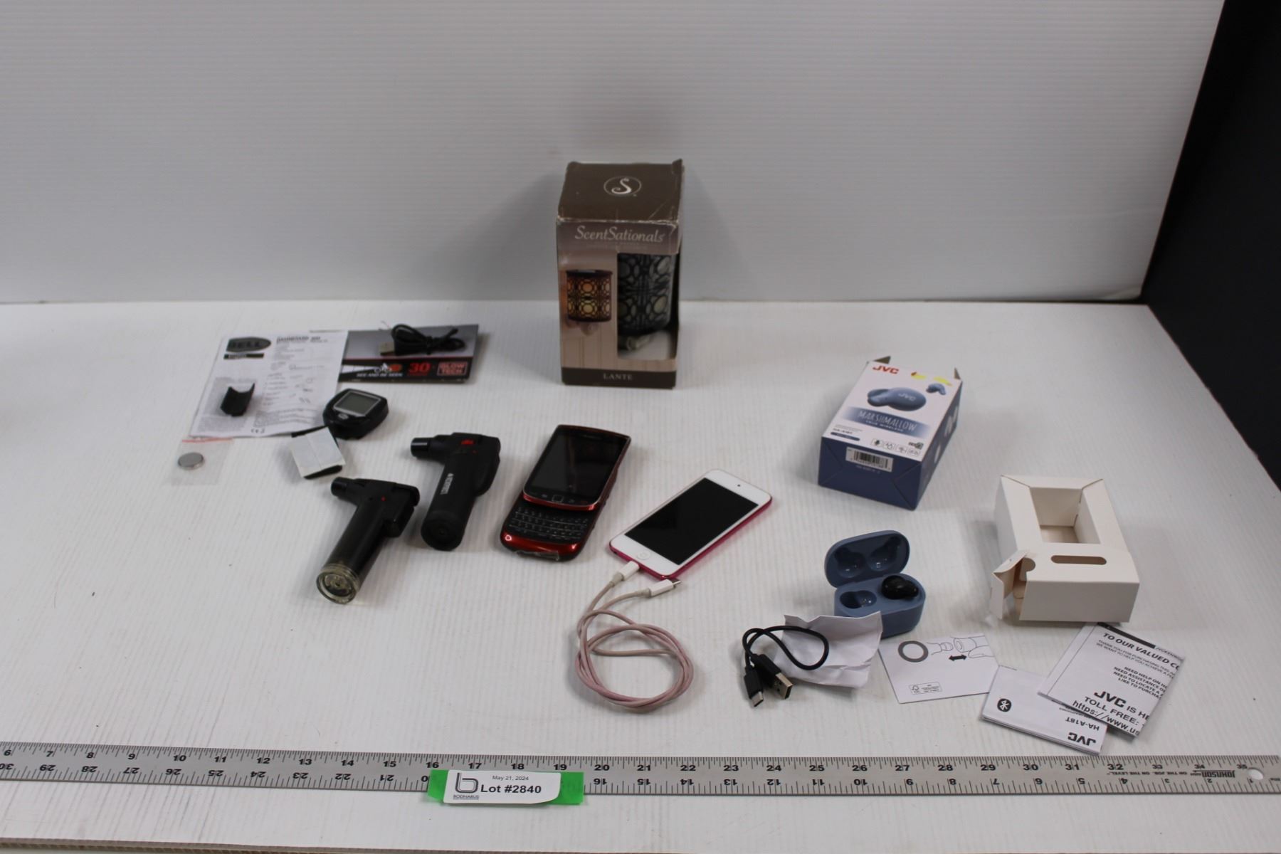 Scent Sensations Accent Warmer, Bell Dashboard 300 For Bicycle (Appears Incomplete), (2) Mini Torch Lighters (Untested), Blackberry Torch 9800 Red And Black Slider Phone (Untested), Pink iPod Touch 5th Gen (Untested) & JVC Marshmallow Ear Bud (1 Missing)
