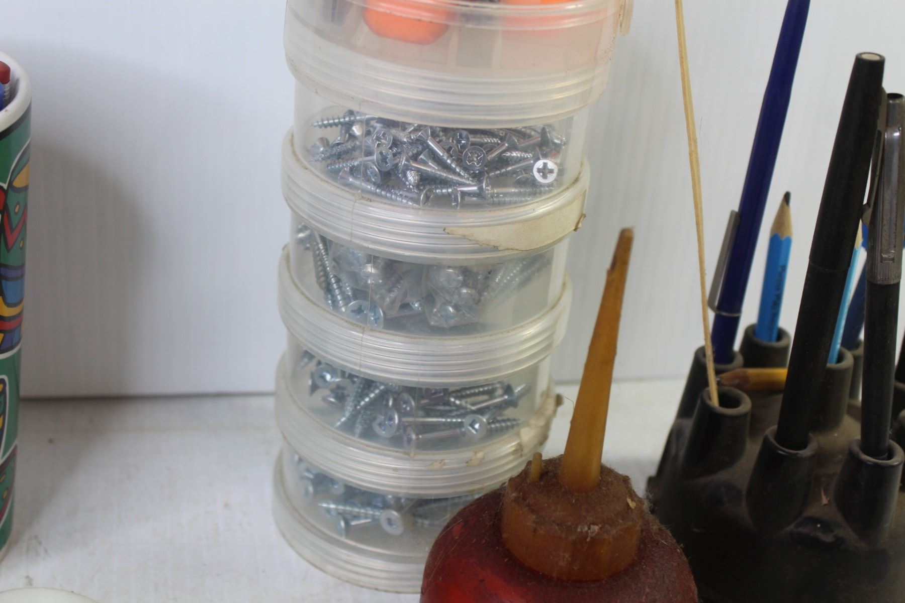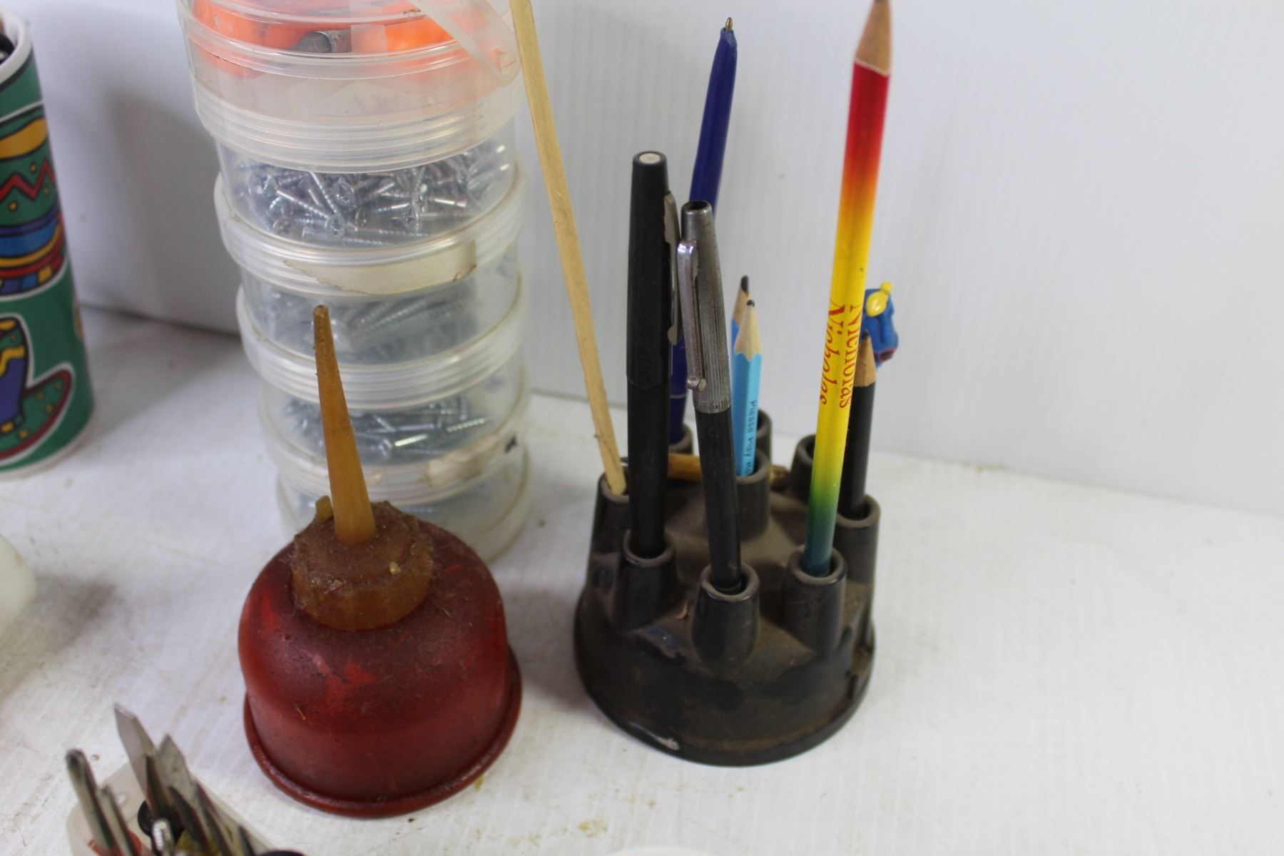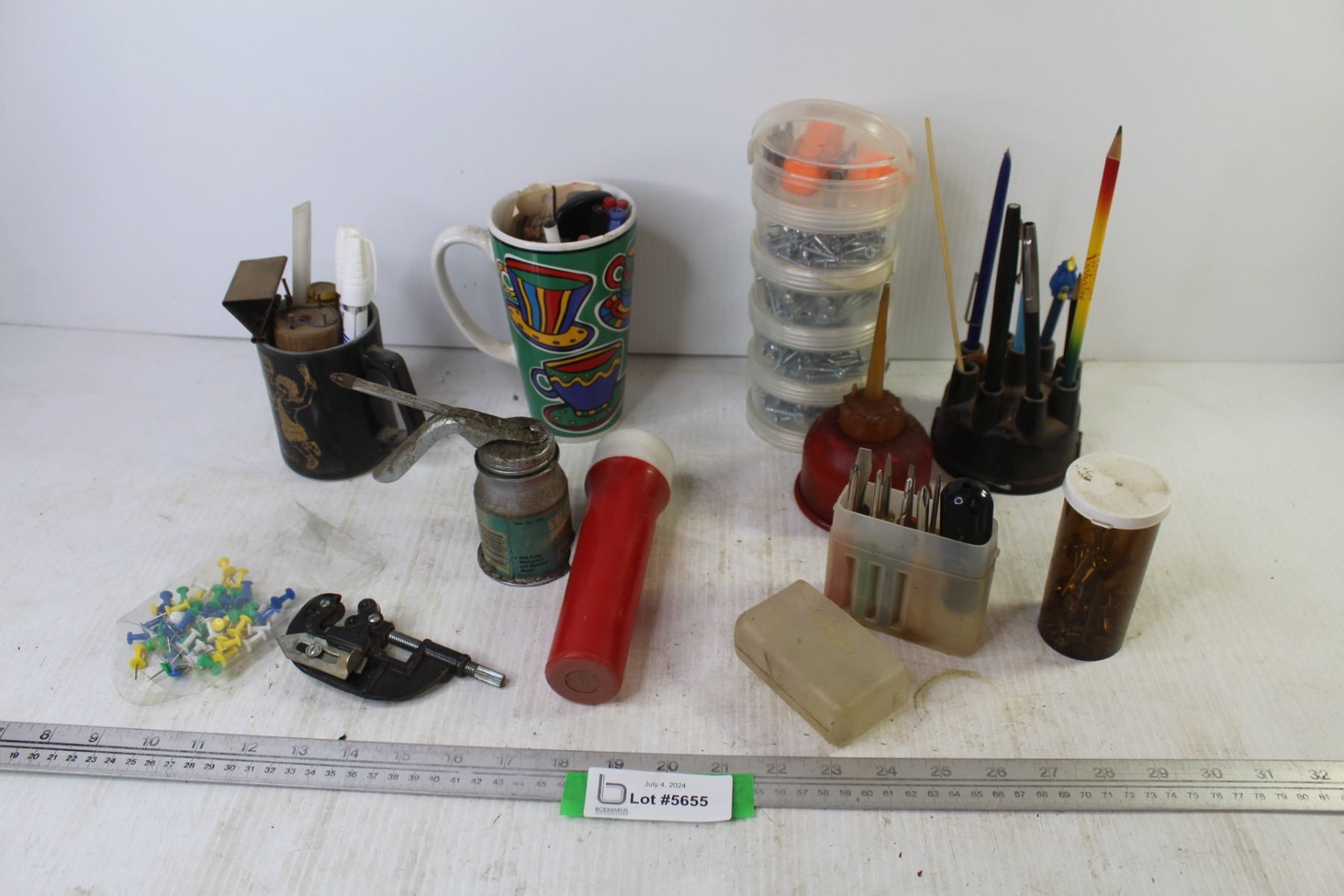 Screw Organizer - Pens & Pencils - Oiler Cans - Small Screw Driver Set - Oil Can Spout Opener - Misc. Items
