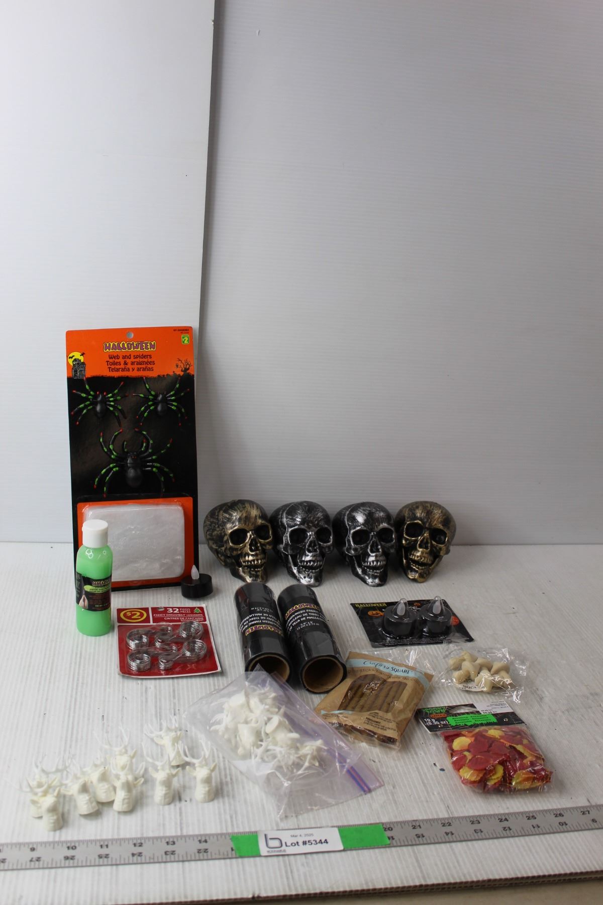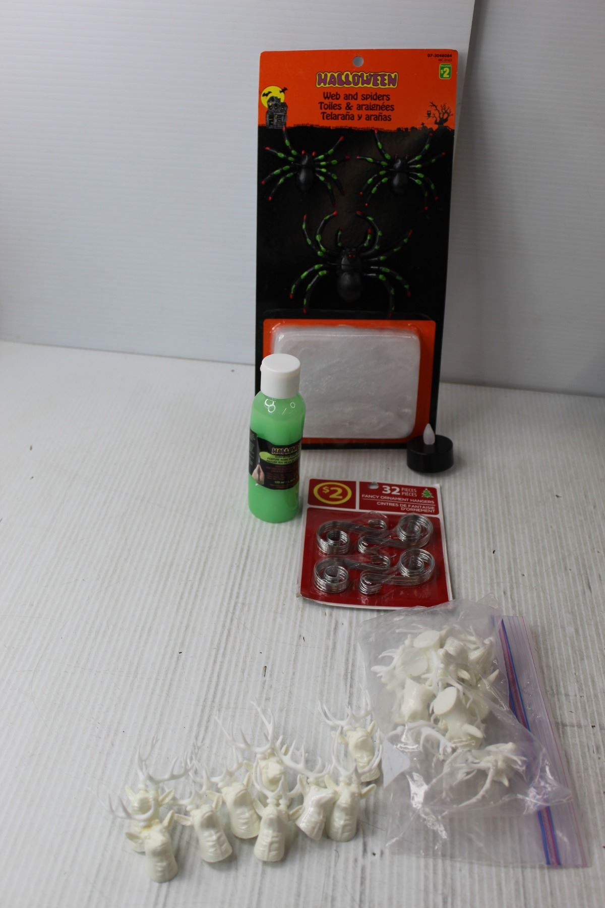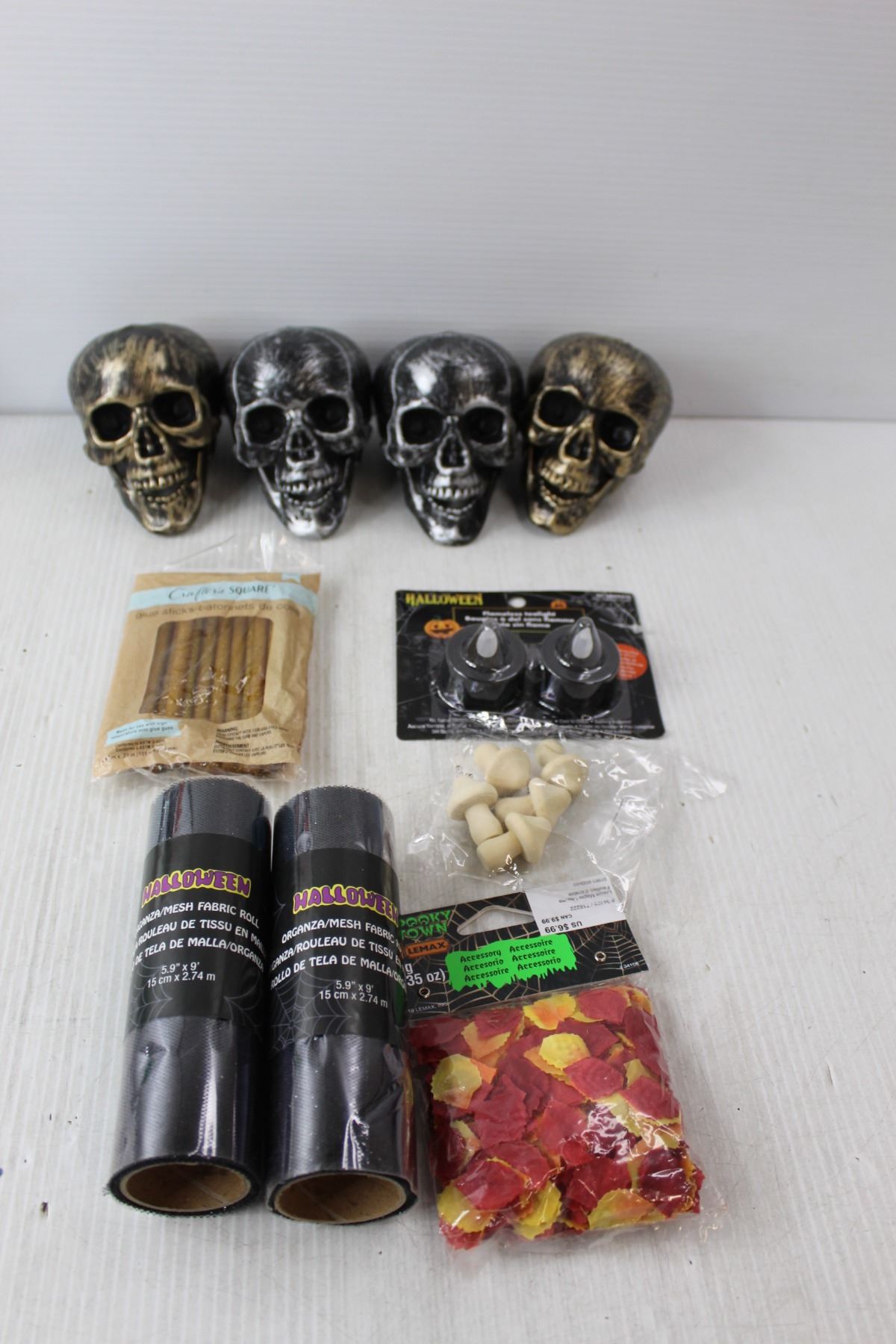 Seasonal Lot- (4) Plastic Skulls, Miniature Reindeer Heads, Leaf Confetti, Misc.