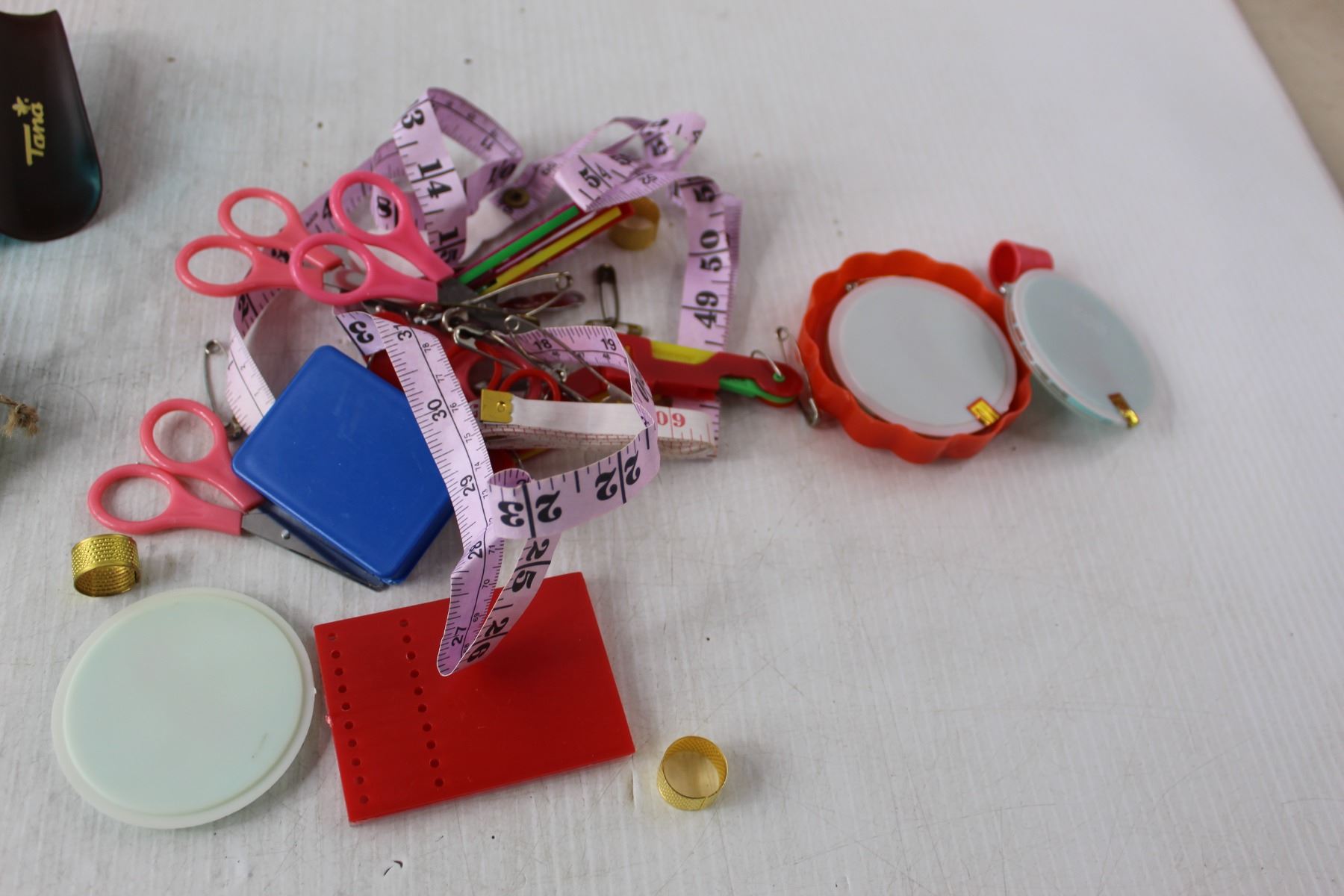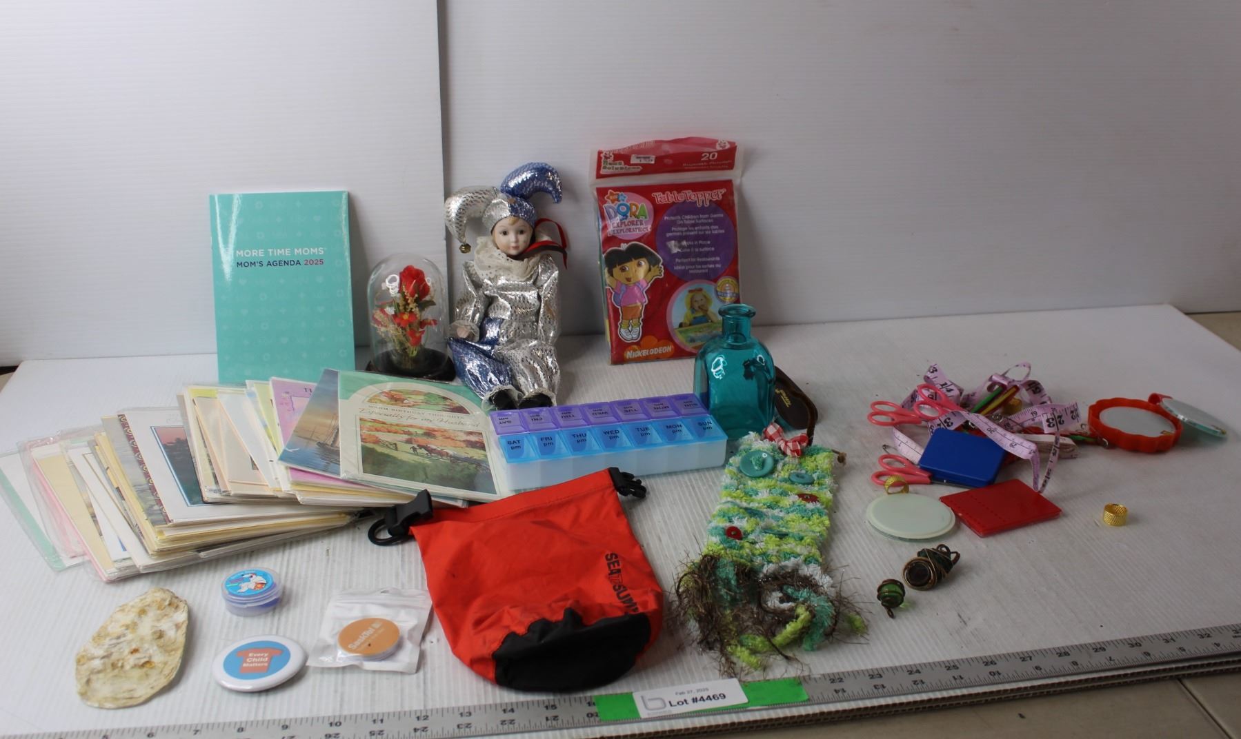 Sewing Supplies, Porcelain Clown Figurine, Swimming Earplugs, Assorted Greeting Cards, Misc.