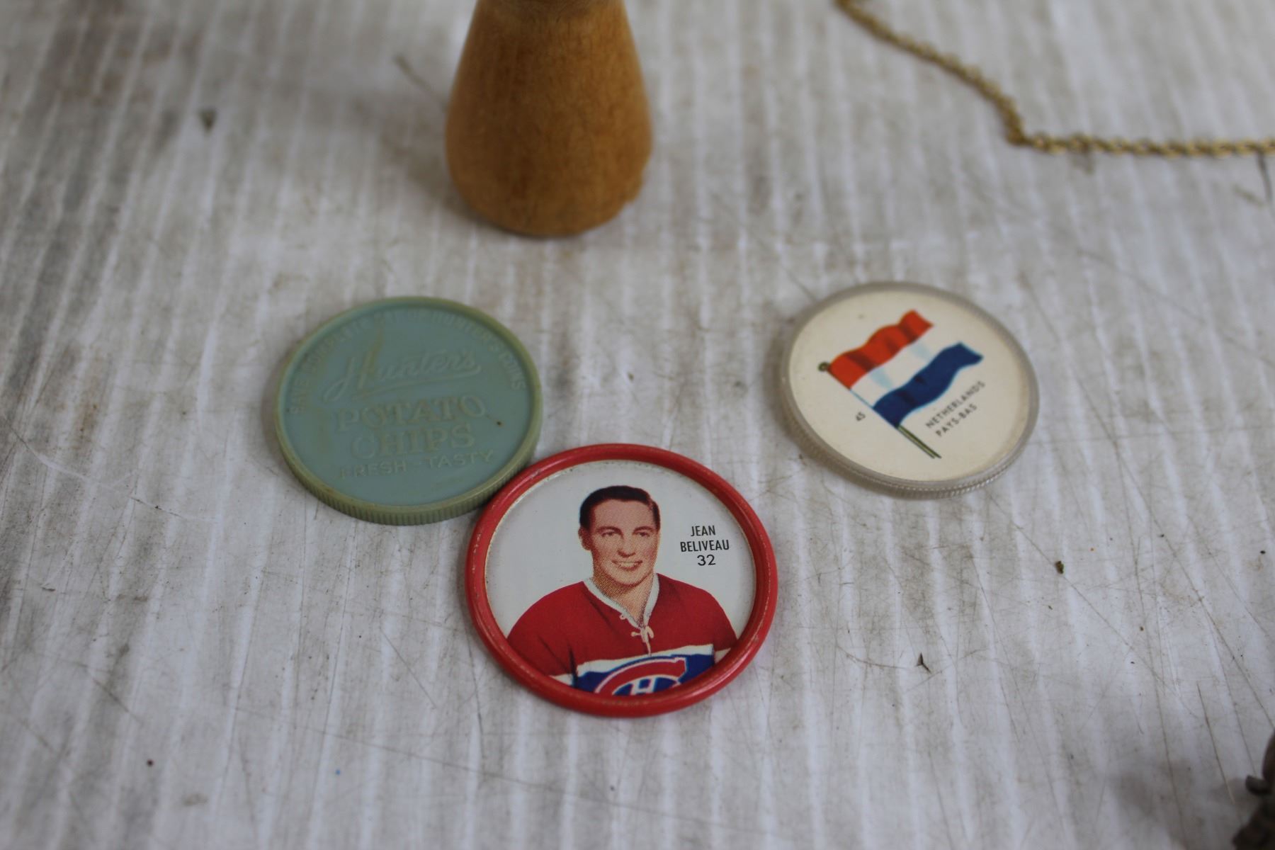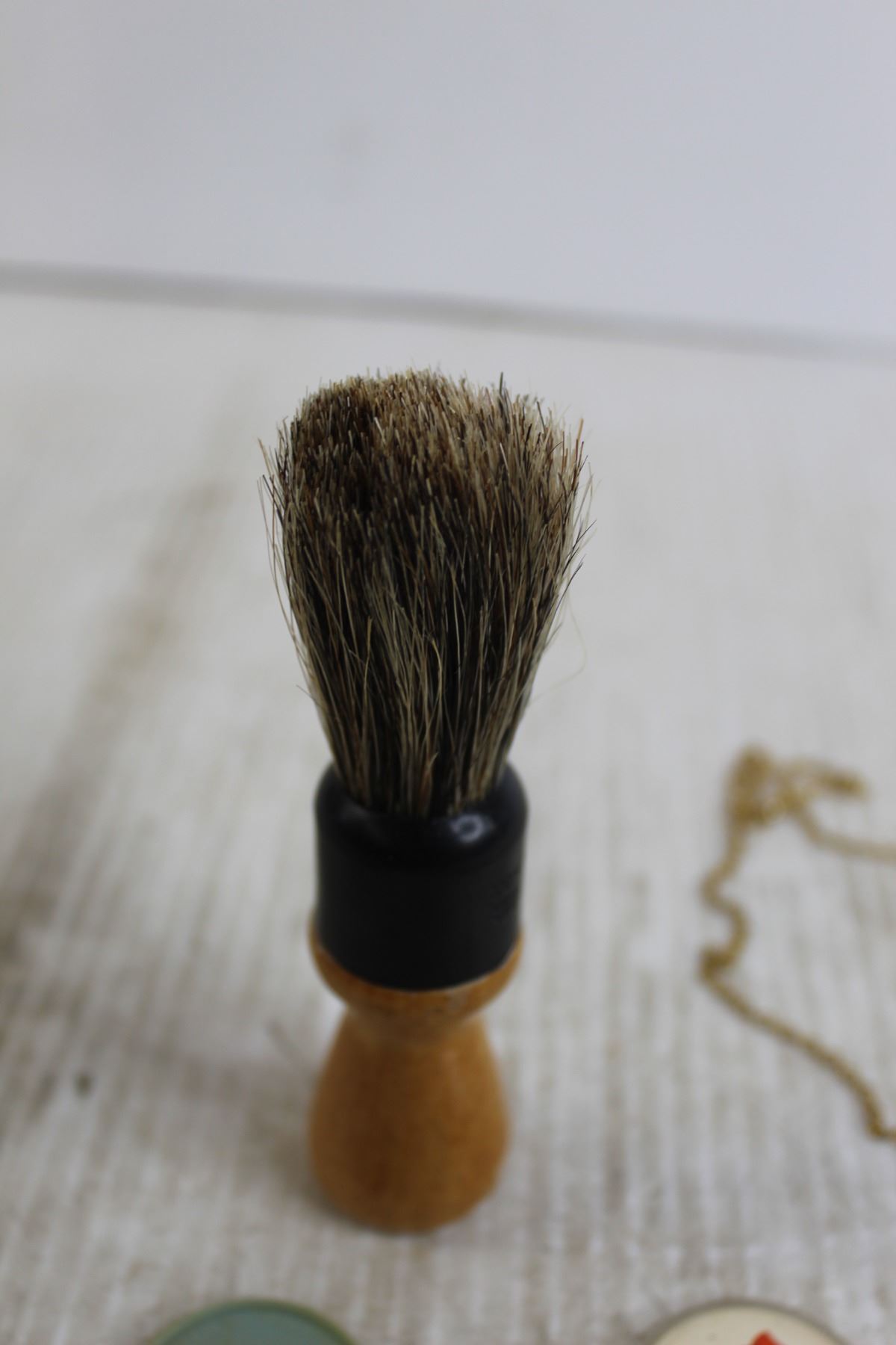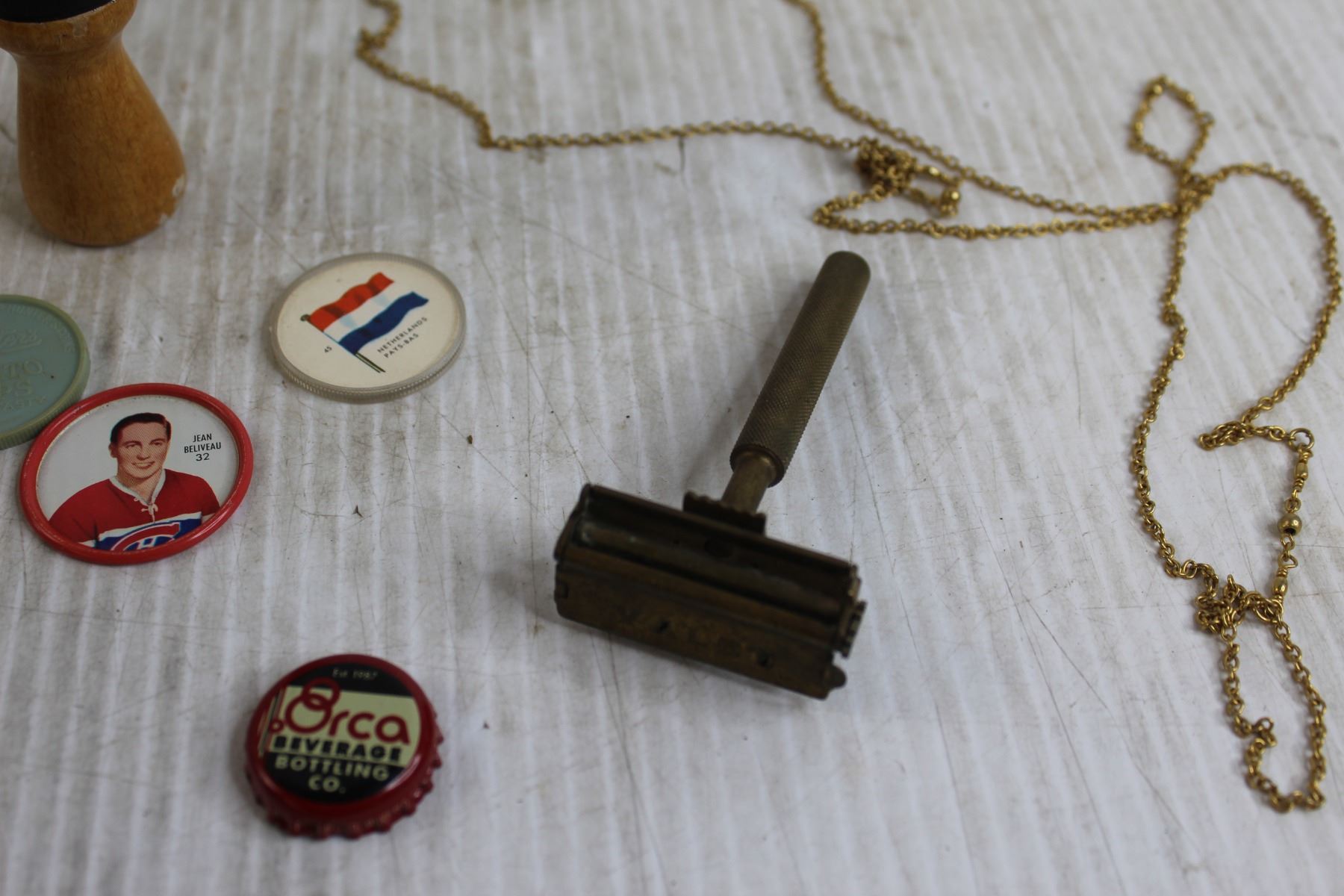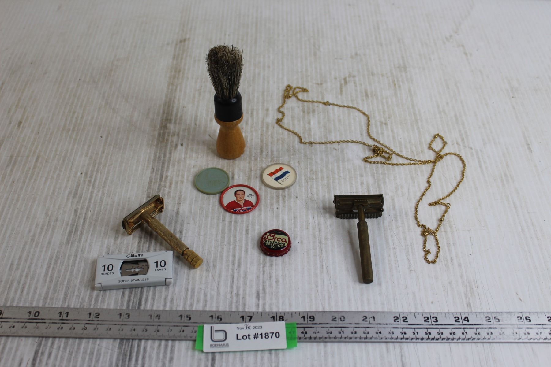 Shaving Cream Brush, (2) Razors, Gilette Razor Blades, (3) Jello Coins, Misc.
