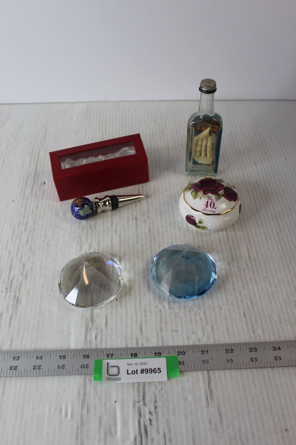 Ship In Glass Bottle; "Globe" Stopper; (2) Glass Paper Weights; 40th Anniversary Covered Dish
