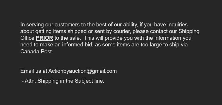 A online bidding premium may be applied to each lot purchased on the Internet. Federal GST and corresponding Provincial Sales Tax will apply to all purchases where applicable.