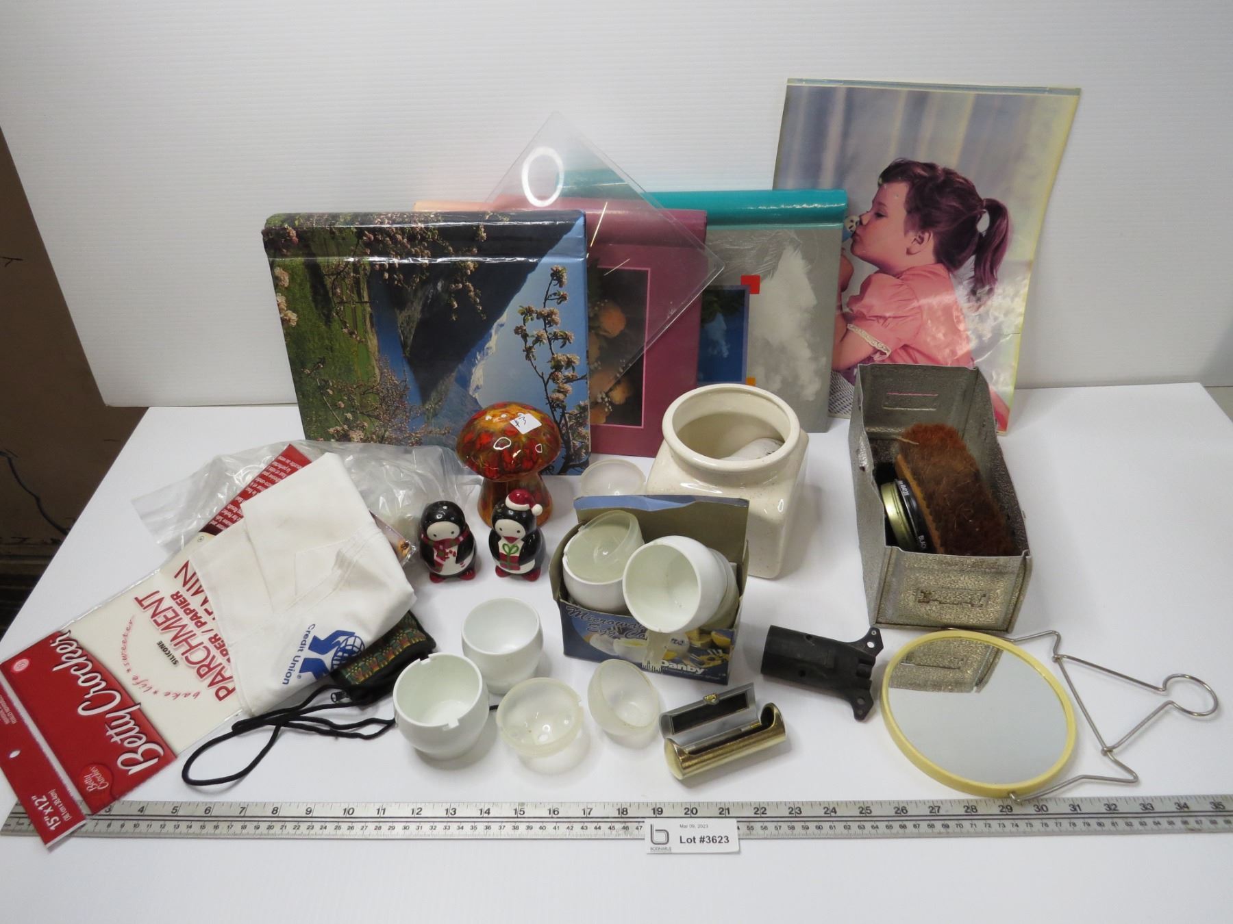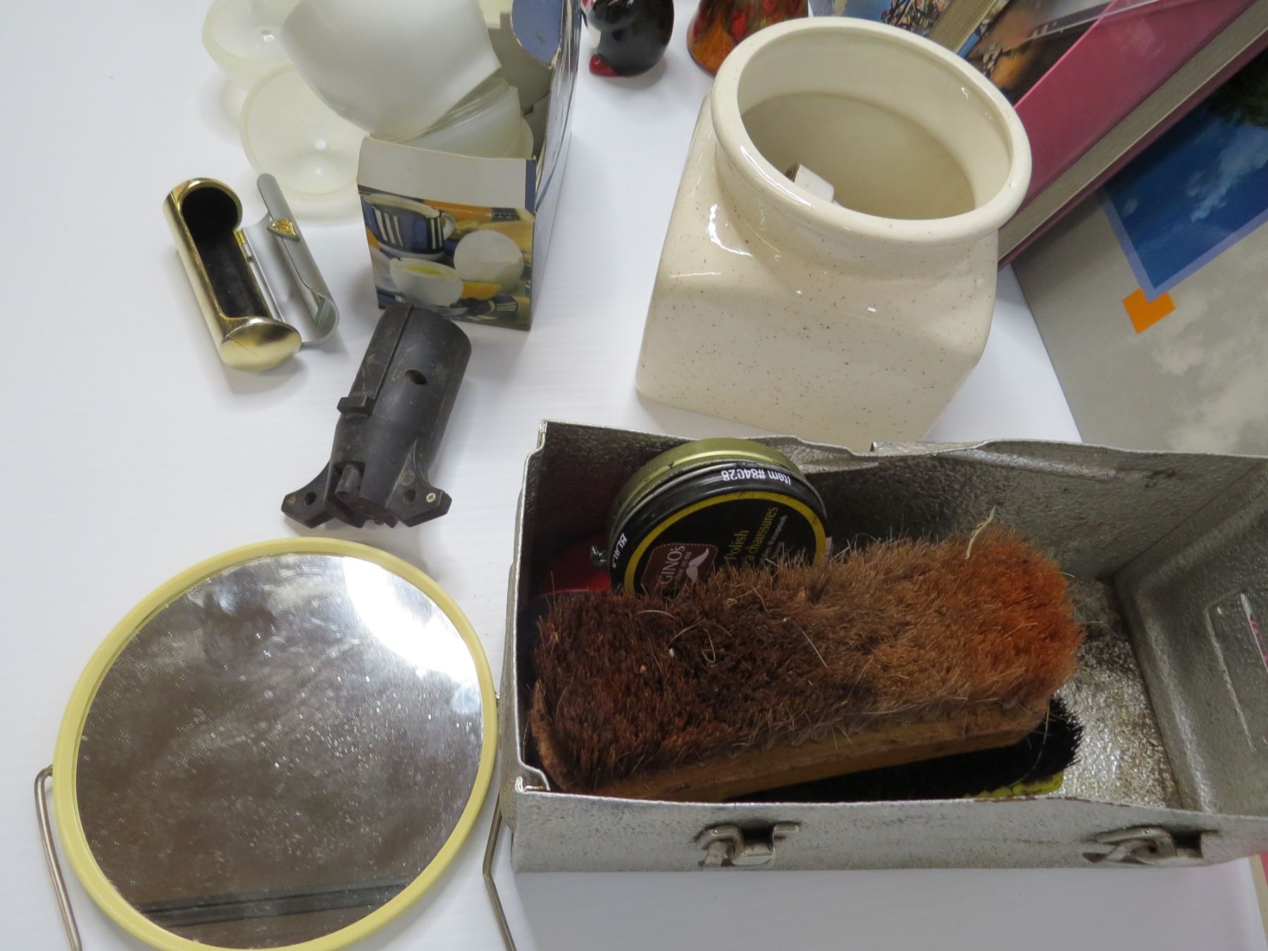Shoe Shine Kit - Photo Albums - Penguin Salt & Pepper Shakers - Microwaveable Egg Containers - Magnifying Plastic Sheet - Small Mirror - Misc Items