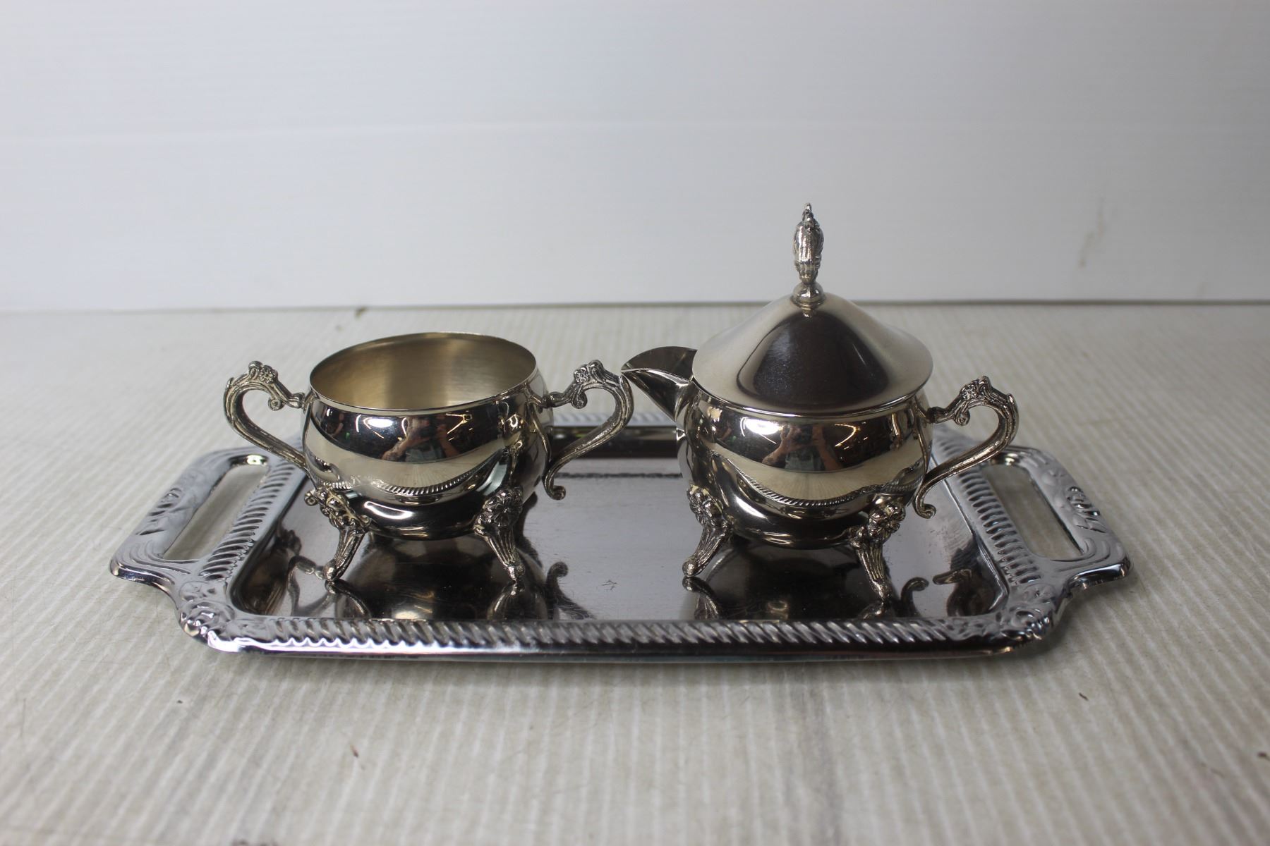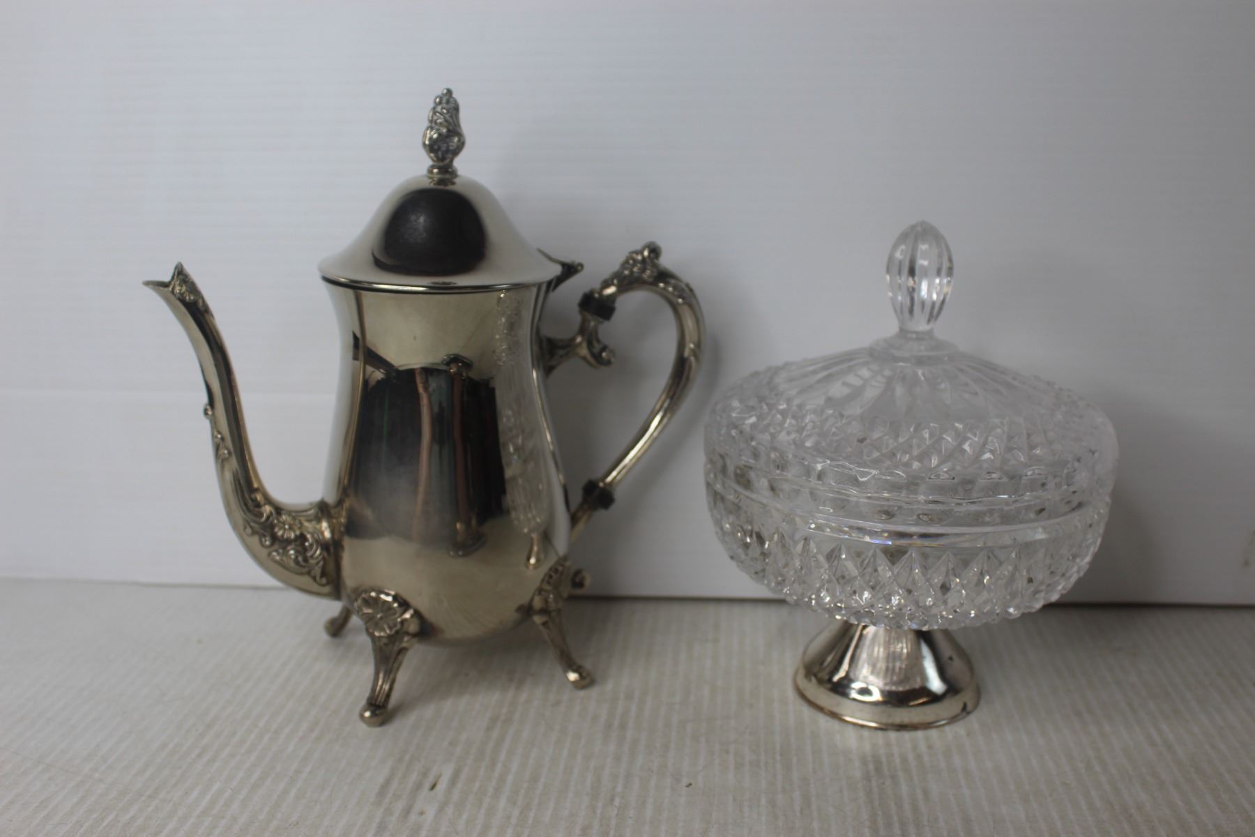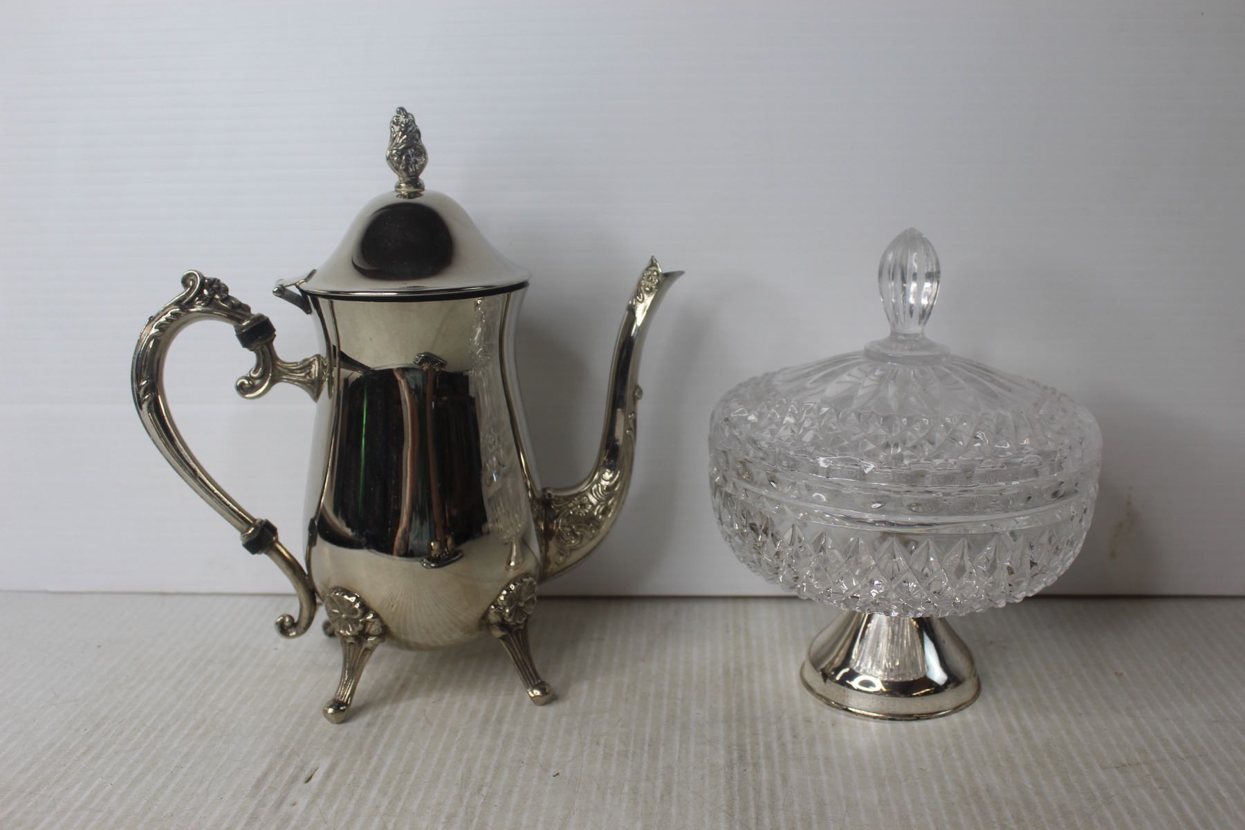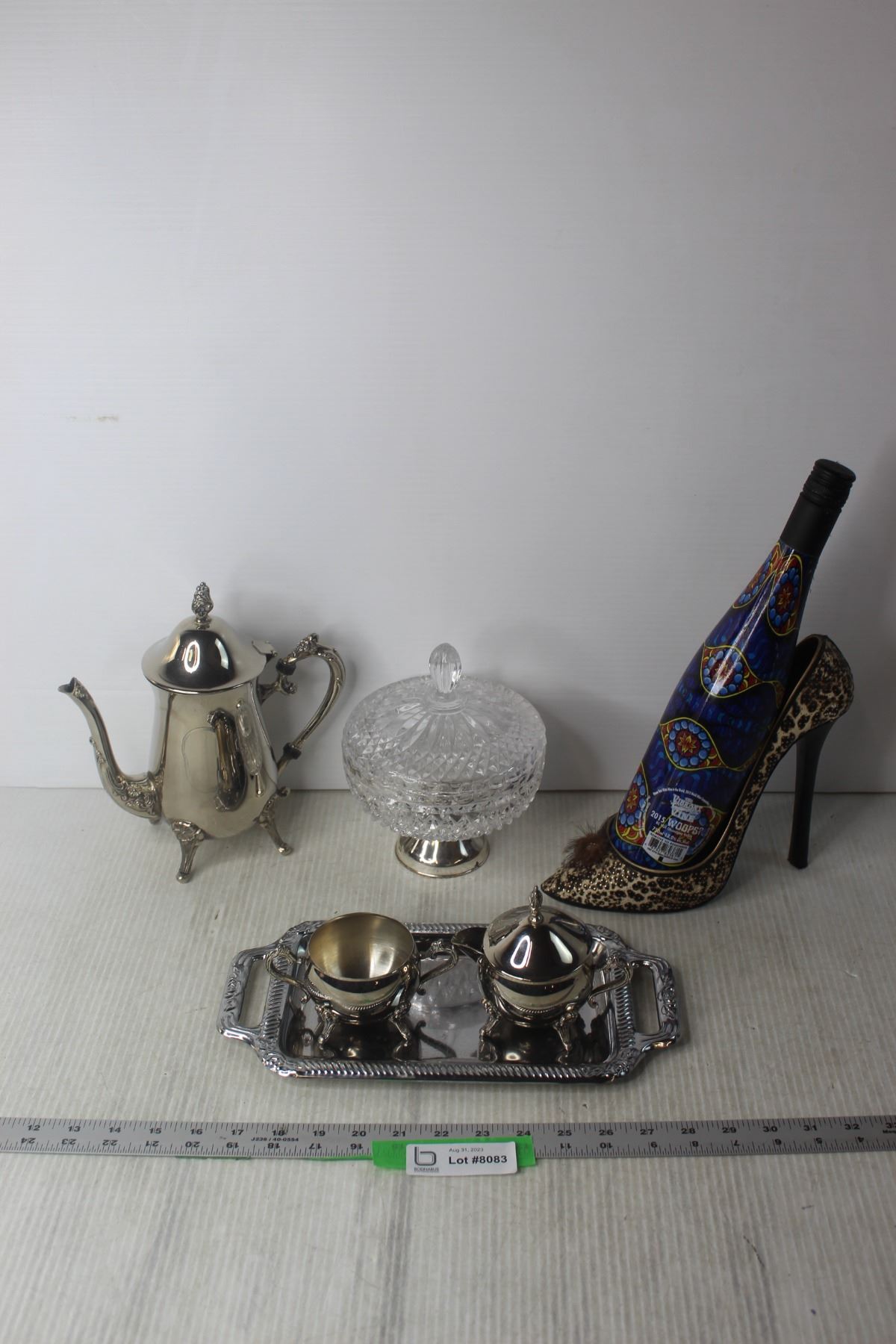 Shoe Wine Bottle Holder, Silver Plated Tea Pot, Tray and Misc.