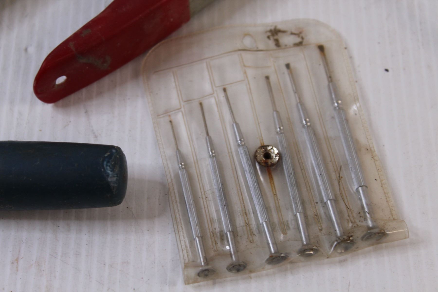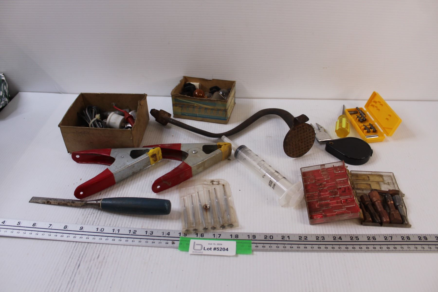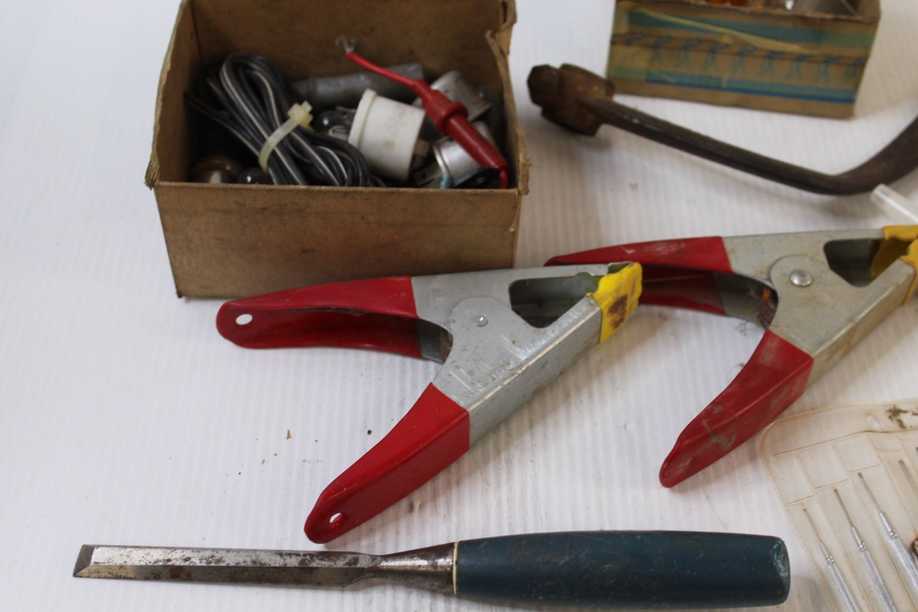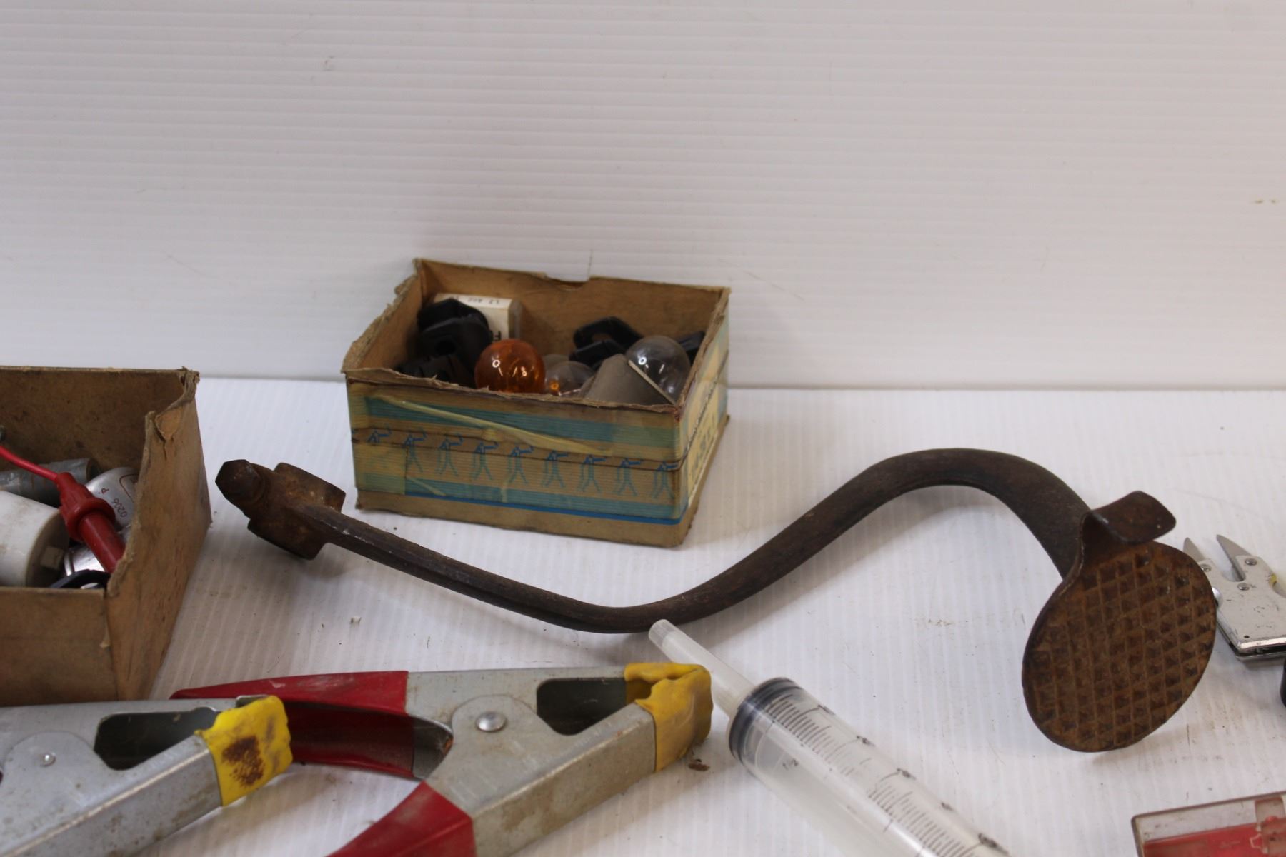 Shop Tools Lot: Vintage Tractor Clutch Pedal, Booster Cable Clamps, Mini Screwdrivers, Lightbulbs, M