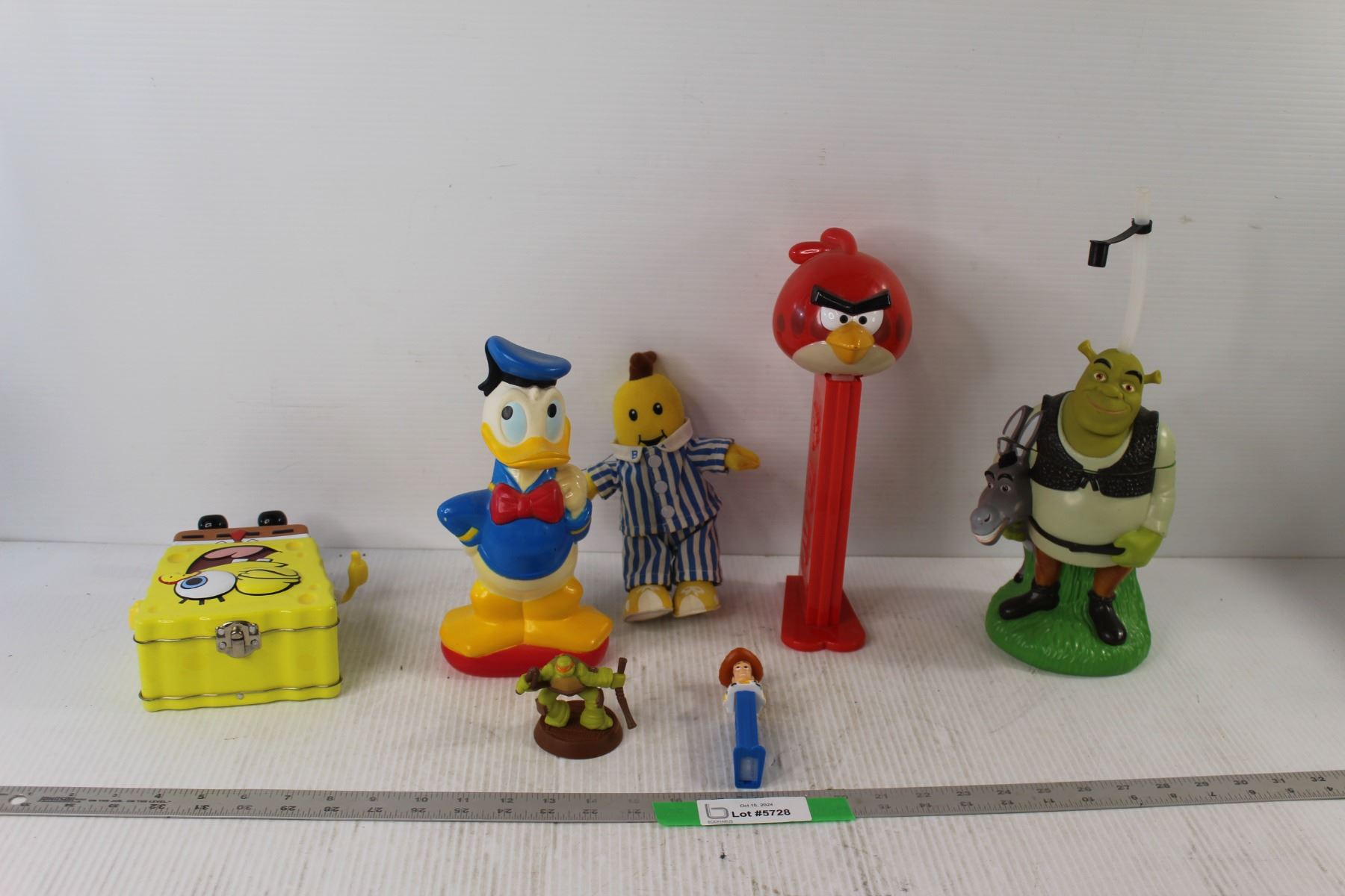 Shrek Cup, Big Pez, Pez Dispenser, SpongeBob Lunchbox, Donald Duck Figurine