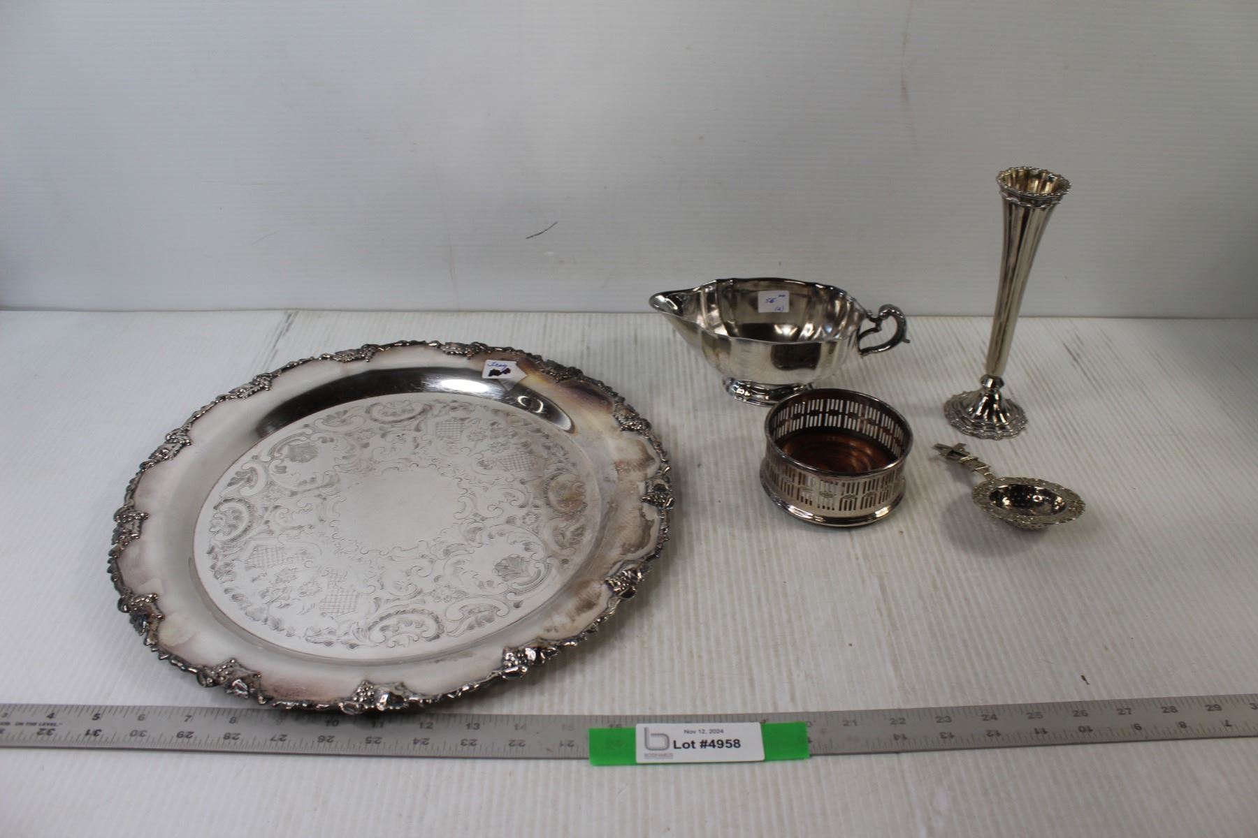 Silver Plated Tray, Candle Holder, Cream Pourer,