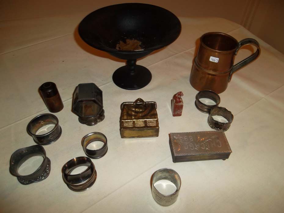 Silver box (1893) ; silver napkin rings; copper mug; wooden covered bottle