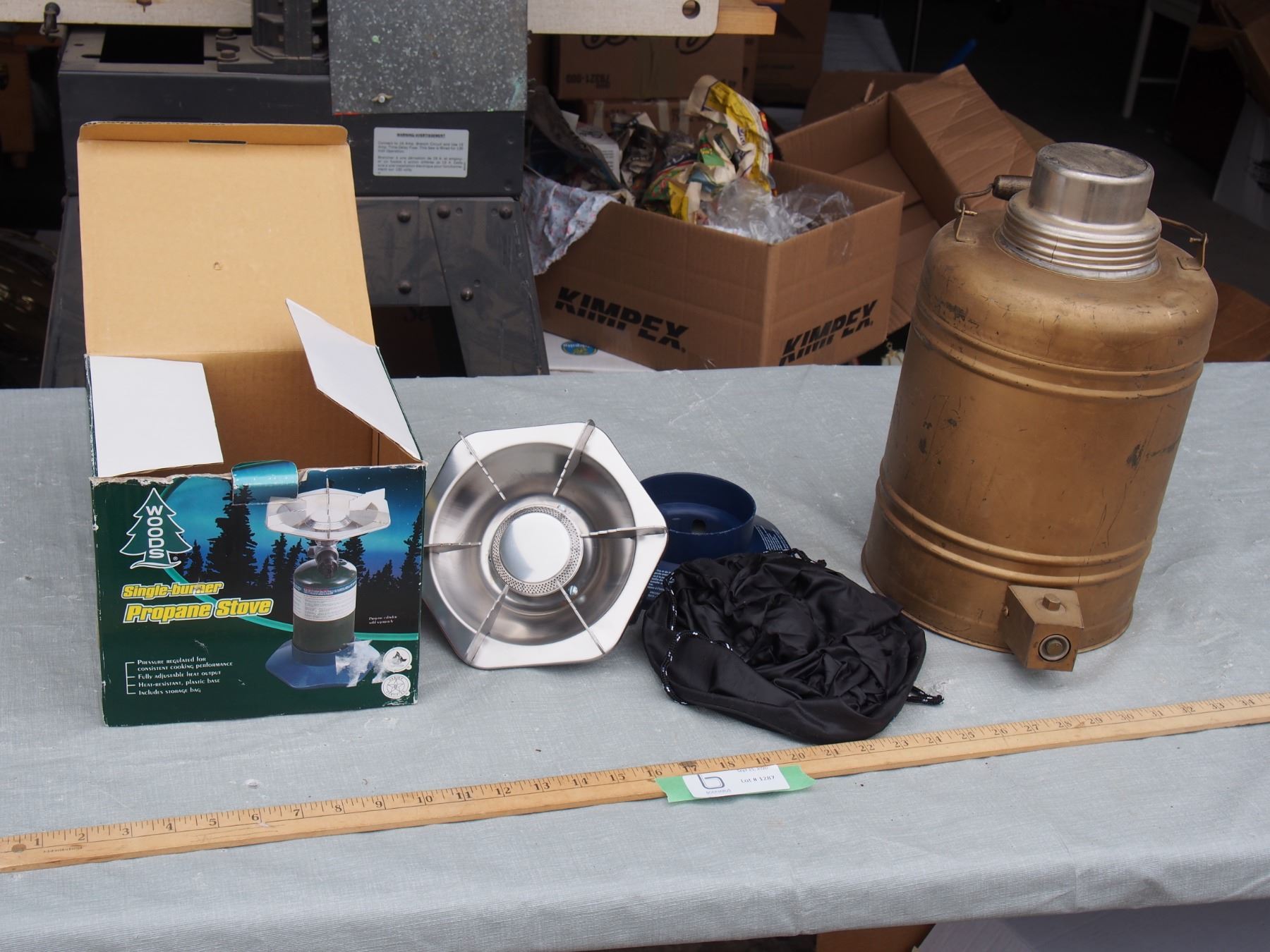 Single Burner Propane Stove (No Tank) and Vintage Thermos Dispenser