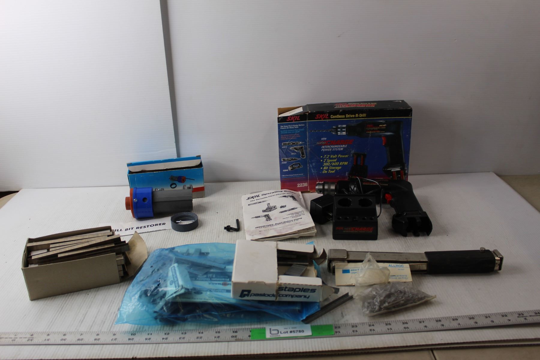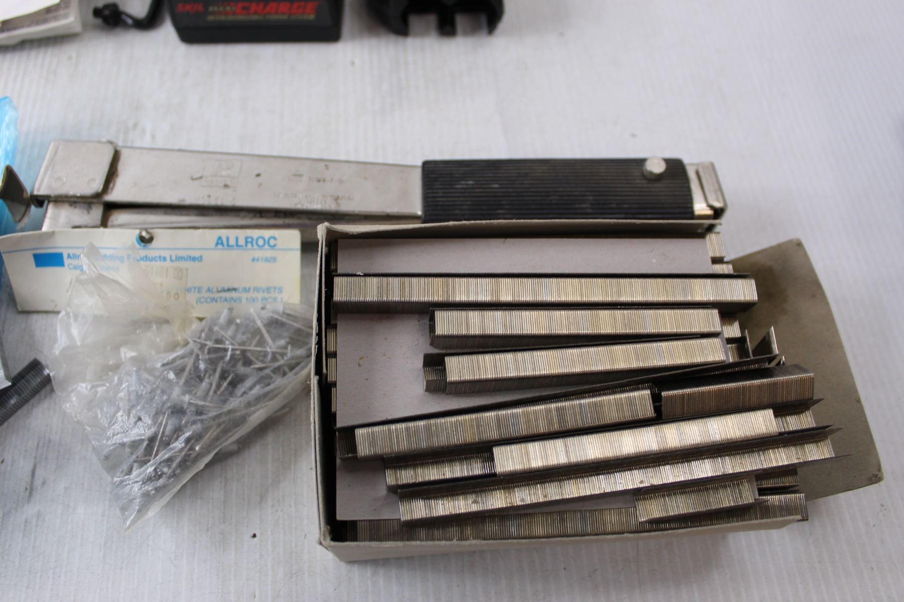 Skil Cordless Drill with Charger- No Batteries, Drill Bit Restorer, Hammer Tacker, Various Sized Staples, Rivets