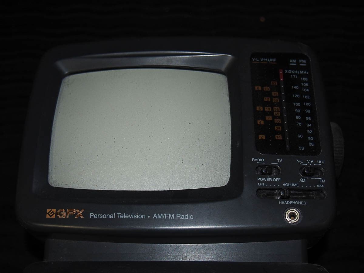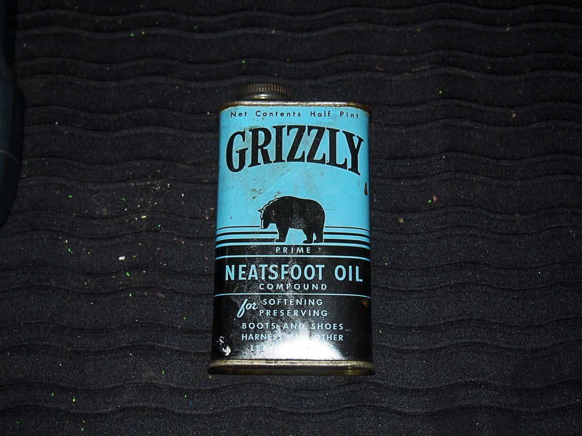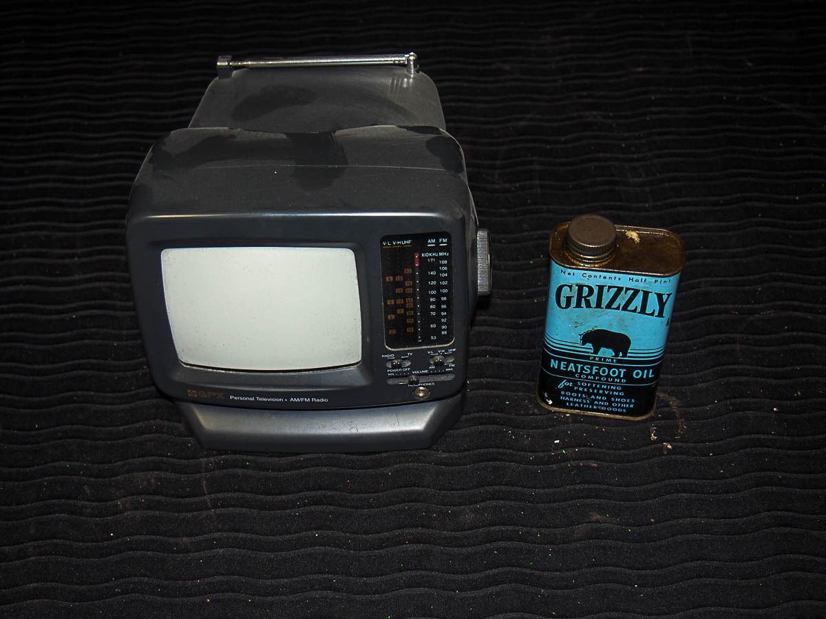 Small Portable TV & Grizzly Neatsfoot Oil Tin