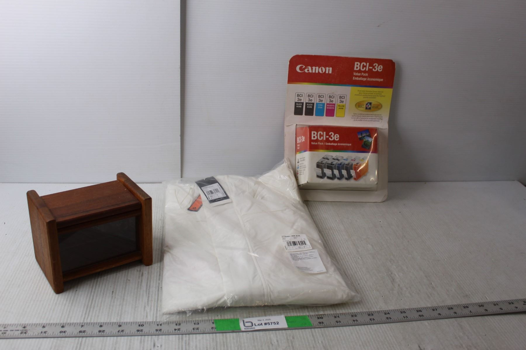 Small Wood Storage Box 5" Tall, Canon BCI-3e Printer Cartridges, MyShelter/Adidas Jacket, Sealed-L