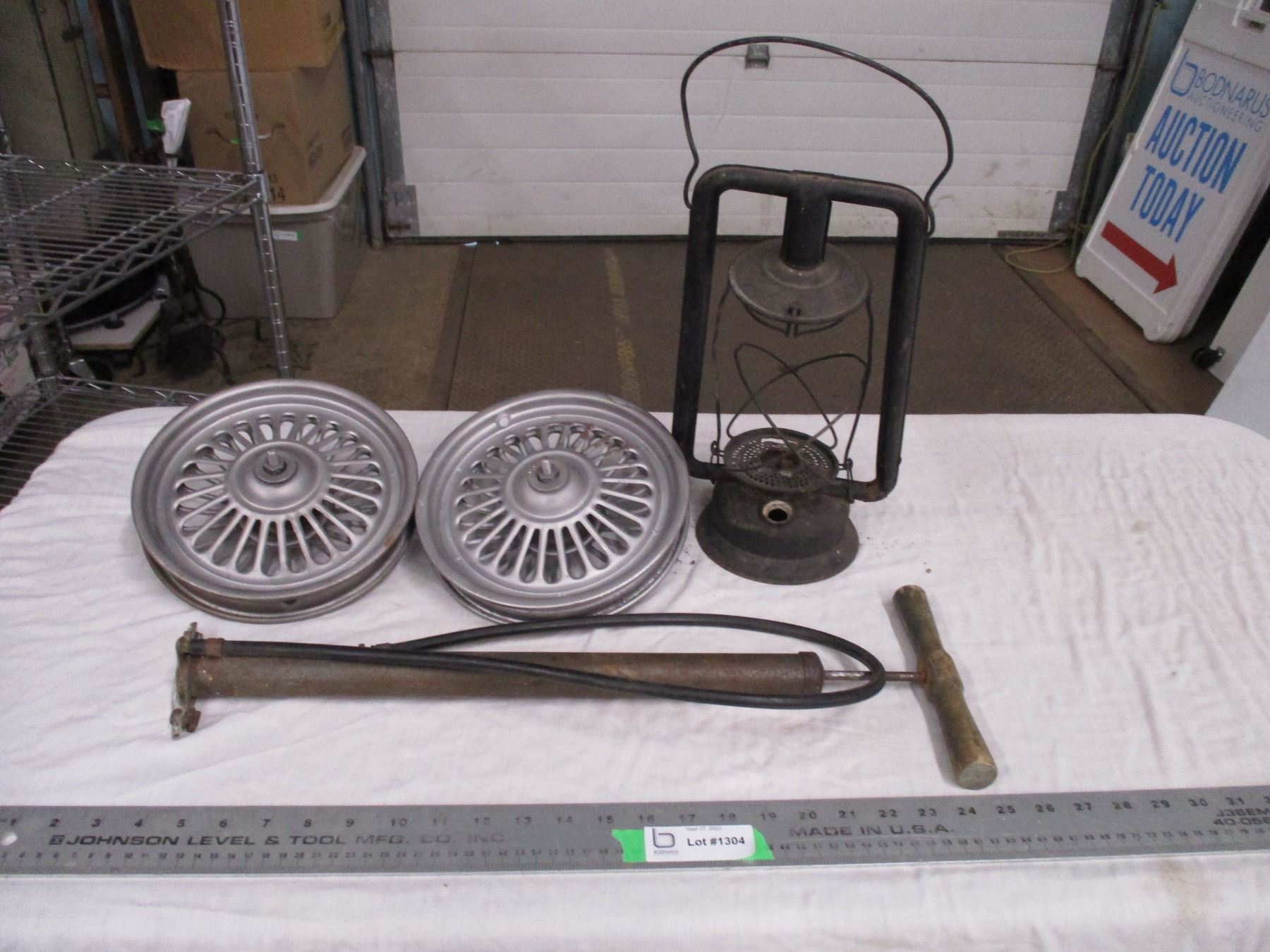 Small rims, tire pump, barn lantern
