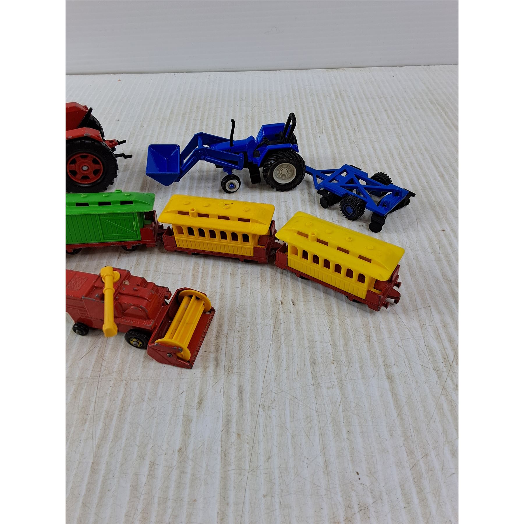 Miniture Metal Tractors, Train and Combine. Train cars are plastic.