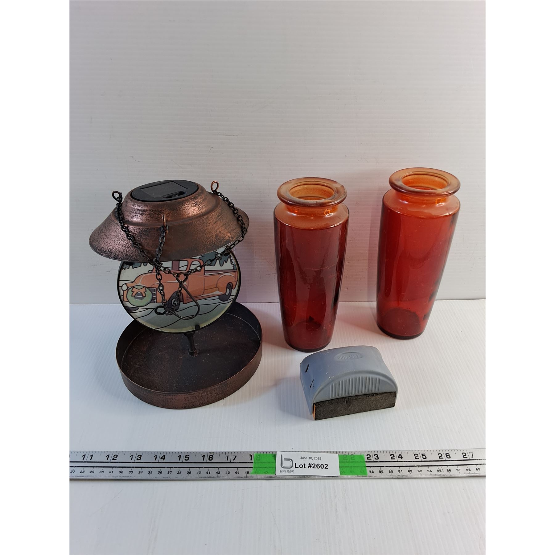 Solar Powered Hanging Decor, (2) Glass Vases and Duramax Sander