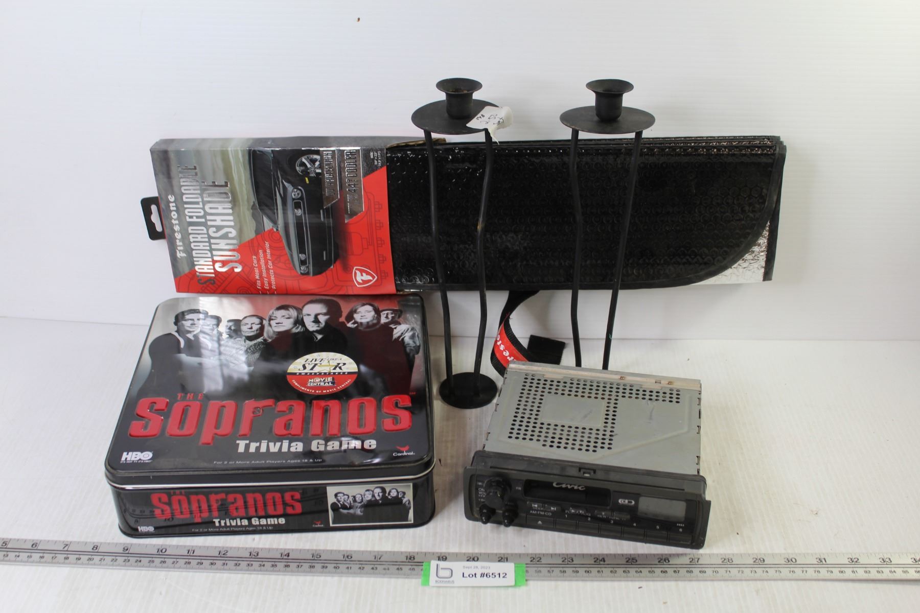 Sopranos Trivia Game - (2) Candle Holders - Civic Car Cassette Player - Firestone Foldable Sun Shade
