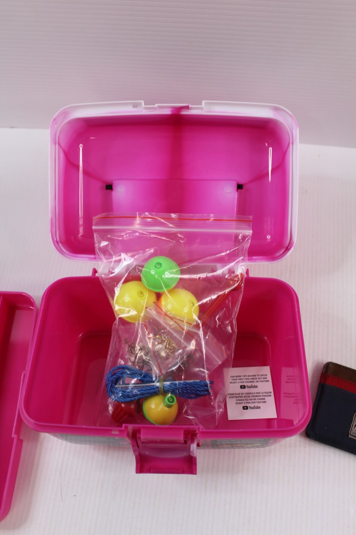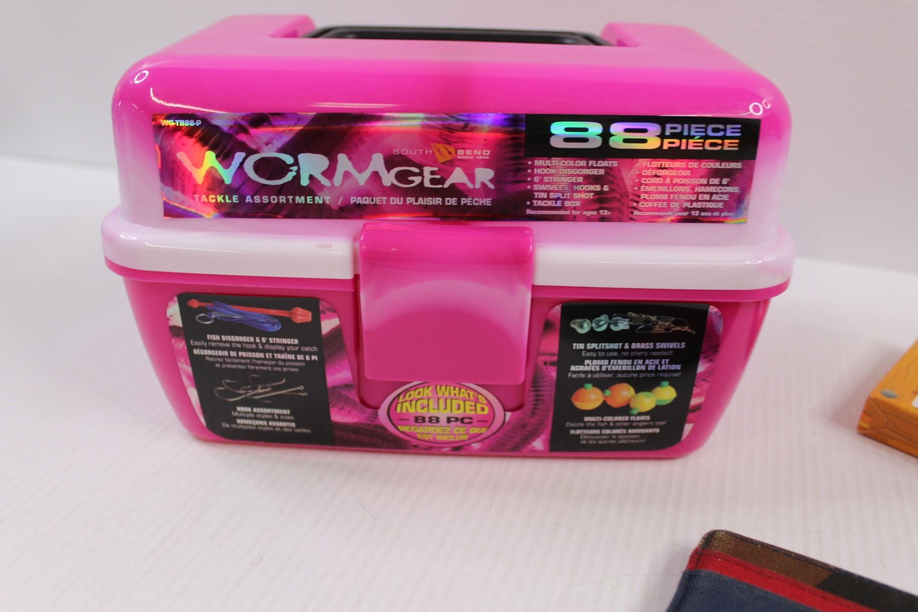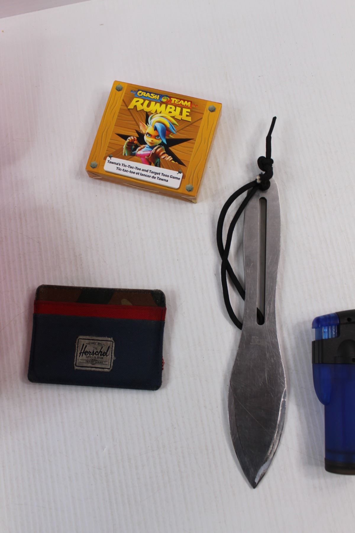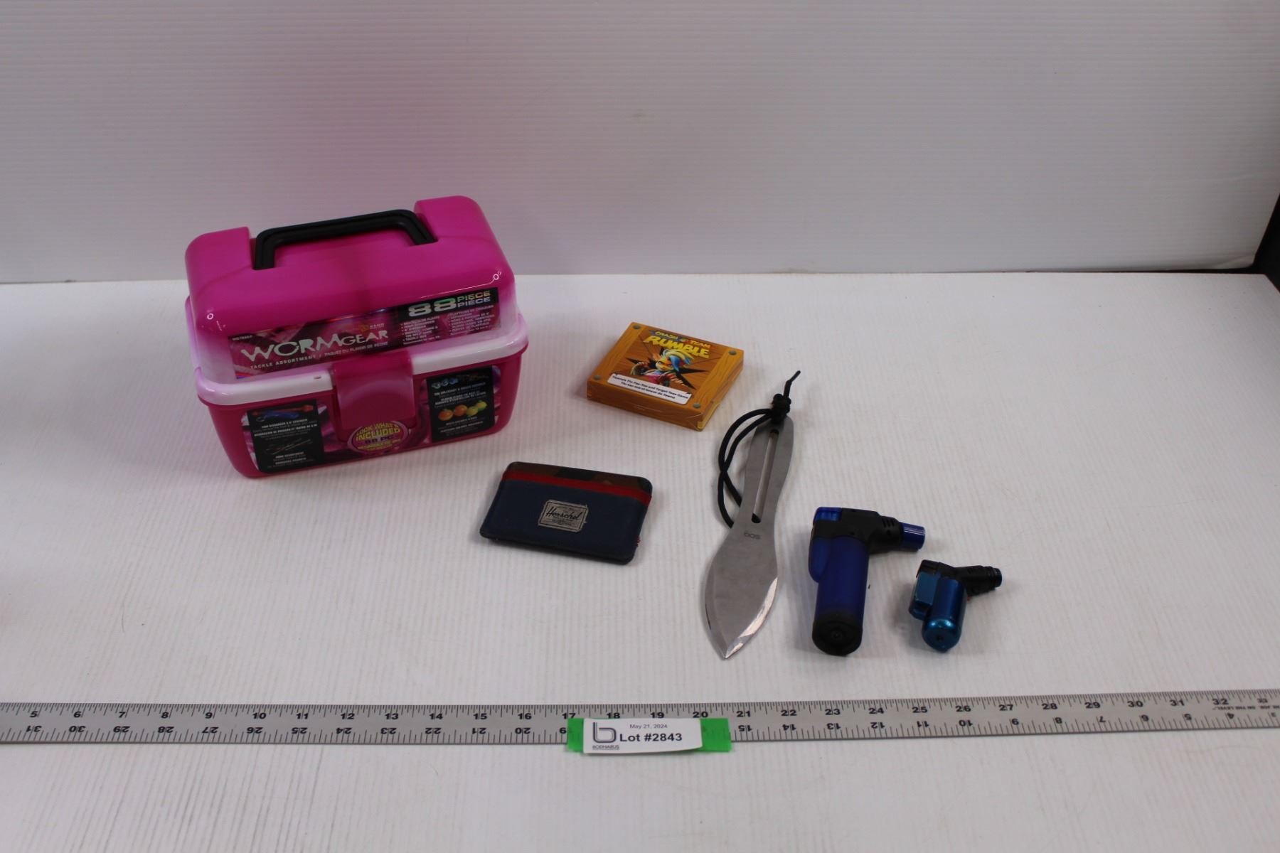 South Bend Worm Gear (88 pc) Kids Tackle Box - Complete, (2) Mini Torches (Untested), SOG "Fling" Throwing Knife, Herschel & McDonalds Happy Meal Toy