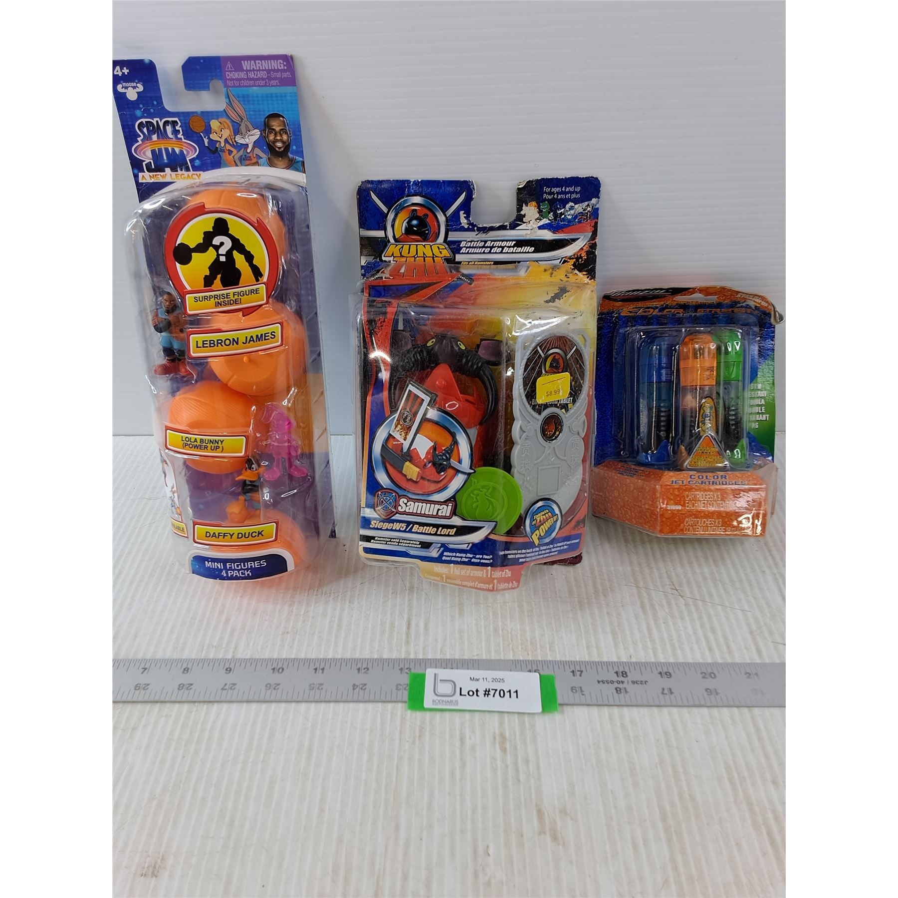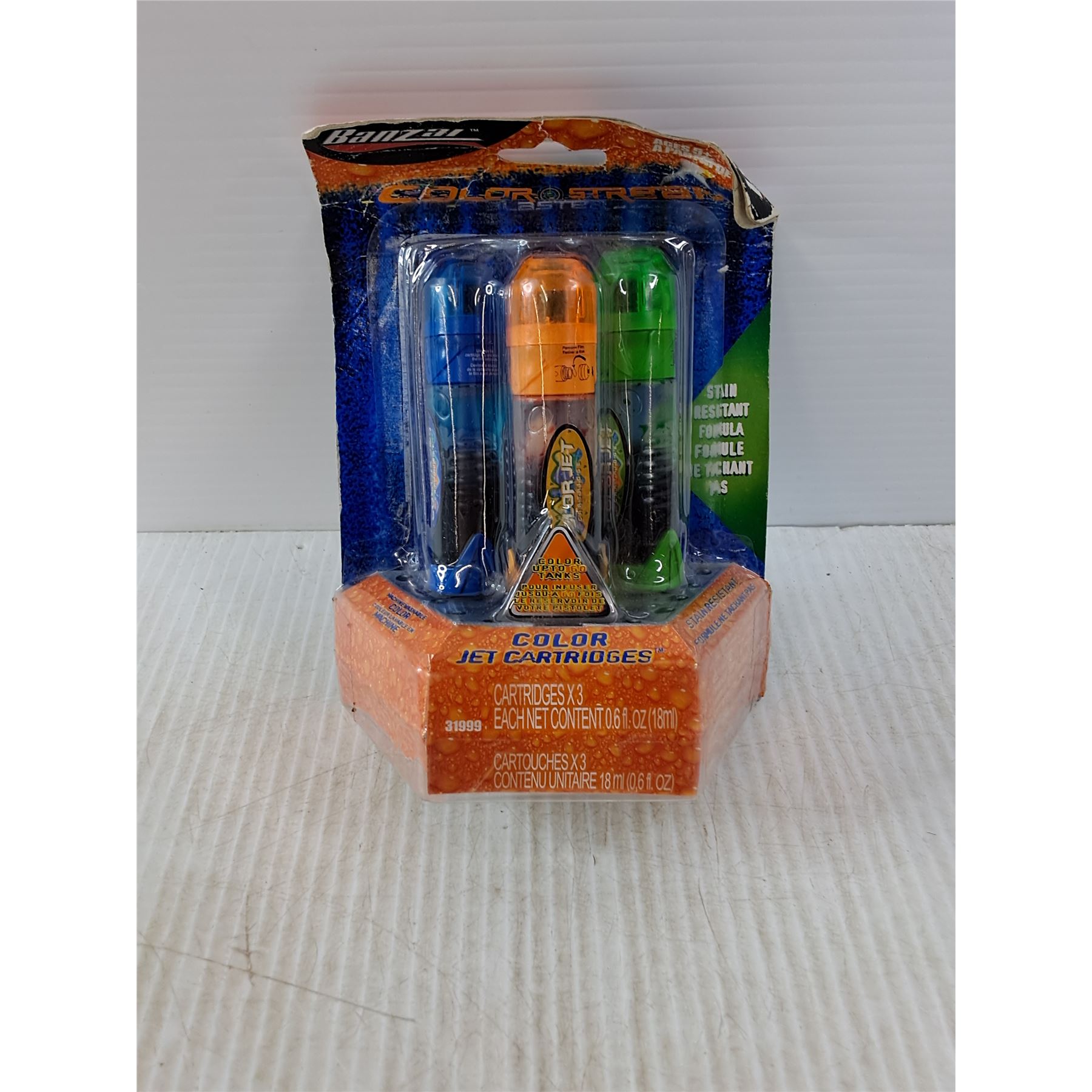 Space Jam Lebron James, Siegew5 battle Lord and Color stream Jet Cartridges. Some of the plastic is open due to glue letting go.