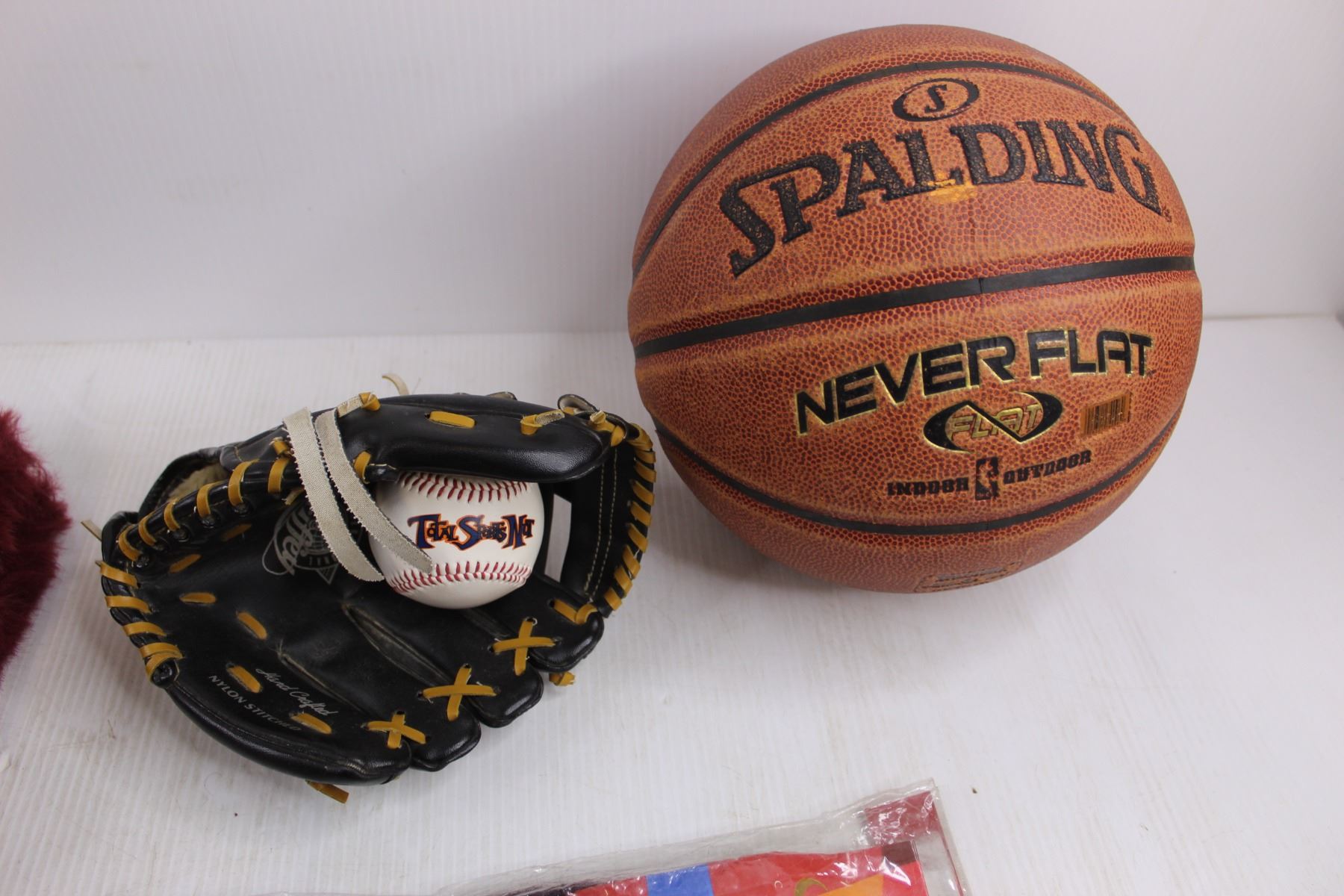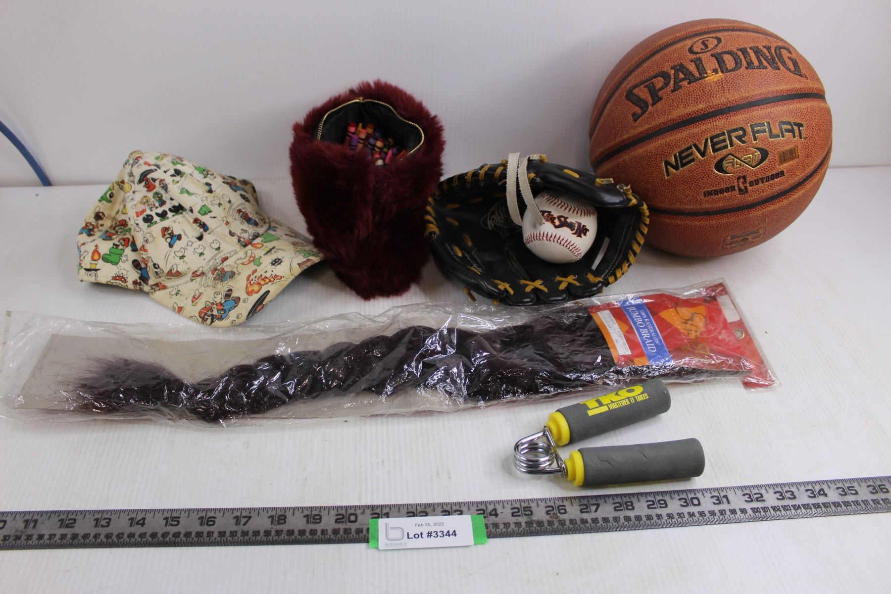 Spalding Basketball, Child's Baseball Glove, Sassy Jumbo Hair Braid - Sealed, Crayons, Misc.