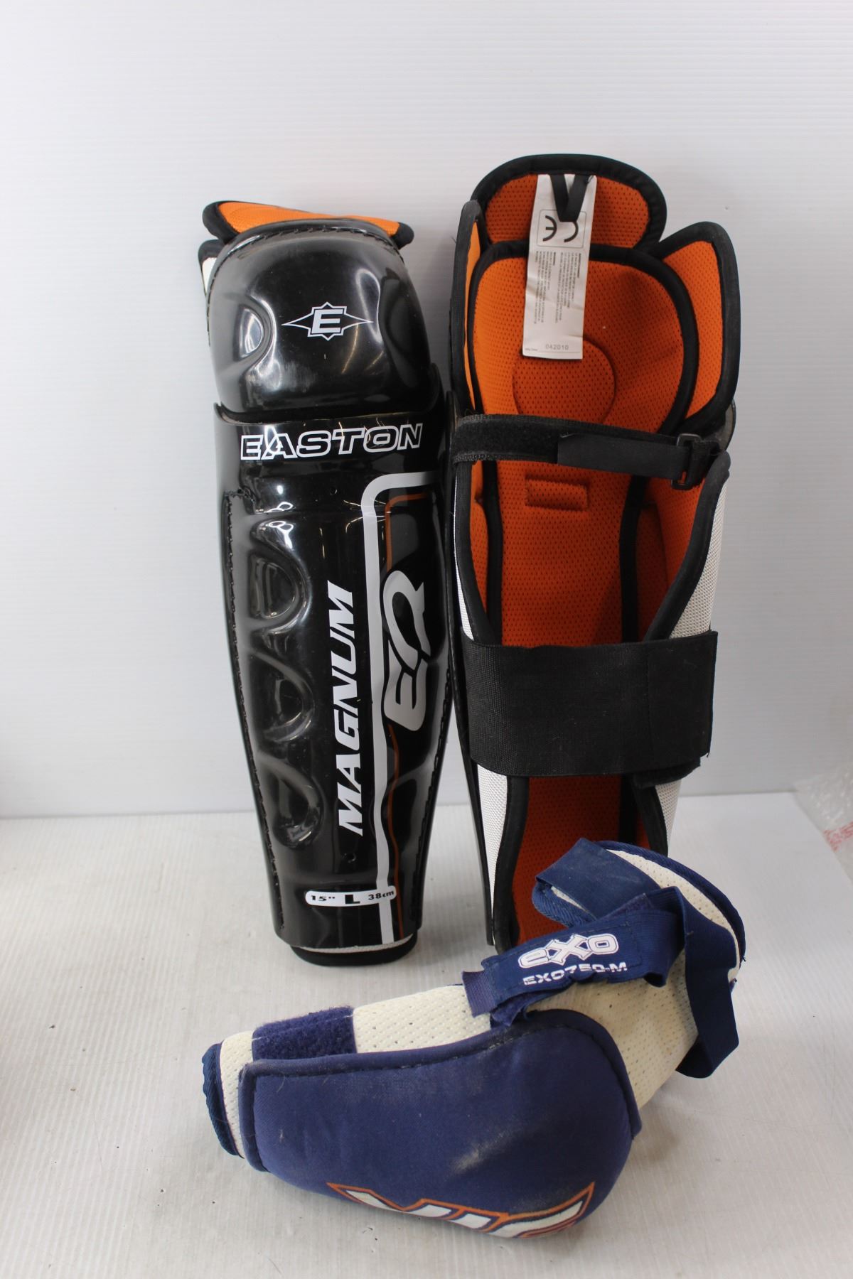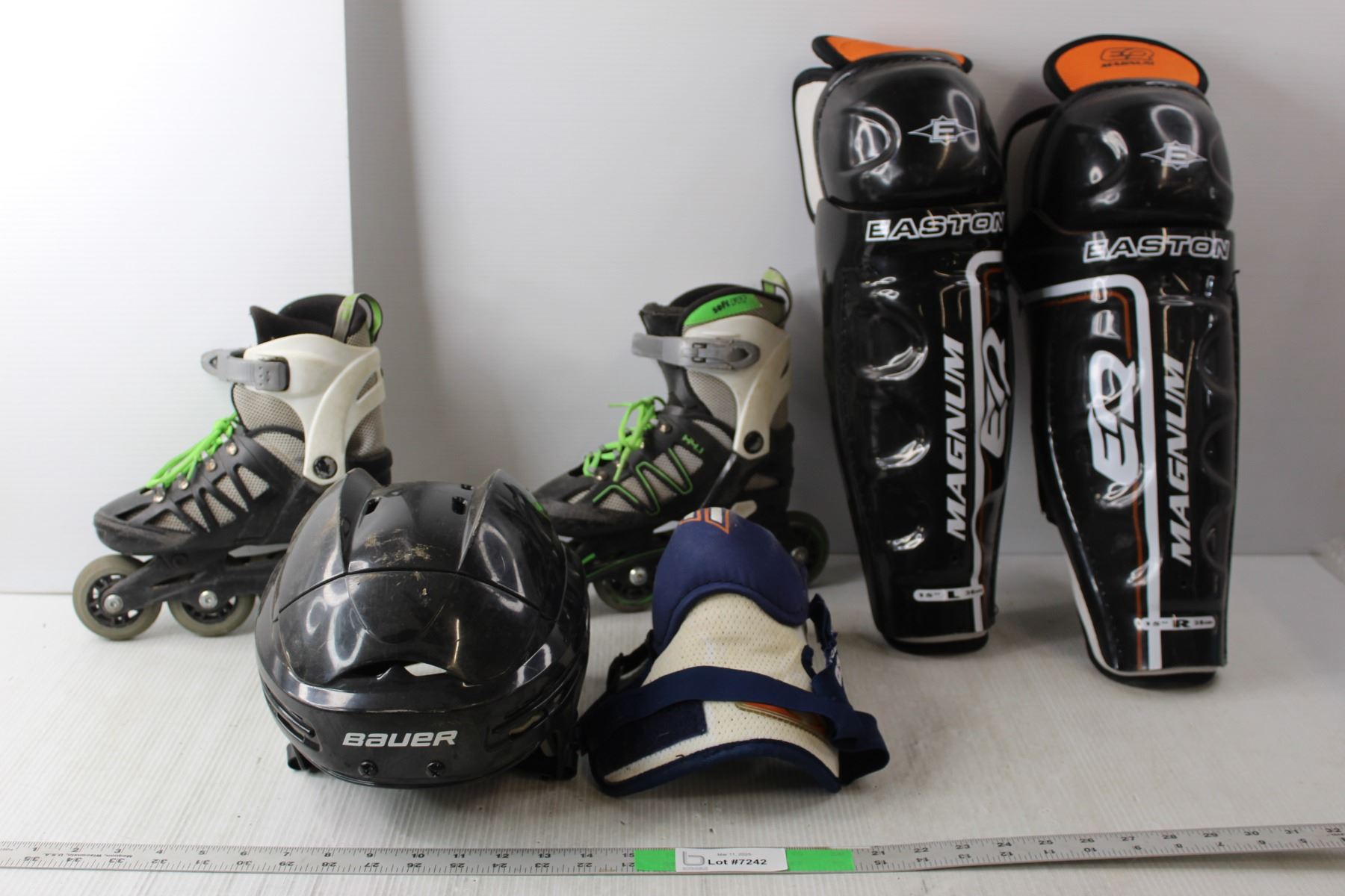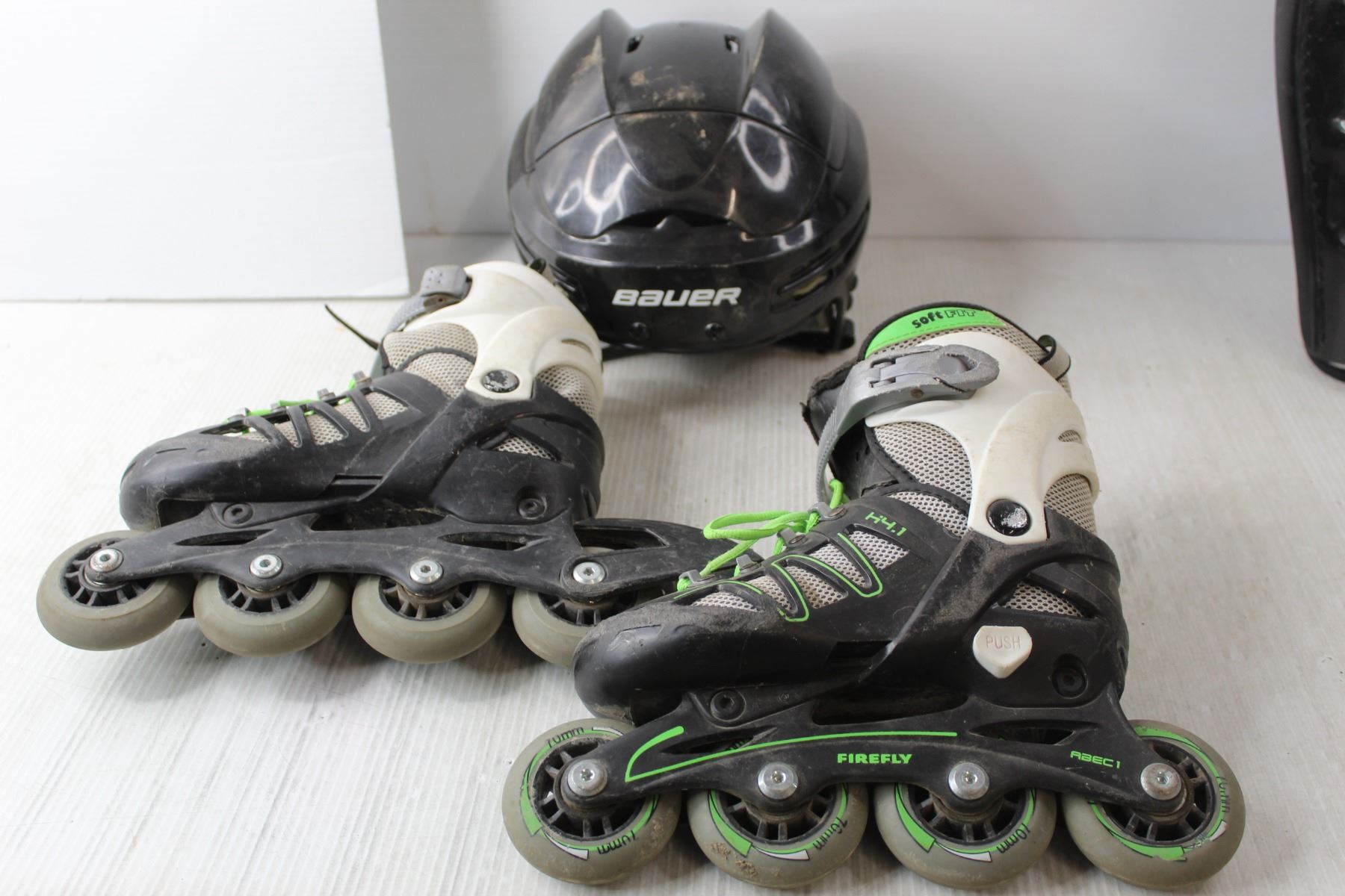 Sports Lot- Easton Shin Guards-L, Bauer Hockey Helmet, Firefly Rollerblades 12-1.5