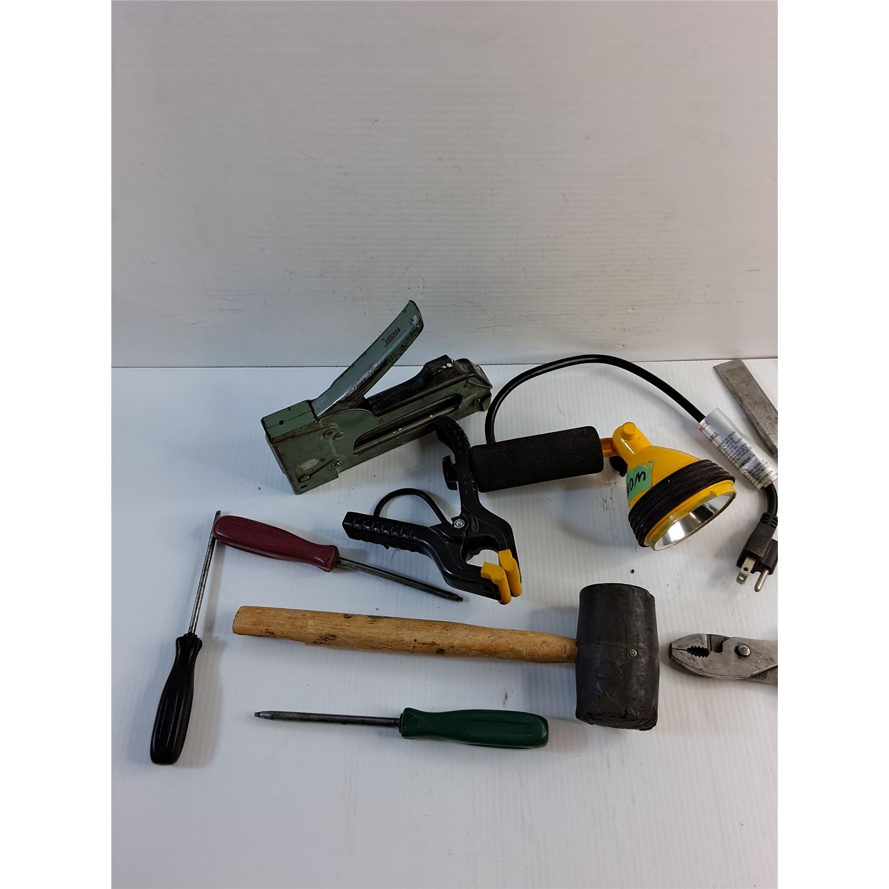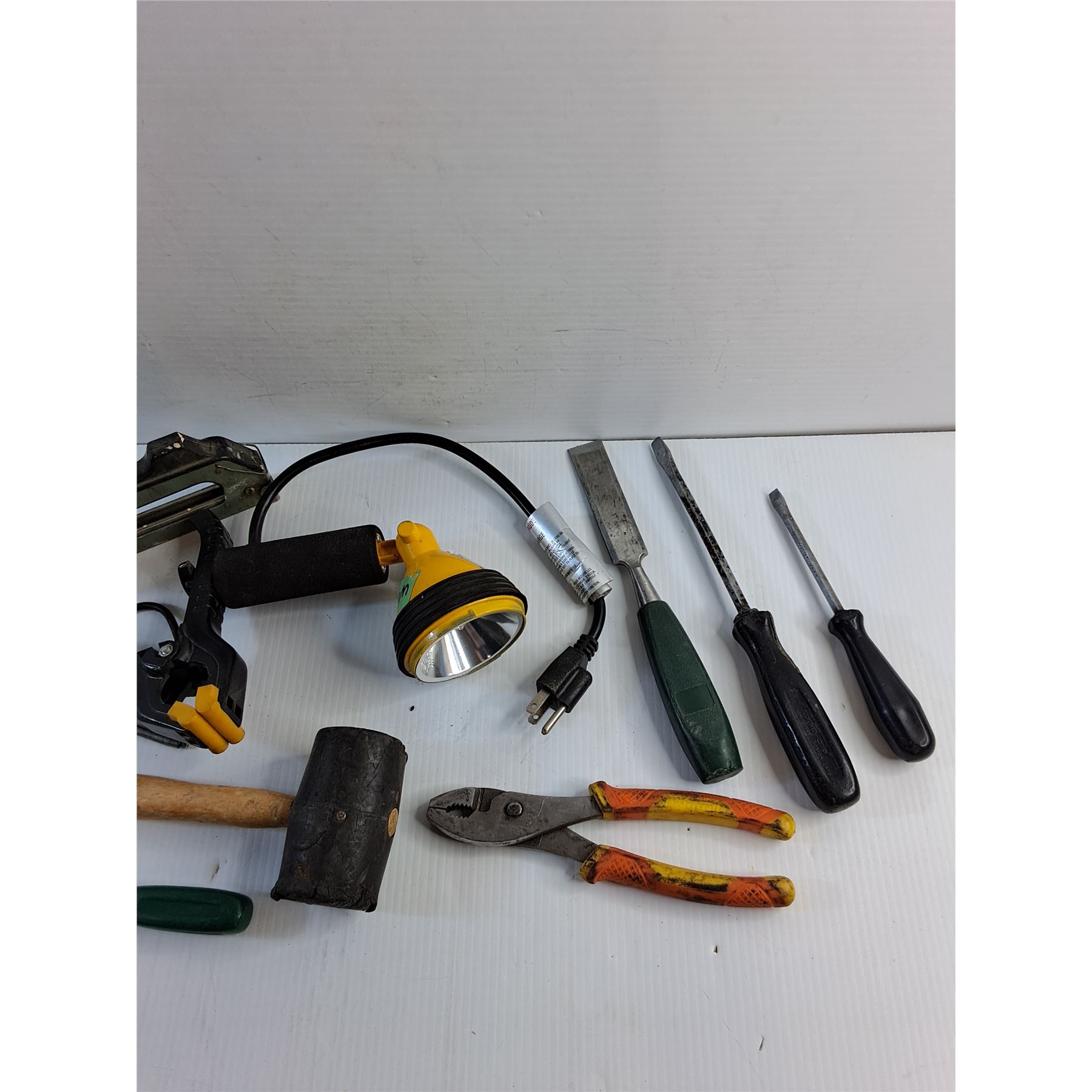 Stapler, Screwdrivers, Rubber Hammer, Pliers, Chisel and Clip On Flashlight