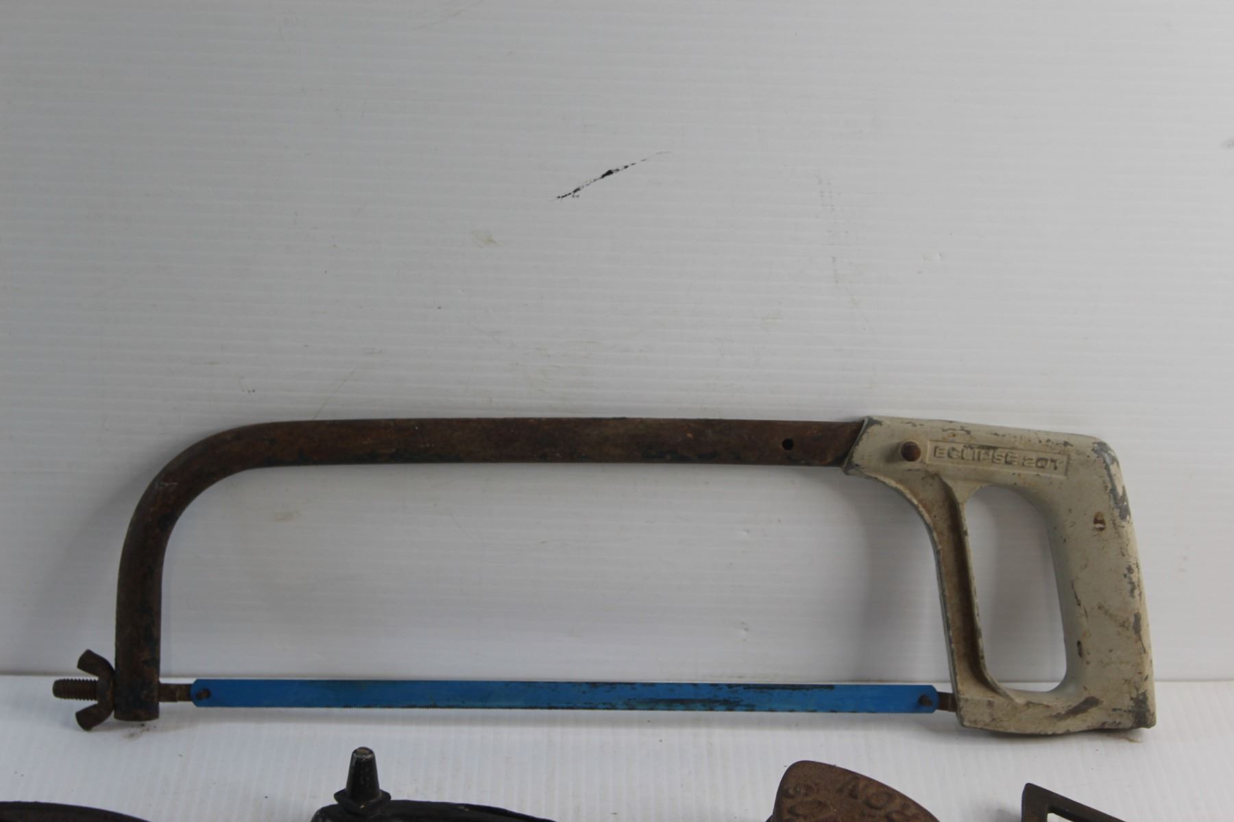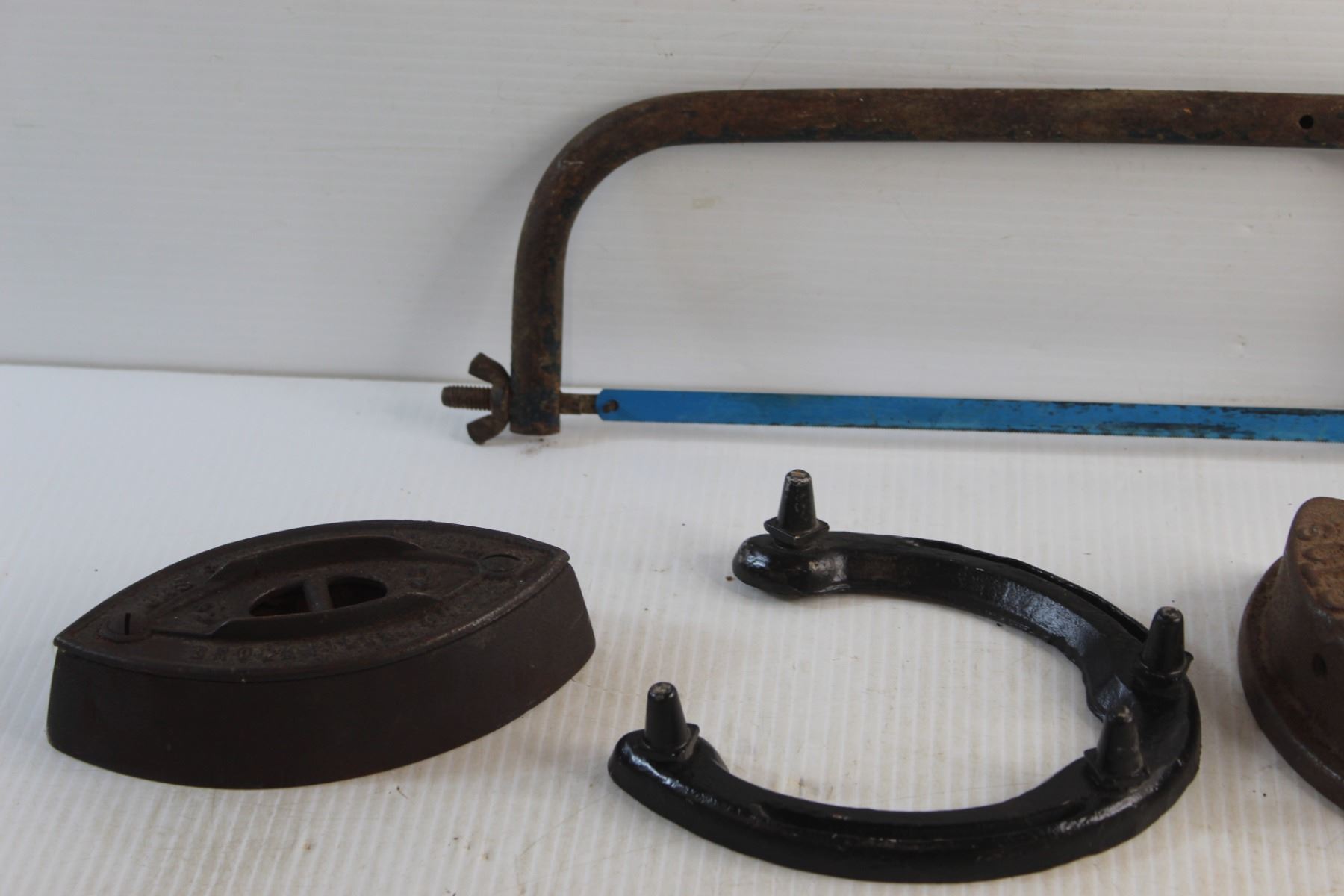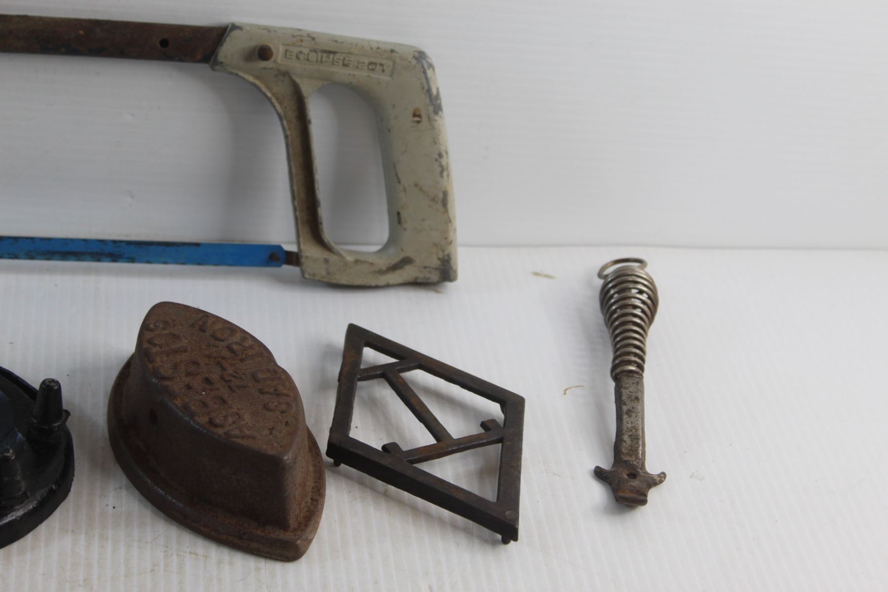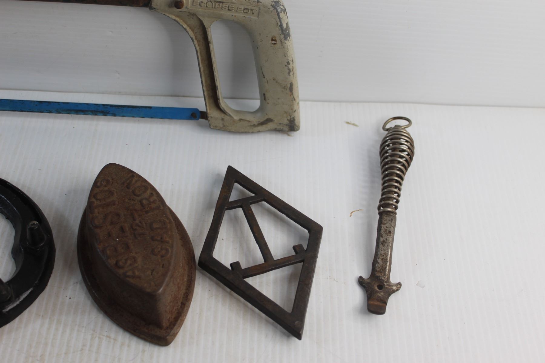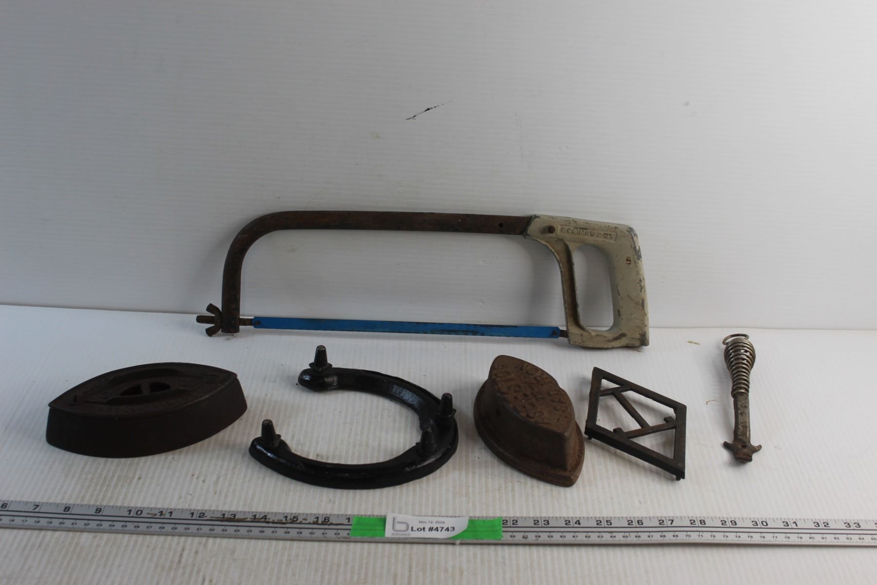 Stove Lifter, Vintage Sad Iron, Horse Shoe, Hack Saw and a Trivet