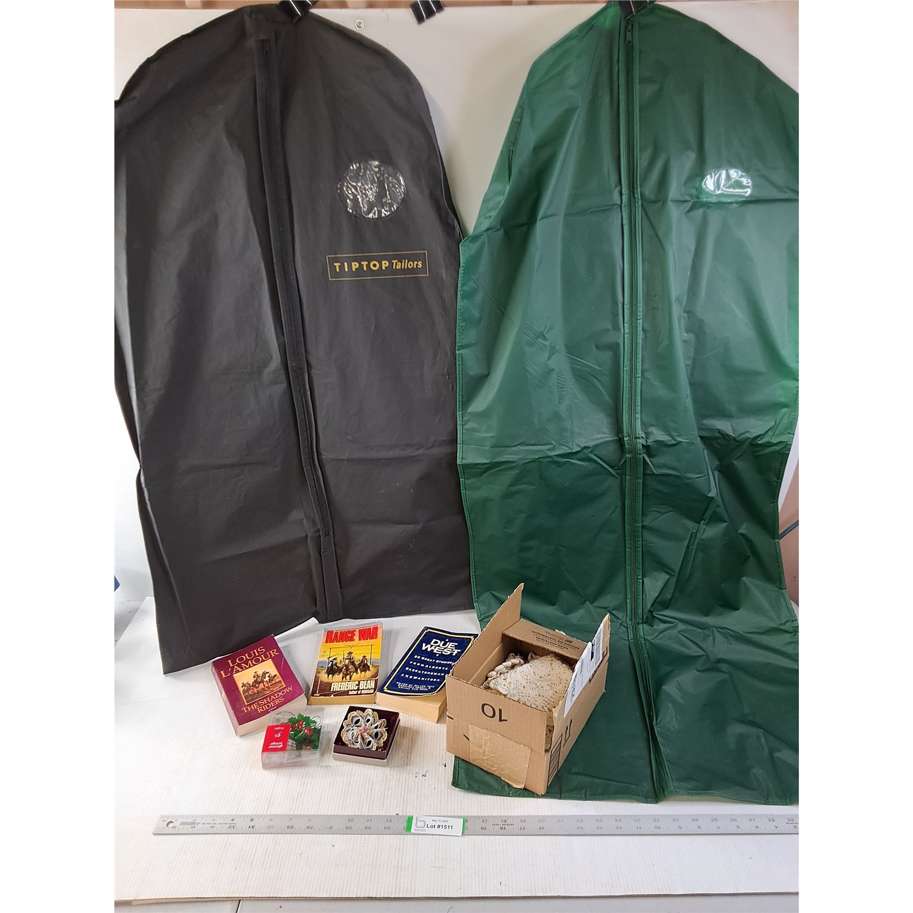 Suit and Dress Cover, (3) Books and a Box of Doilies