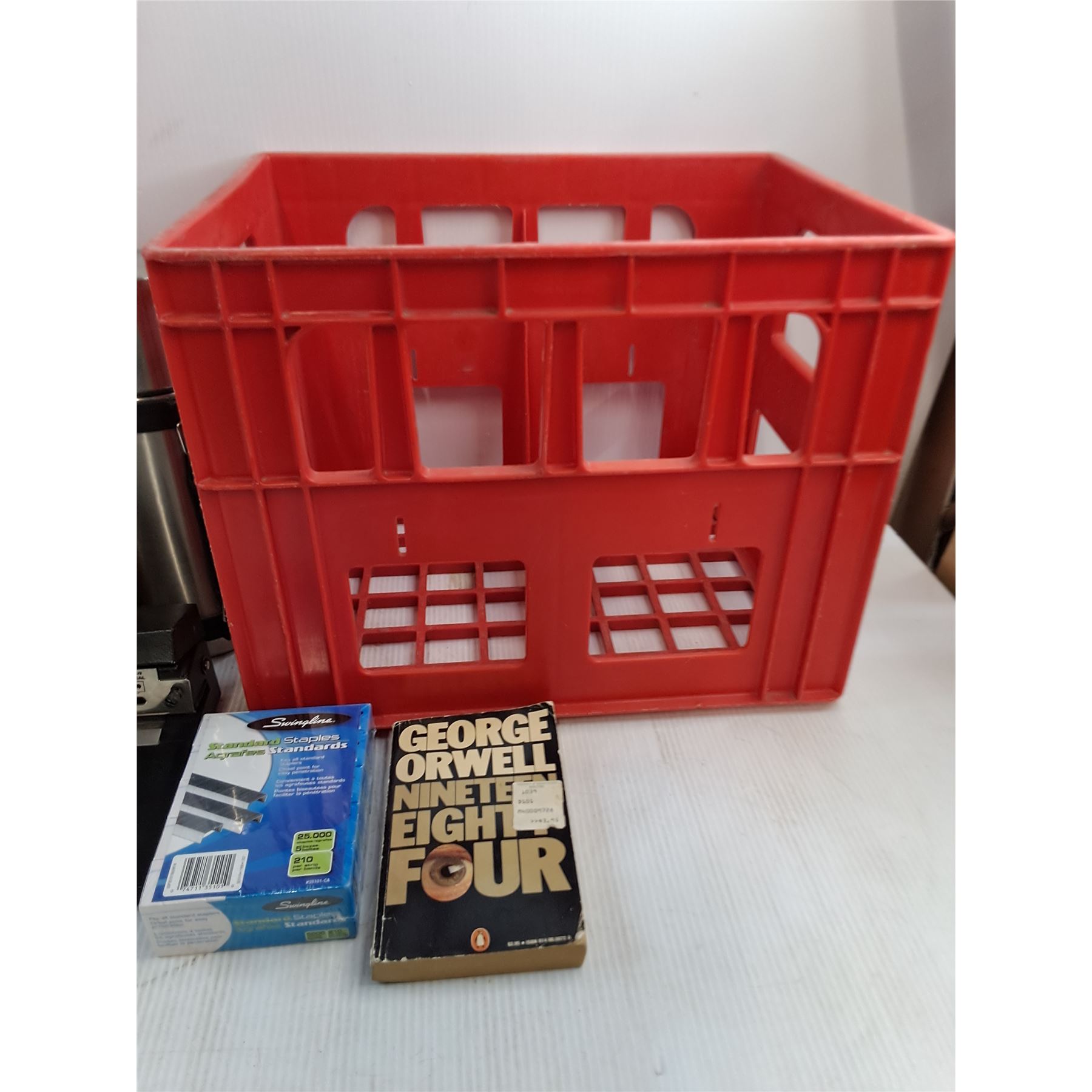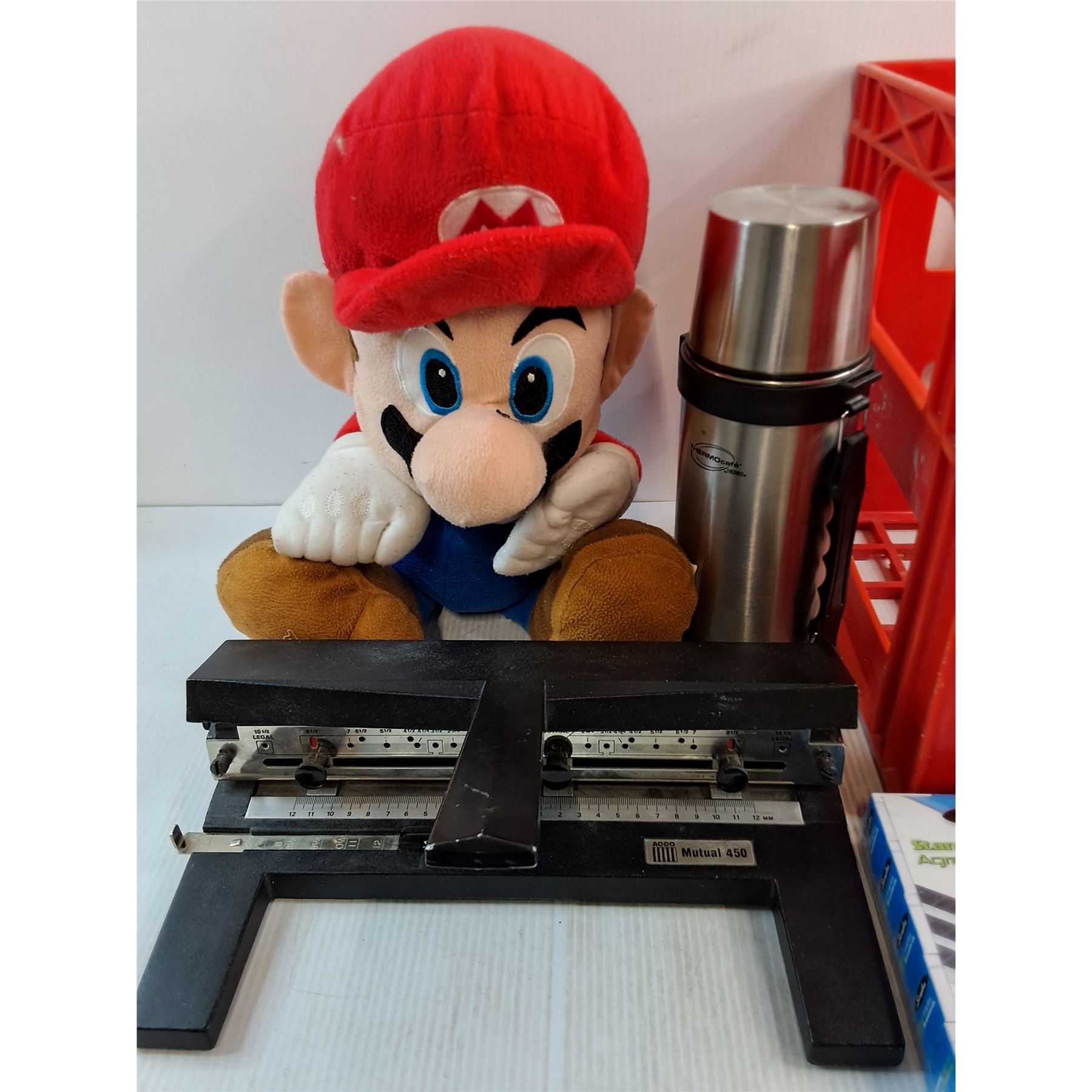 Super Mario Stuffy, Thermos, 3-Hole Punch, Sealed Box Staples, Orwell Novel, Plastic Carton