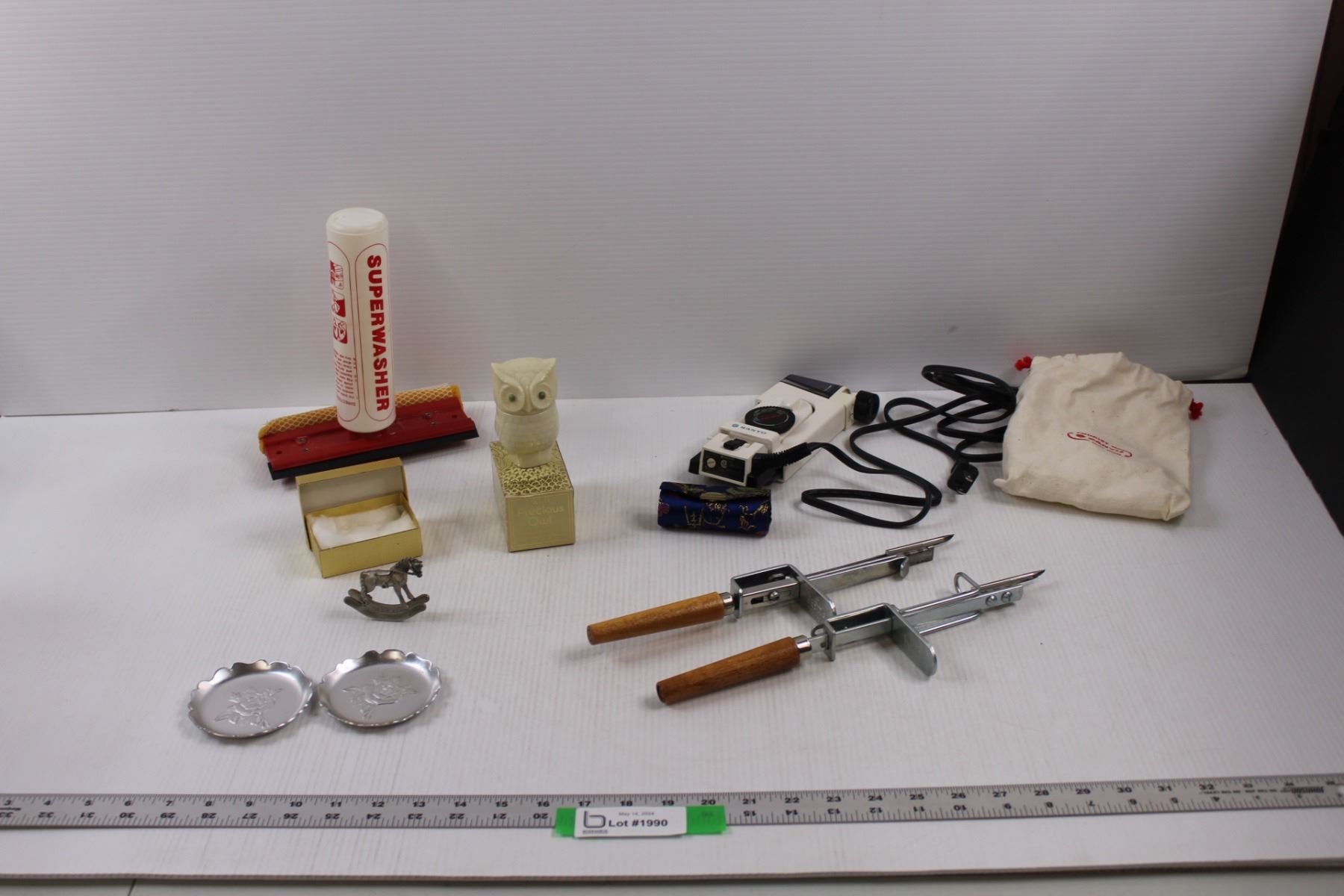 Superwasher Squeegee, Sanyo Mini Travel Iron, (2) Phentex Carpet Tufting Hand Tools, (2) Tin Coasters, Pewter Rocking Horse Decor., Avon Precious Owl Cream Container w/Box