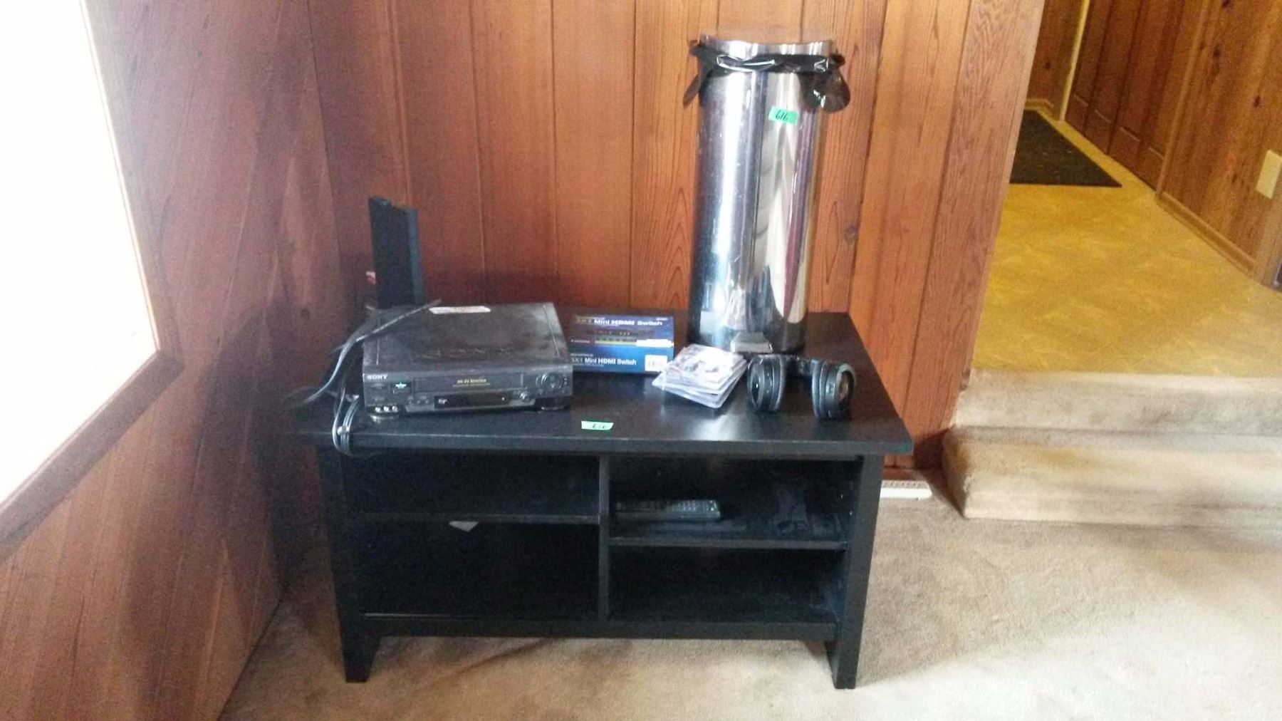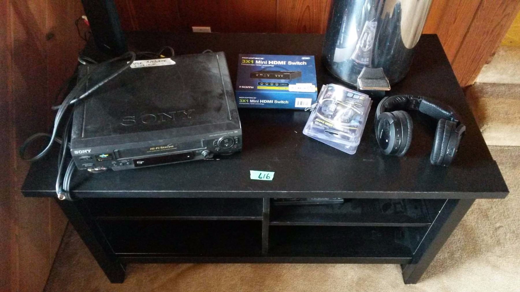 TV Stand, VCR, Garbage Can, HDMI Switch, Headphones