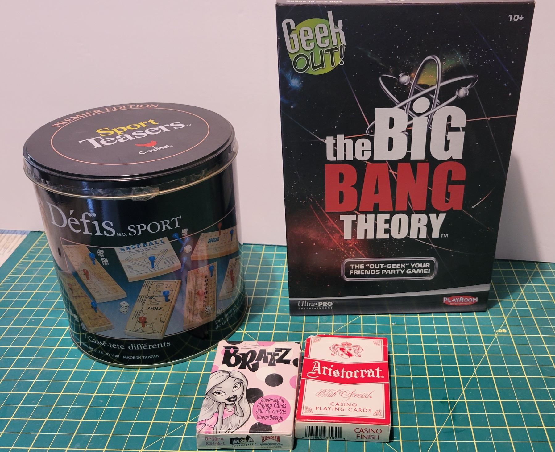 2 decks of cards, Sport Teasers wood game (all new) in tin, and Big Bang Theory Game, open but never used.