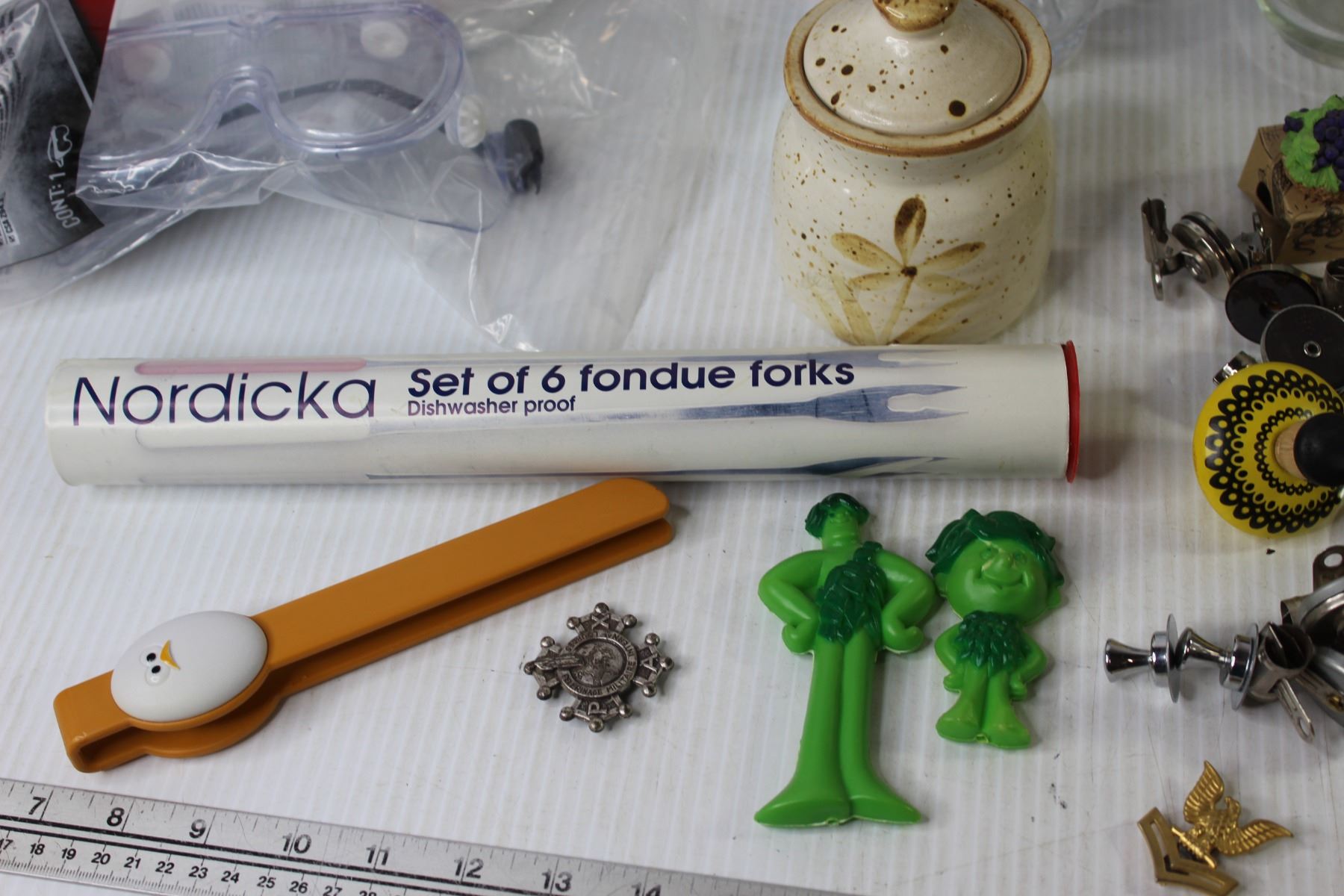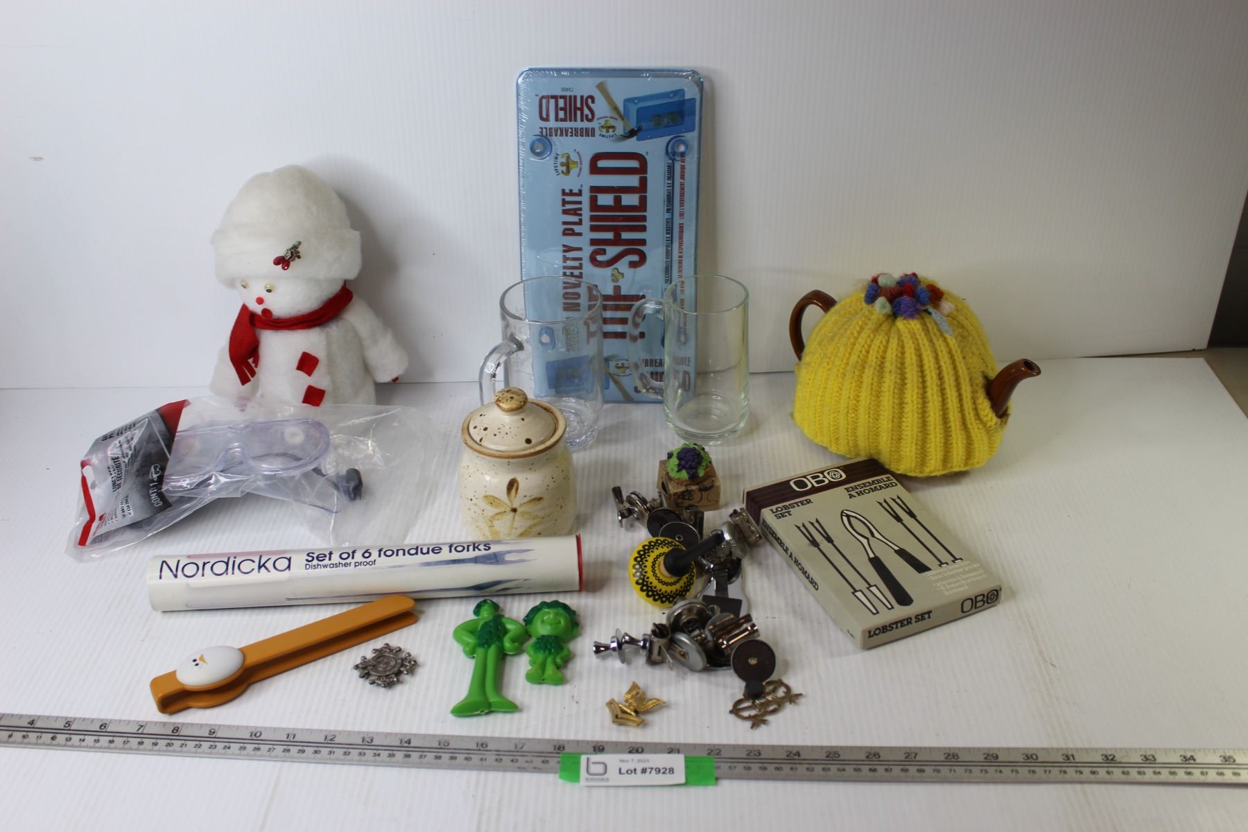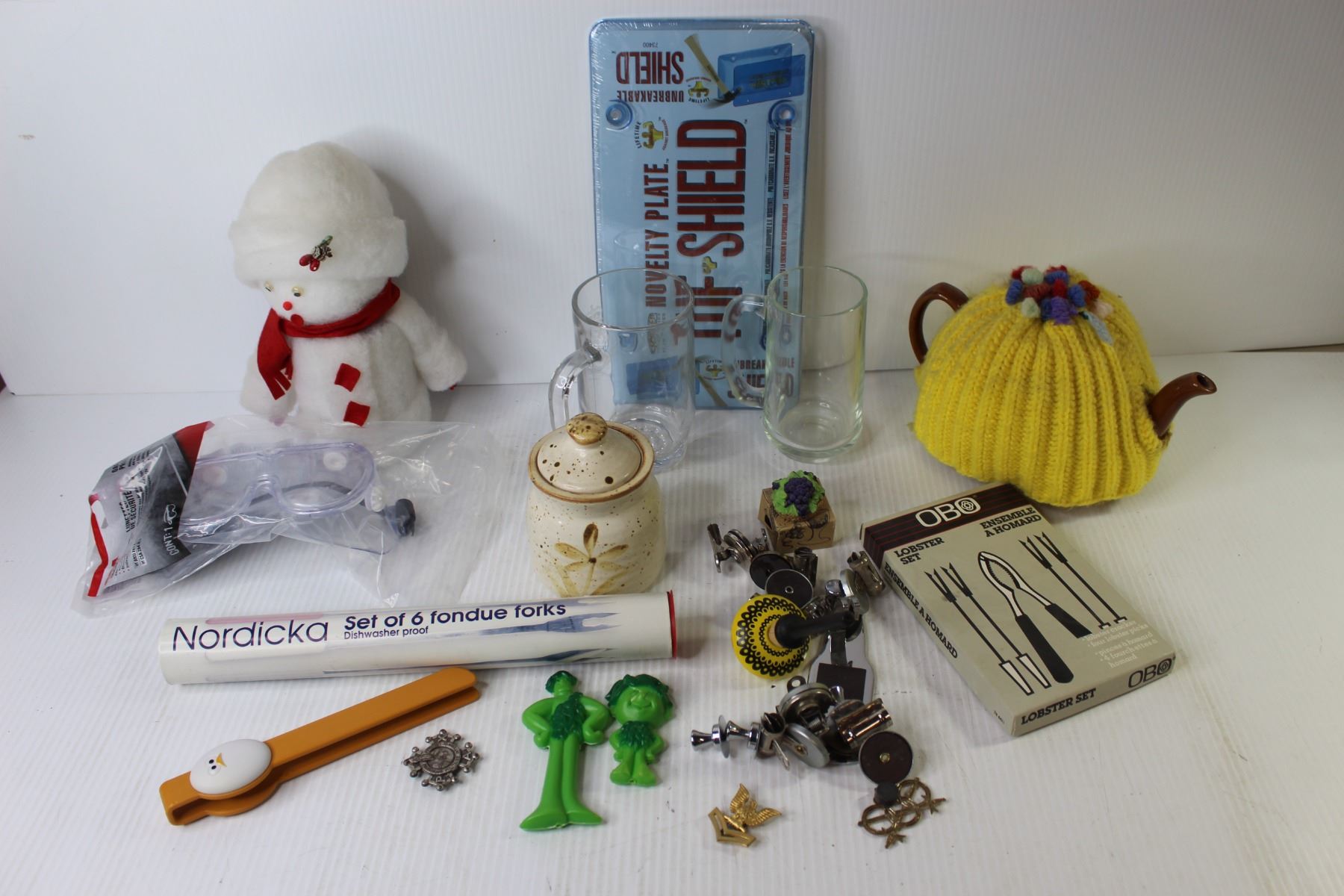 Tea Pot w/Cozy - Lobster Set - Snowman - Safety Goggles - Assorted Magnets - Fondue Forks - Glasses - Misc. Items