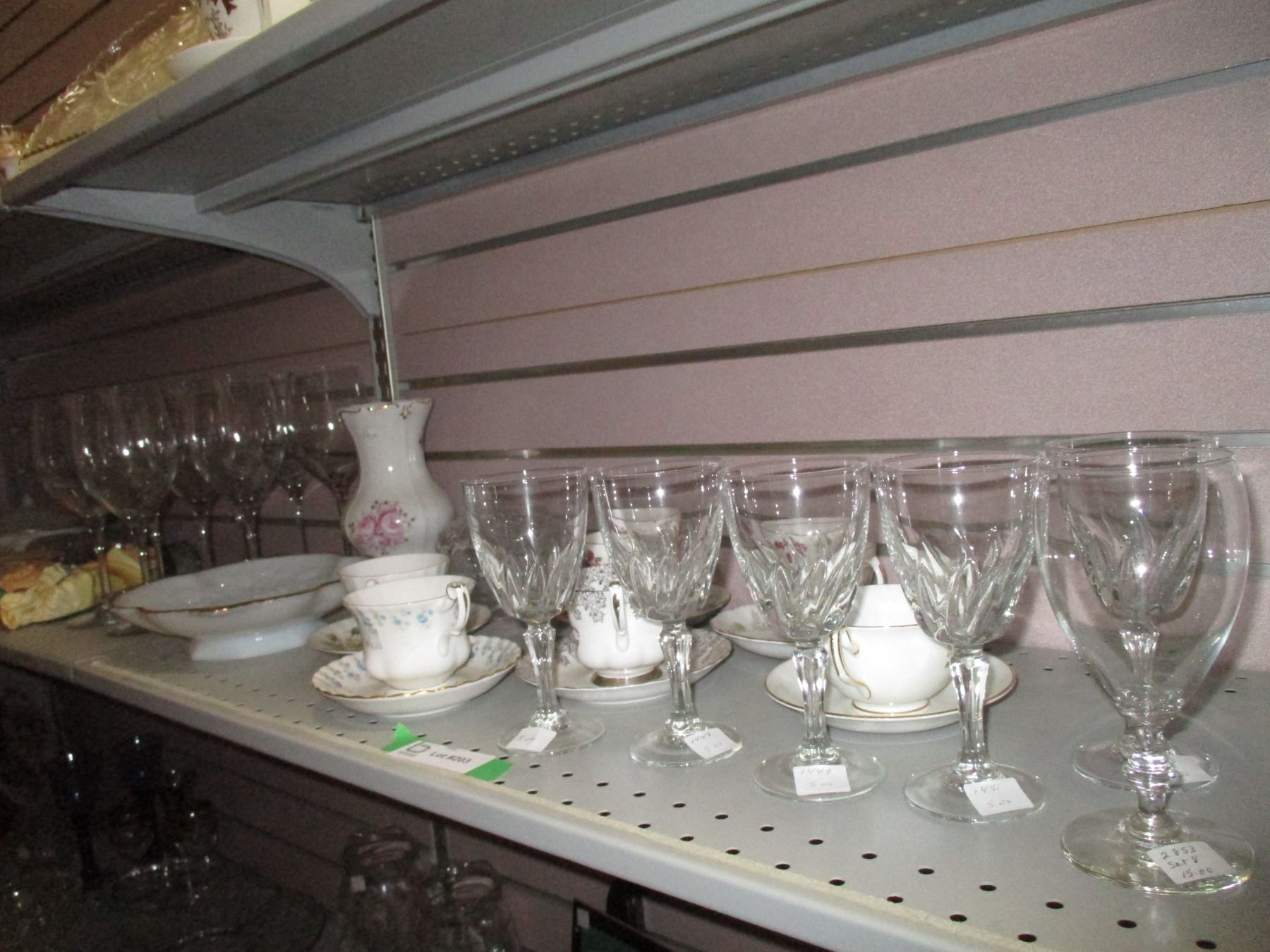 Teacup & saucer sets + wine glasses, chalkware, cream & sugar, glassware