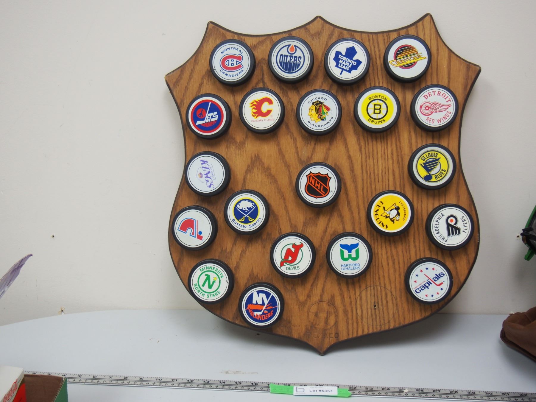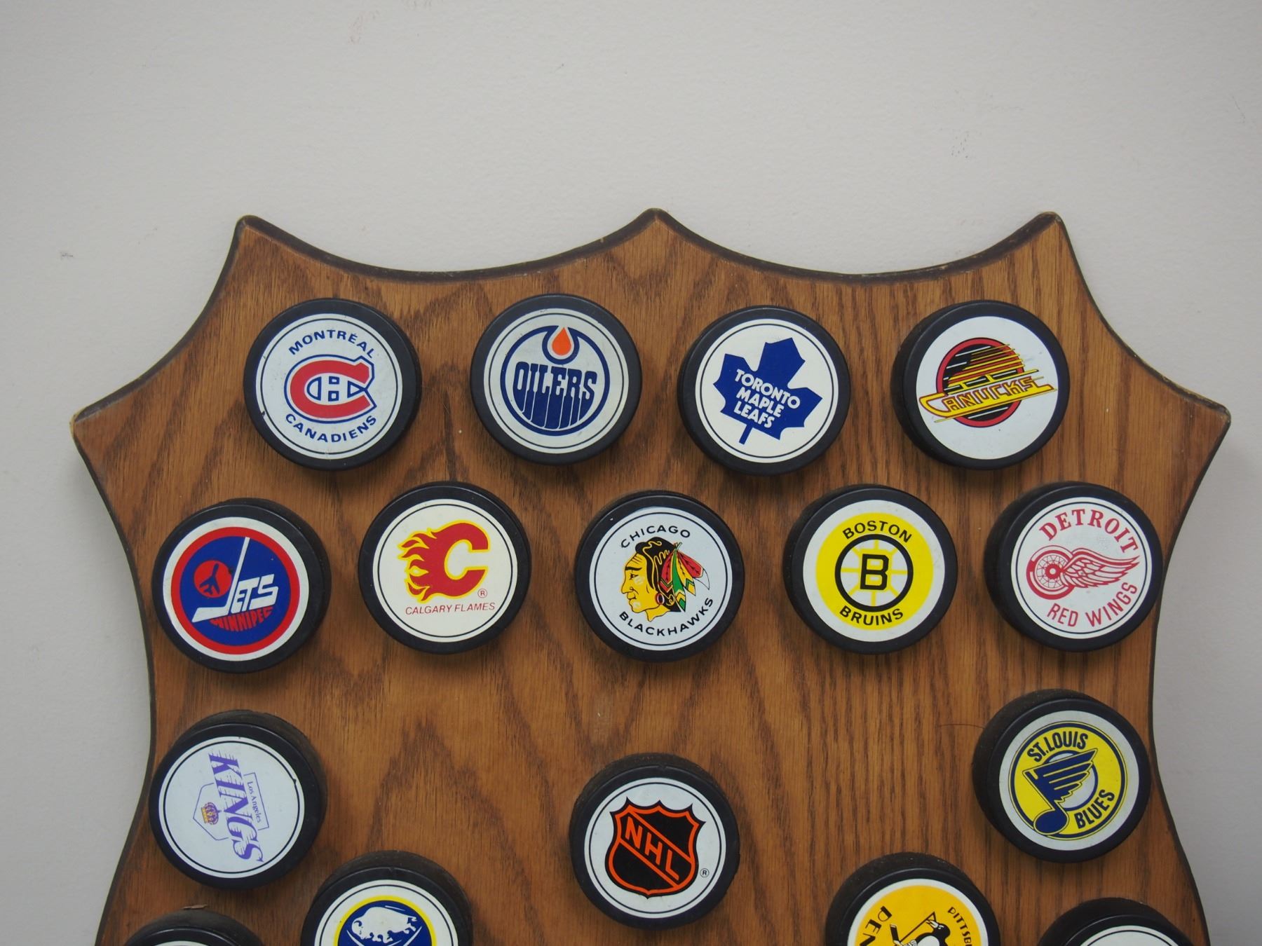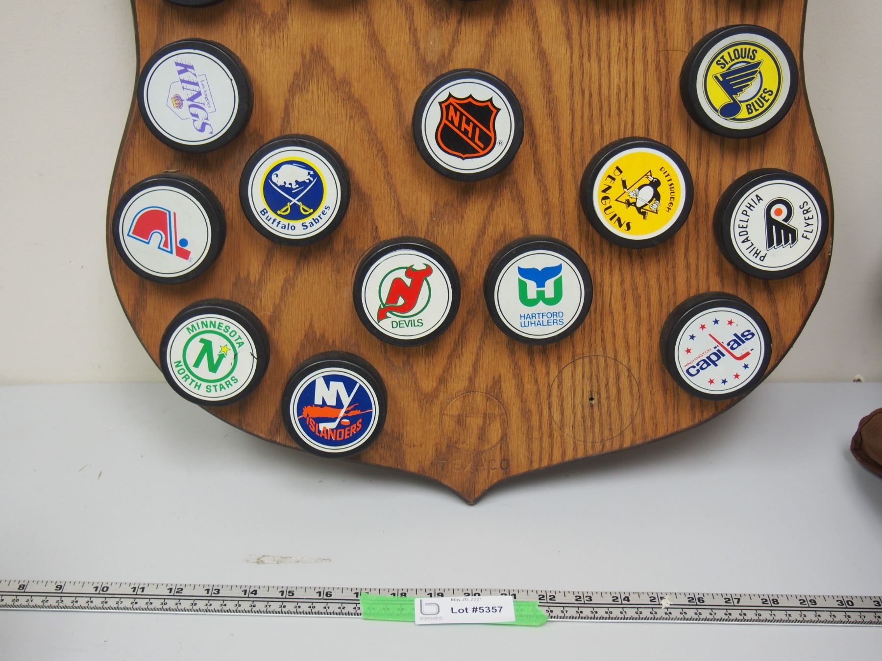 Texaco 1979-1980 NHL Collectible Hockey Pucks on Wooden Plaque Missing 1 Puck NY Rangers