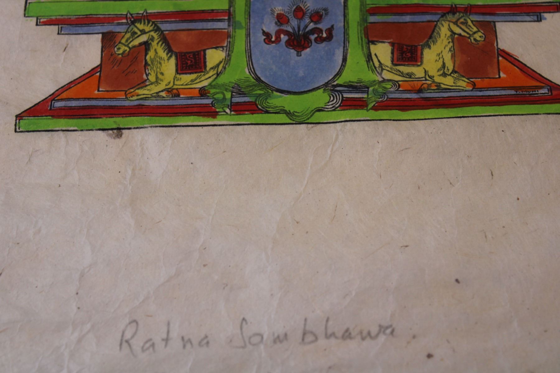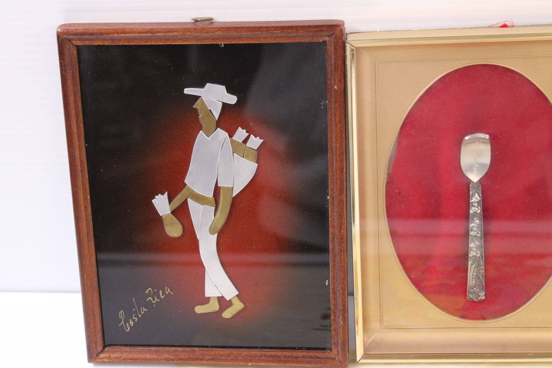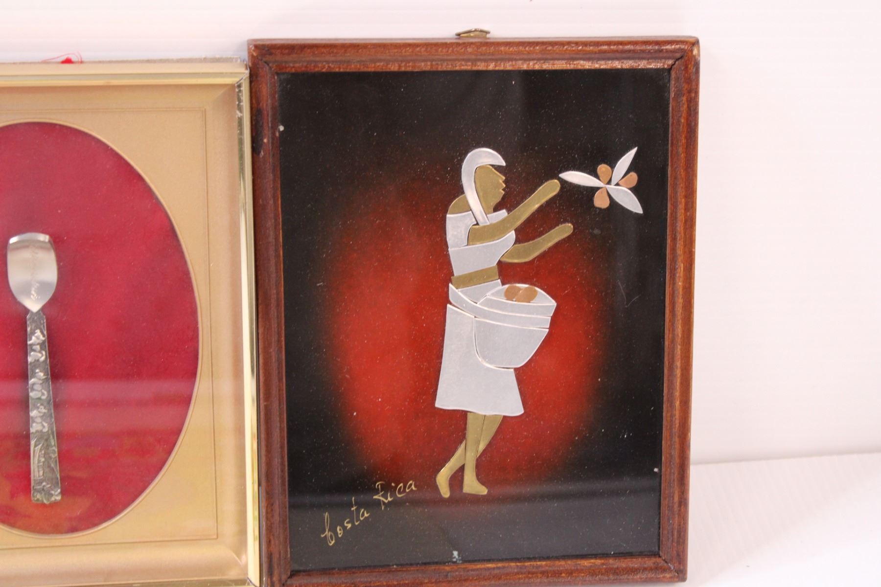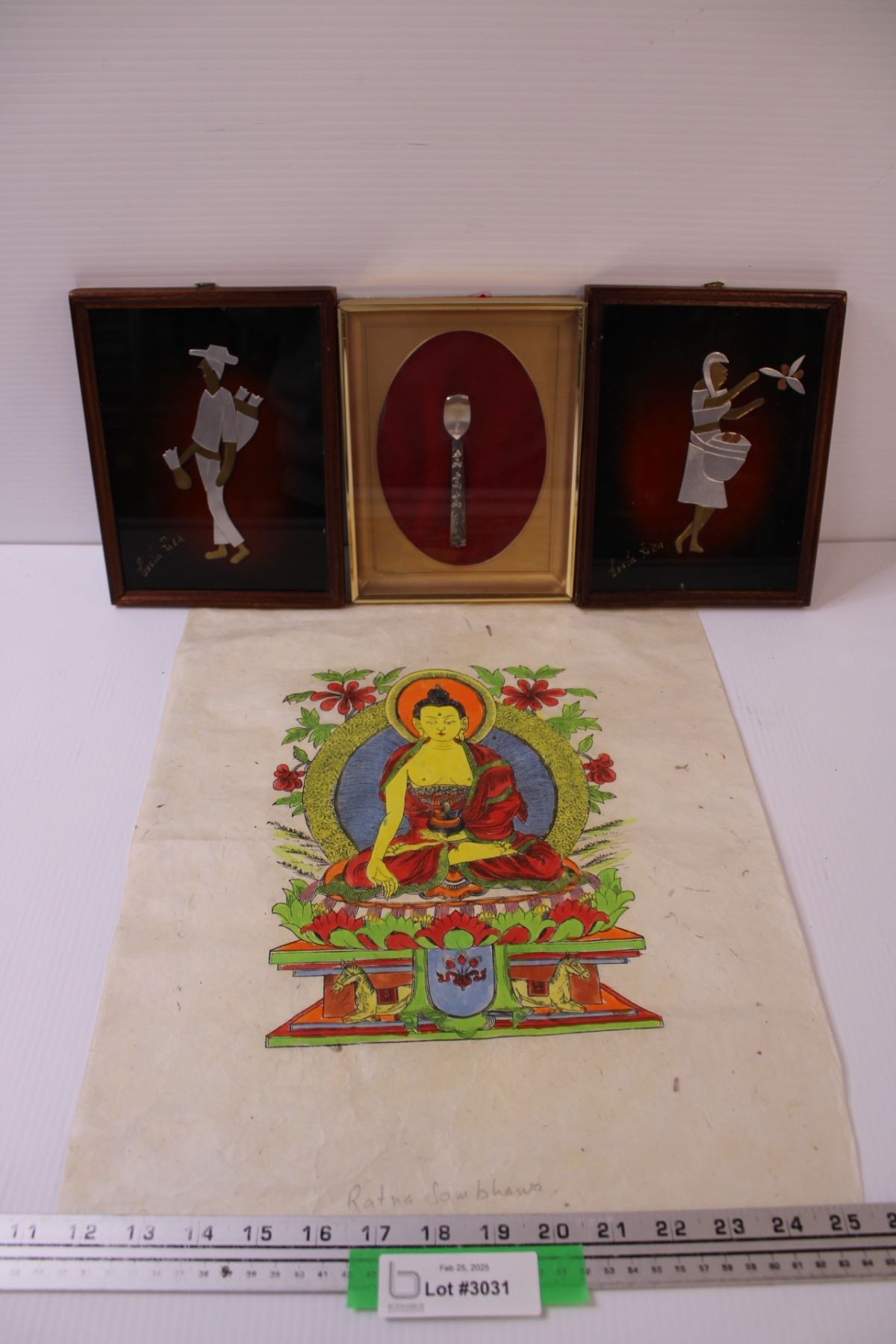 Tibetan Buddhist Art - 14" x 18", (2) Metal & Glass Art Villagers Pictures - 7" x 9", Tuktoyaktuk Souvenir Spoon in Frame - 7" x 9"