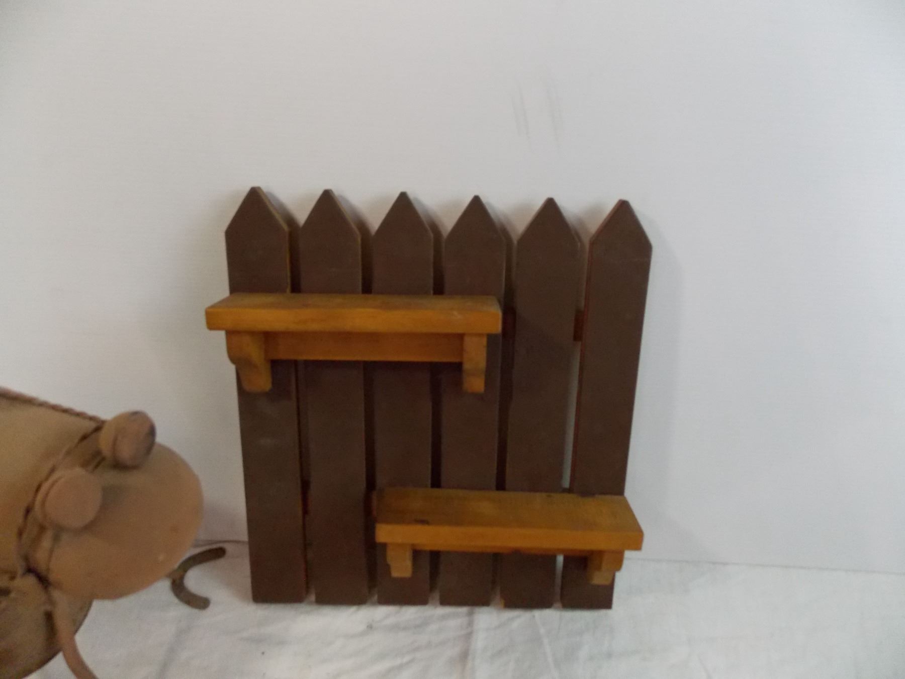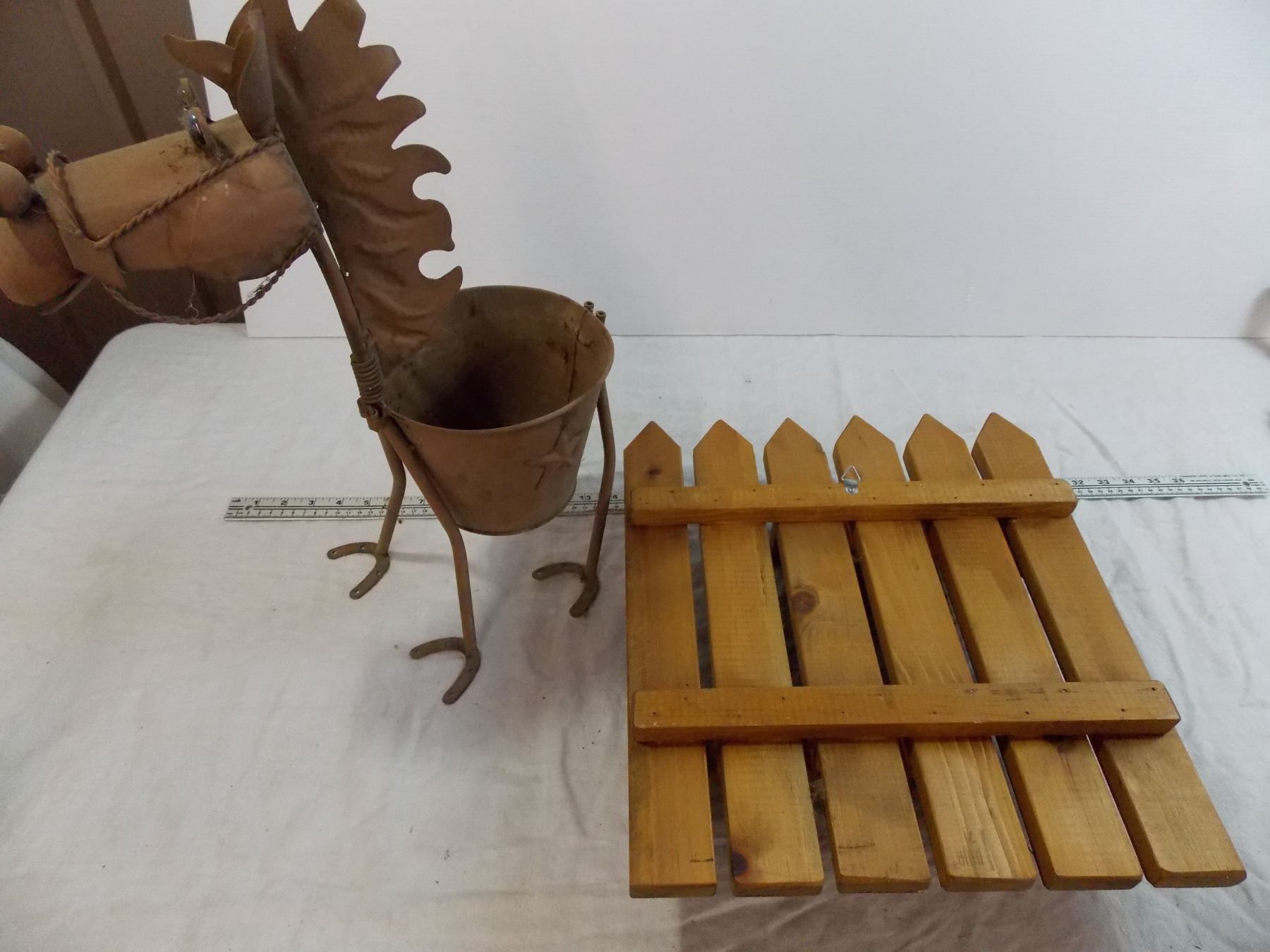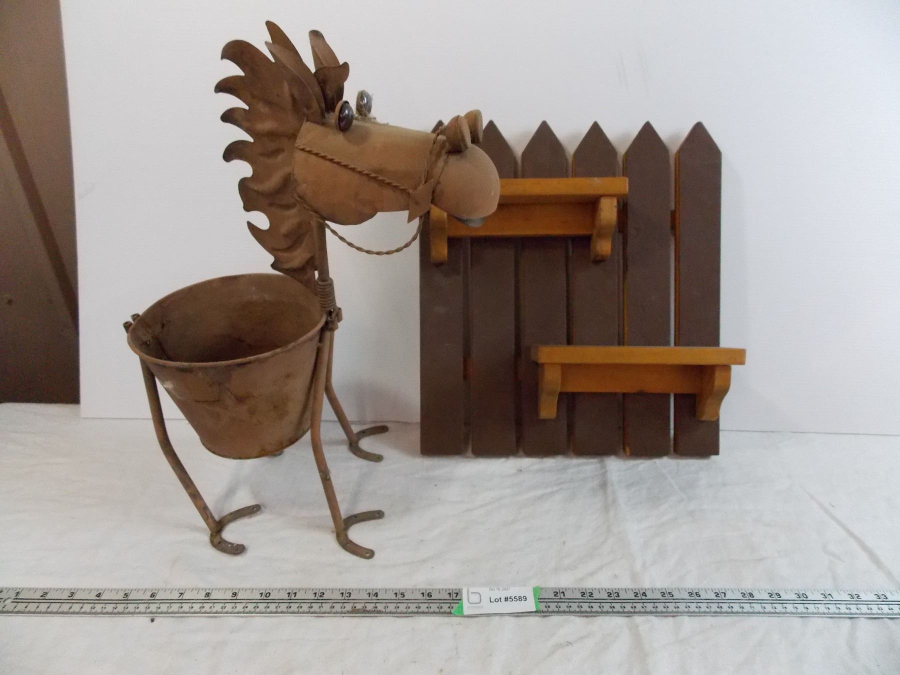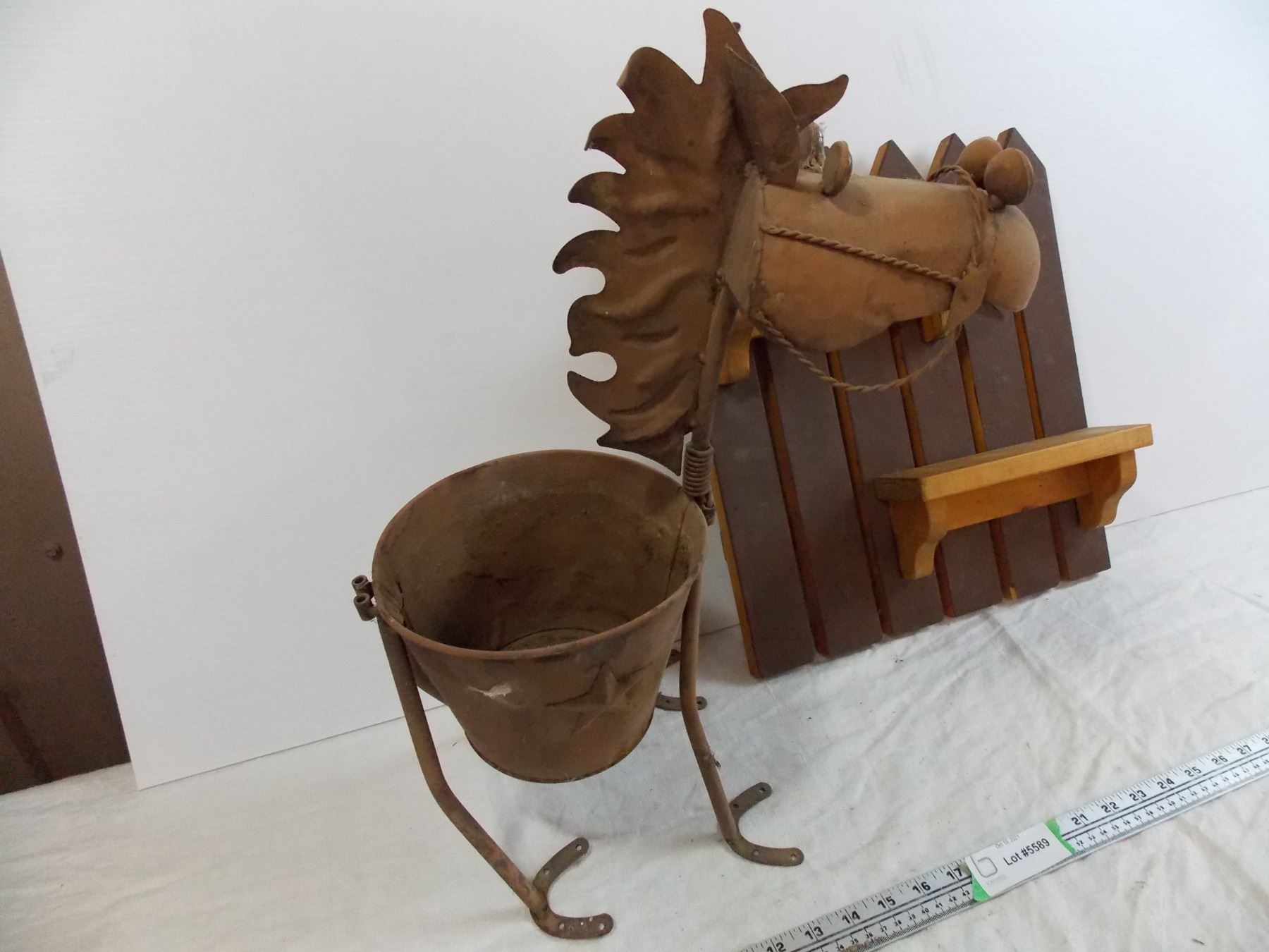 Tin horse planter + small wooden shelf