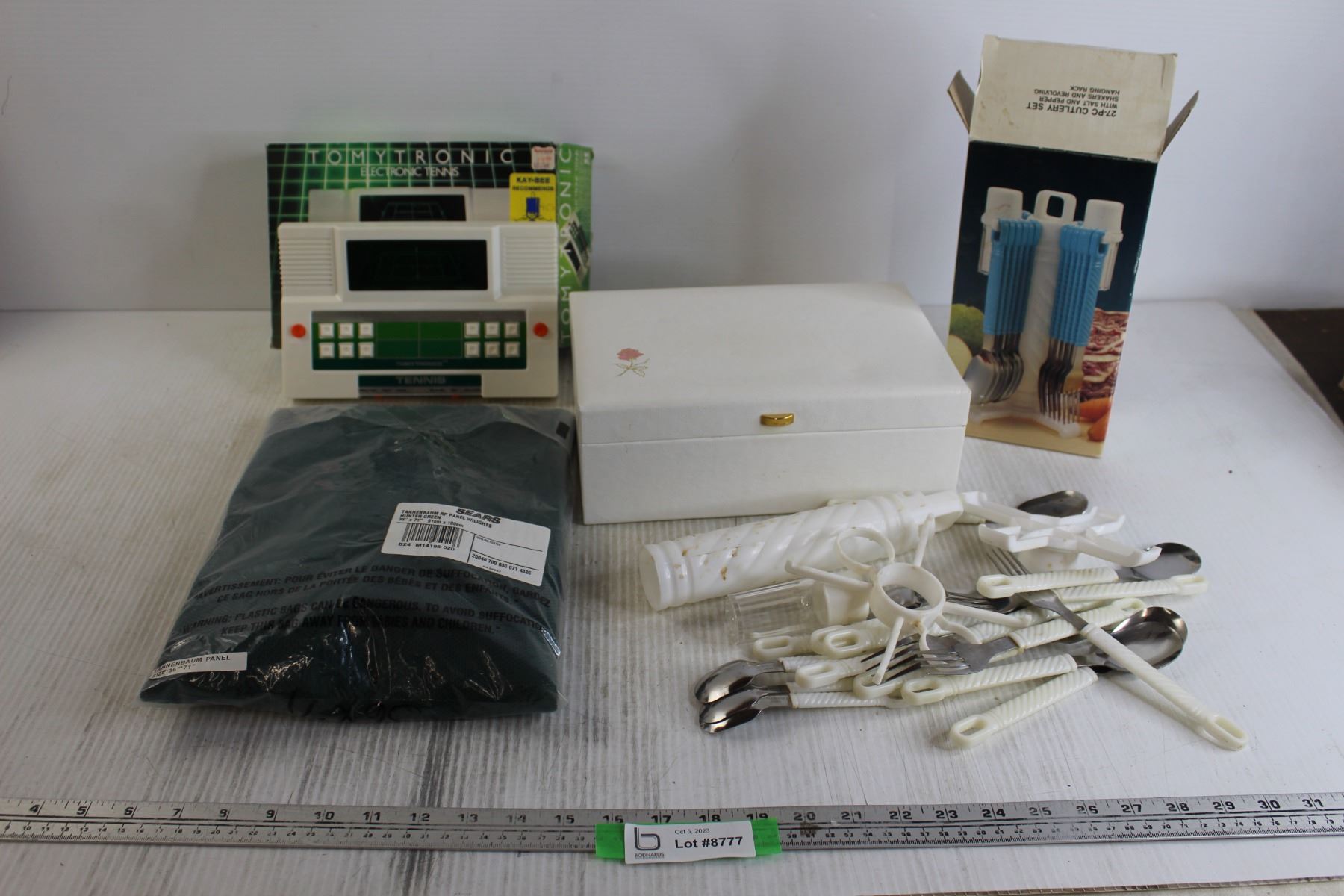 Tomytronic Electronic Tennis, Sears Tannenbaum RP Panel Curtains with Lights - Sealed, Jewelry Box, Cutlery Holder Set