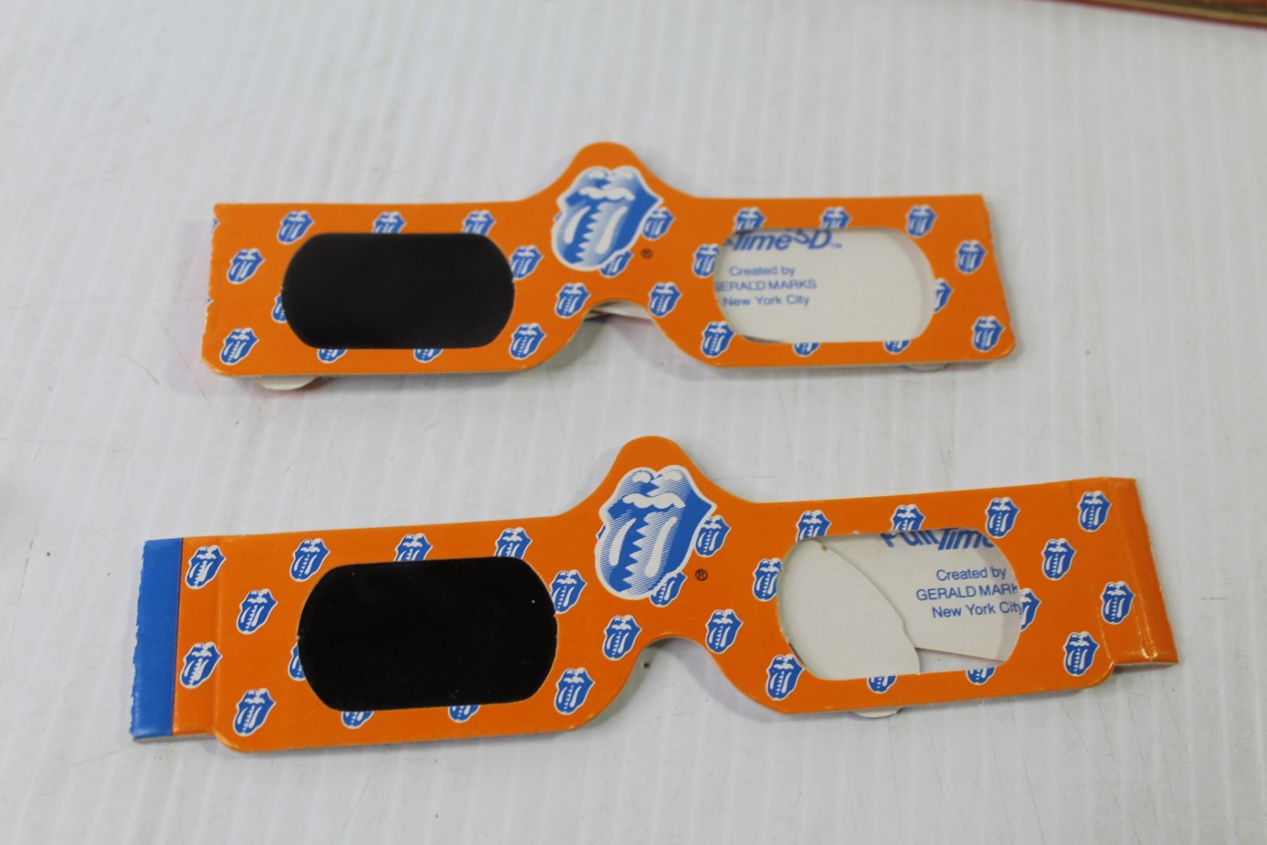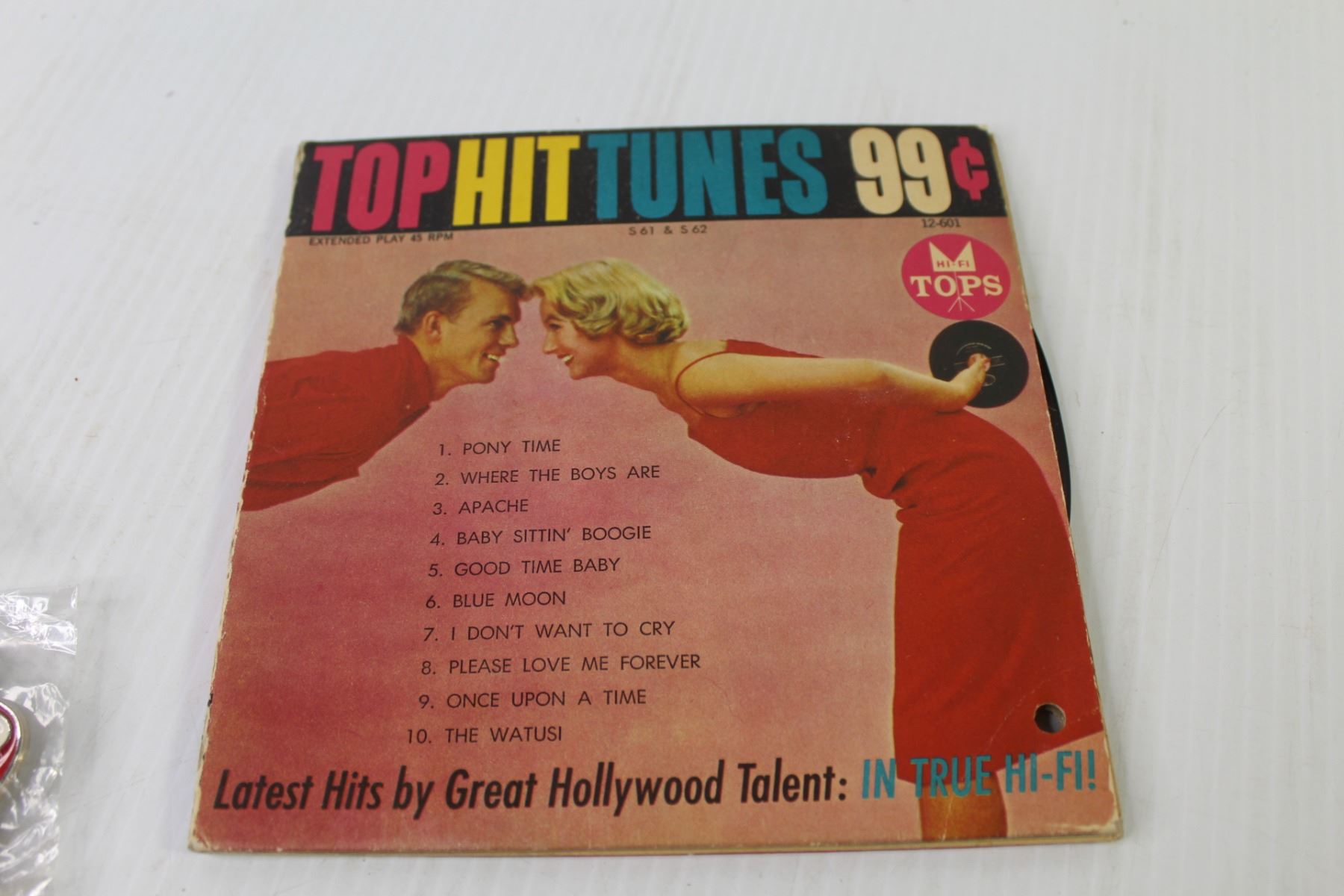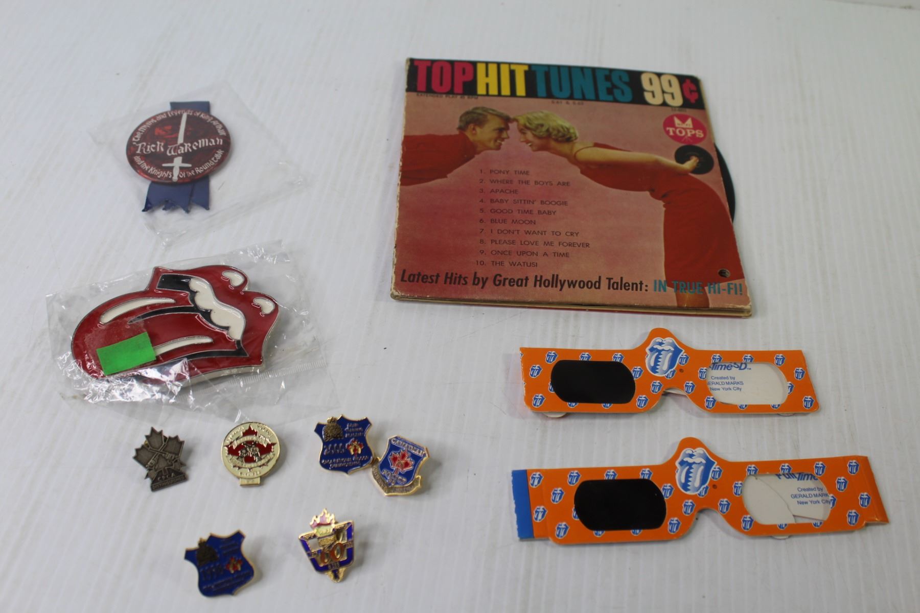 Top Hits Vinyl Record - 3D Glasses - Rolling Stones Tongue Belt Buckle - Police Combat Pins - Rick Wsakeman Pin