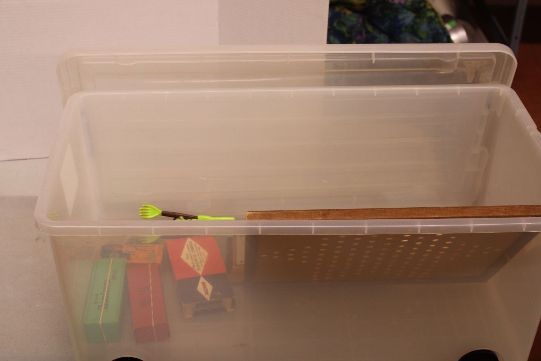 Tote with 1950's games - Little Squirt, Crib Board, Back Scratcher, Dominoes, Chinese Checkers