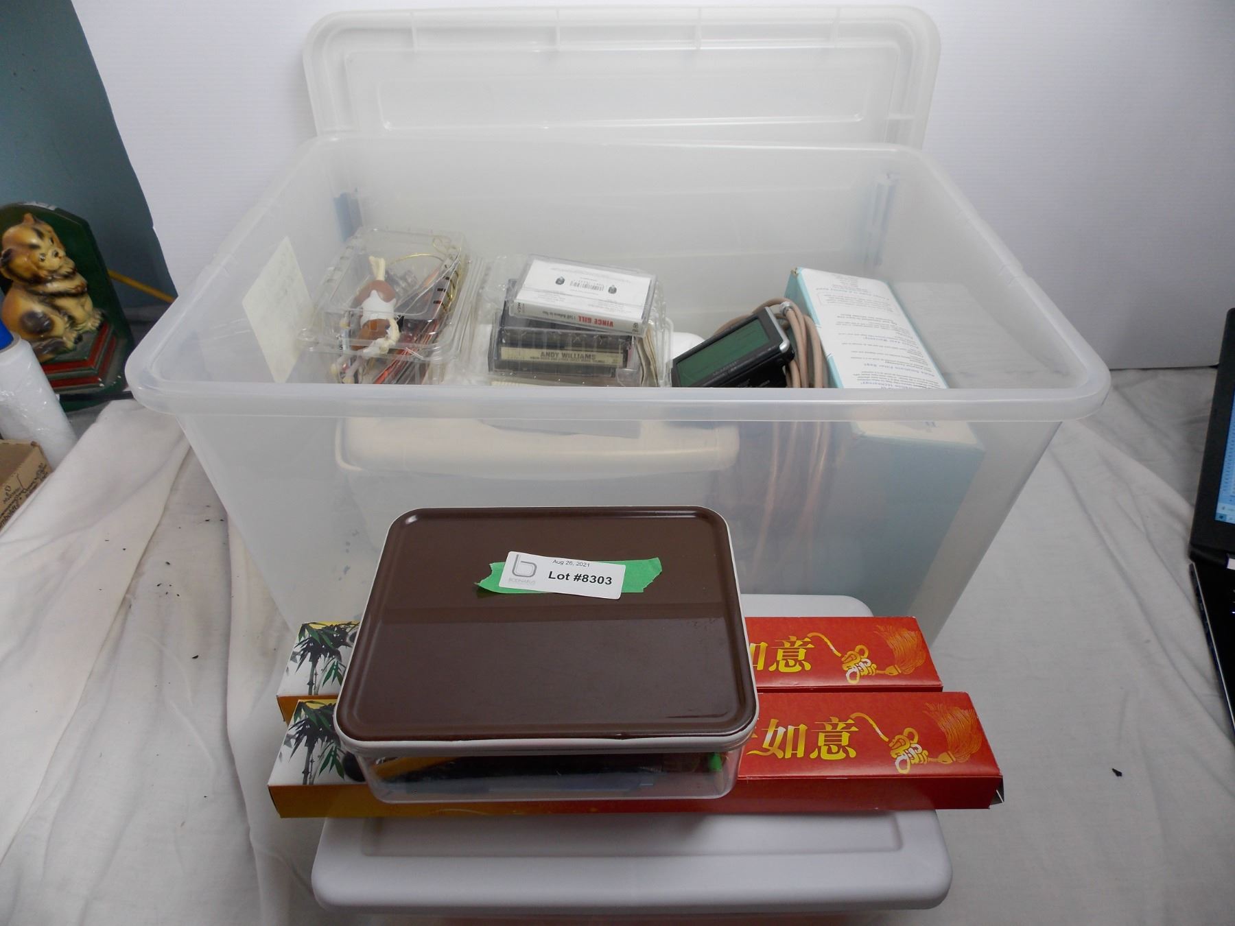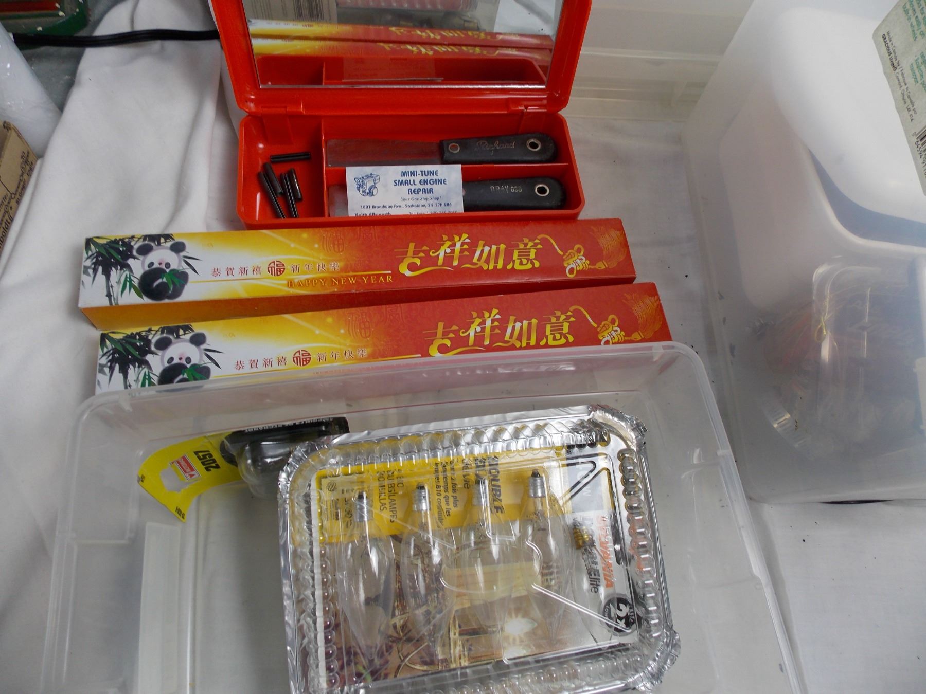 Tote with household batteries, pens, pipe clamps, vacuum filters, small sterilite stotes, new years scroll, etc