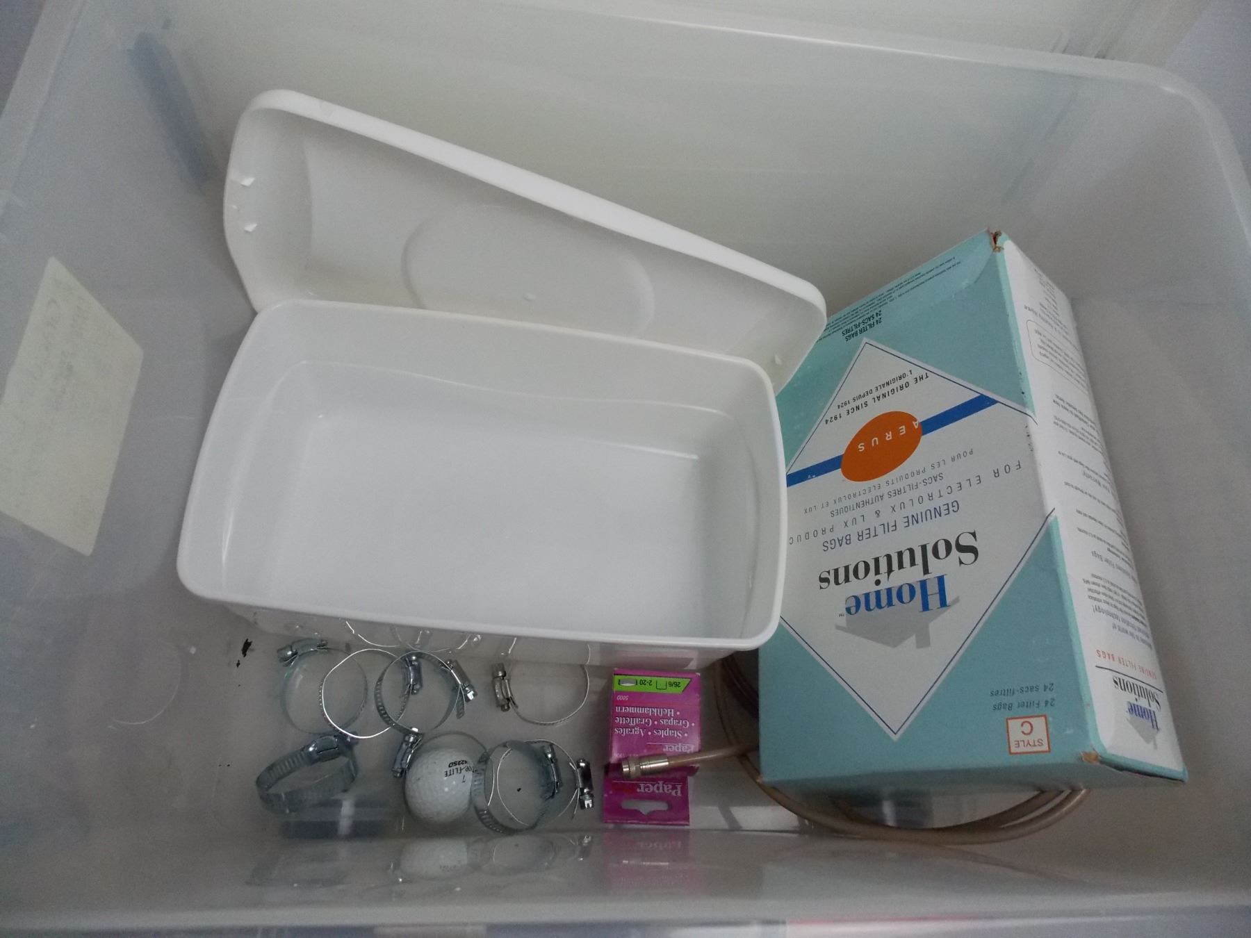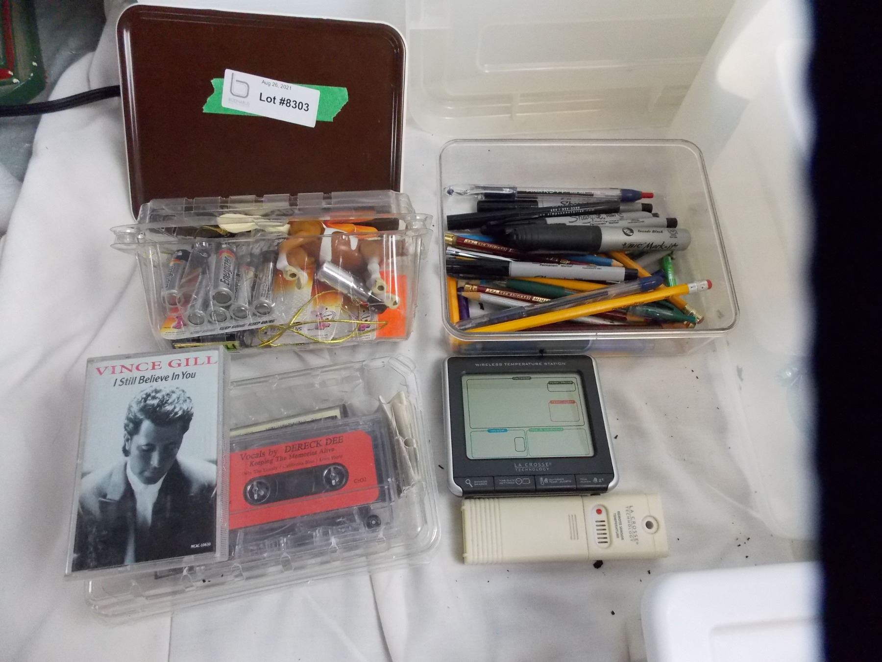 Tote with household batteries, pens, pipe clamps, vacuum filters, small sterilite stotes, new years