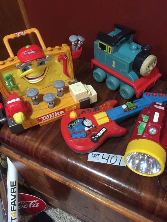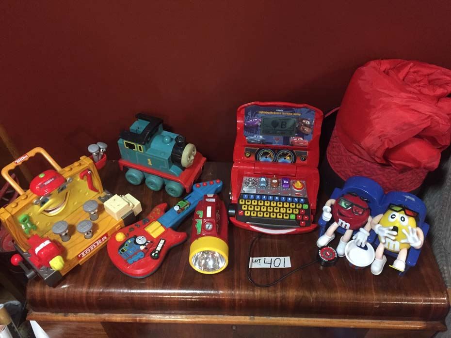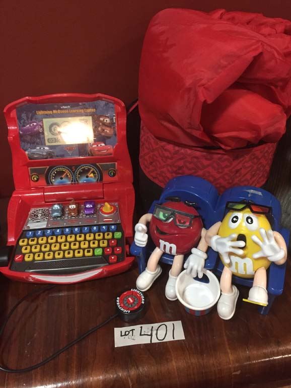 Thomas the Train toys, Cars lapstop-works, Tonka tool playset, M&M's dispenser, Cars sleeping bag-grat shape