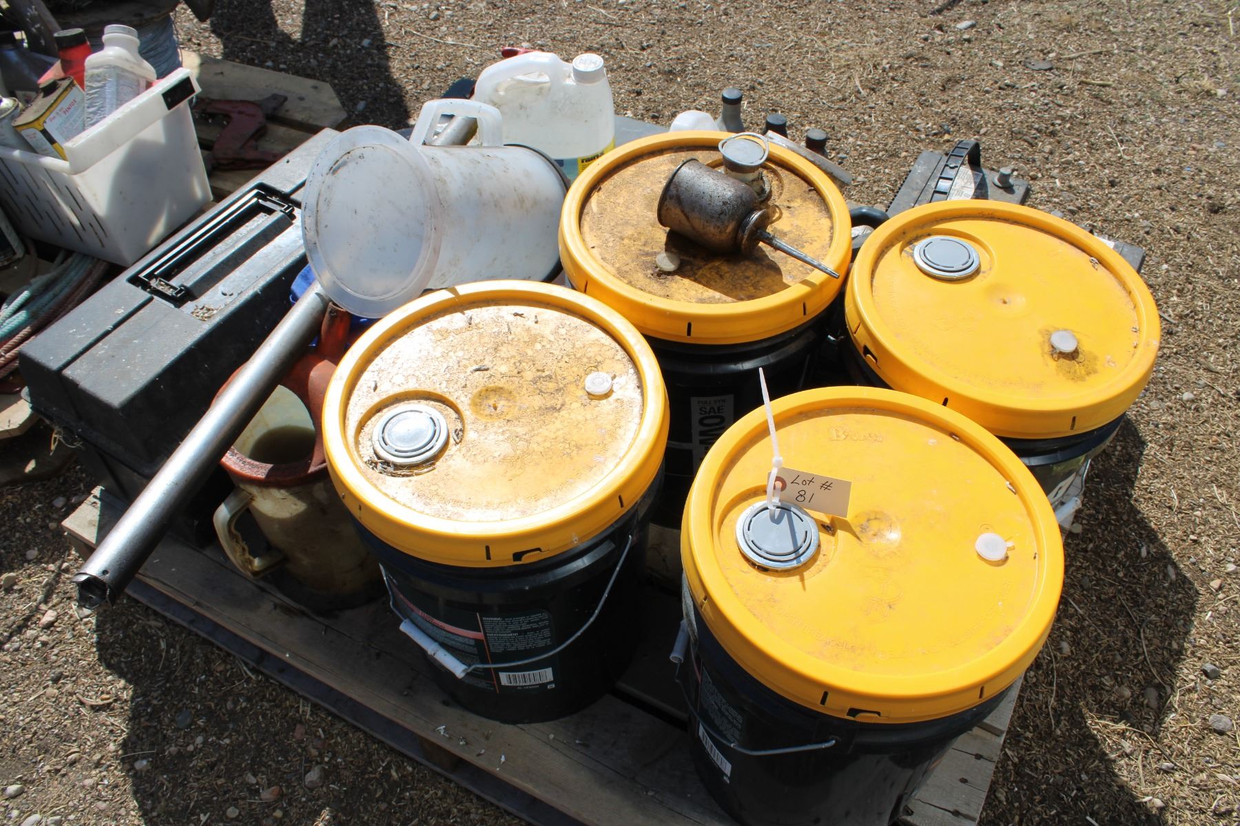 Tractor fluids, batteries, tools, oils etc (everything on pallet)