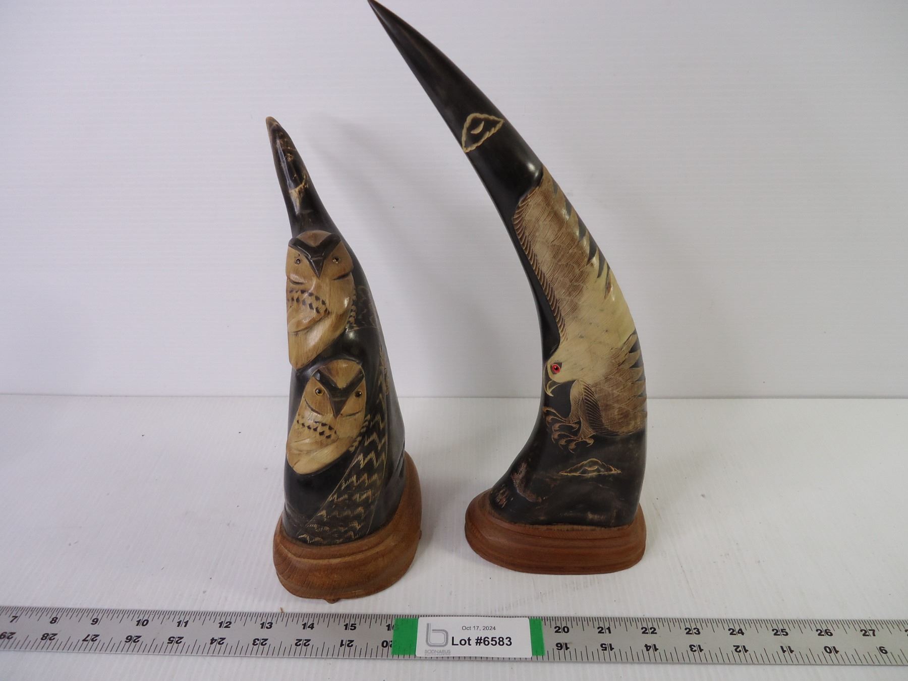 Twin Owl and Eagle Hand Carved and Painted on a Buffalo Horn