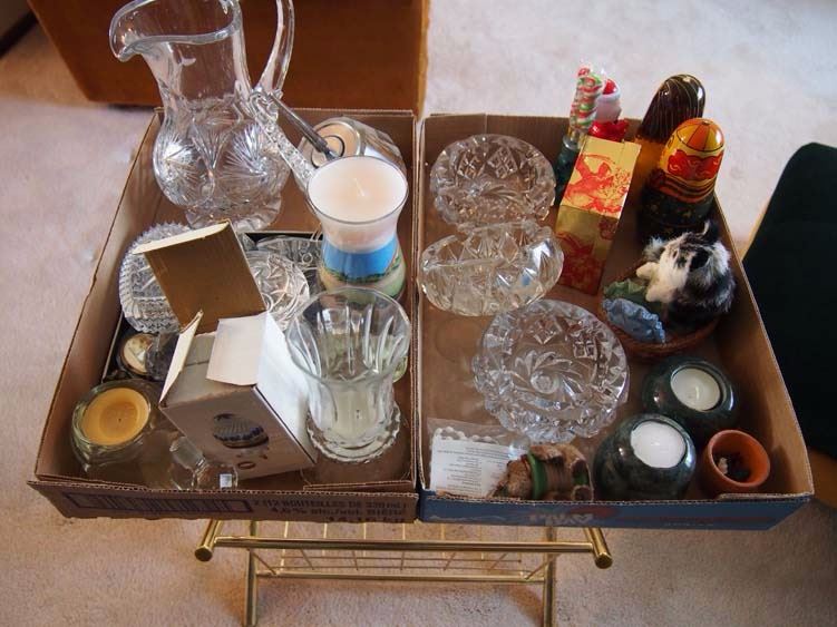 Two Boxes Full Of Glassware, Candleholders, Paperweights, Collectibles, Etc.