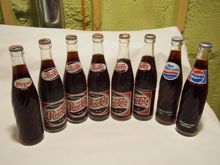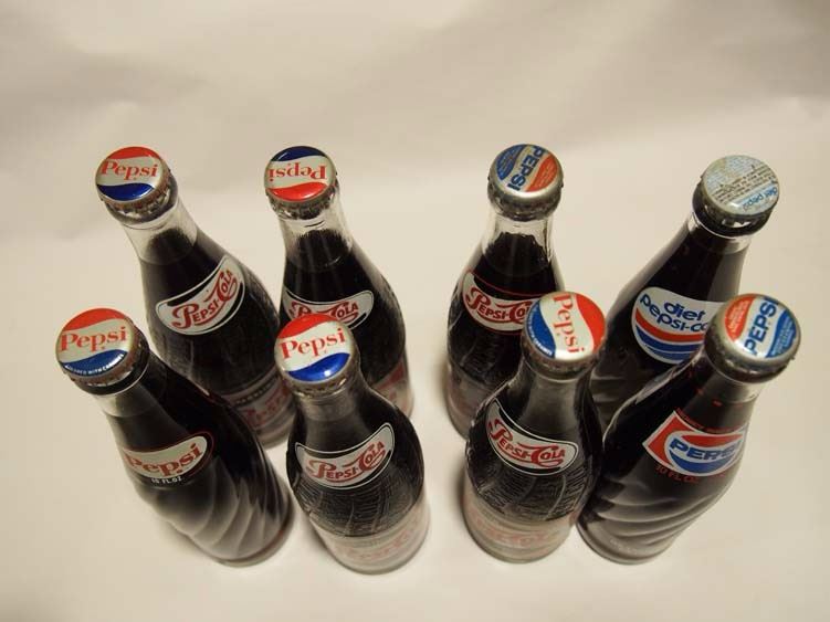 Unopened Antique Glass Soda Bottles (8) (Pepsi, Pepsi-Cola, Diet Pepsi-Cola)