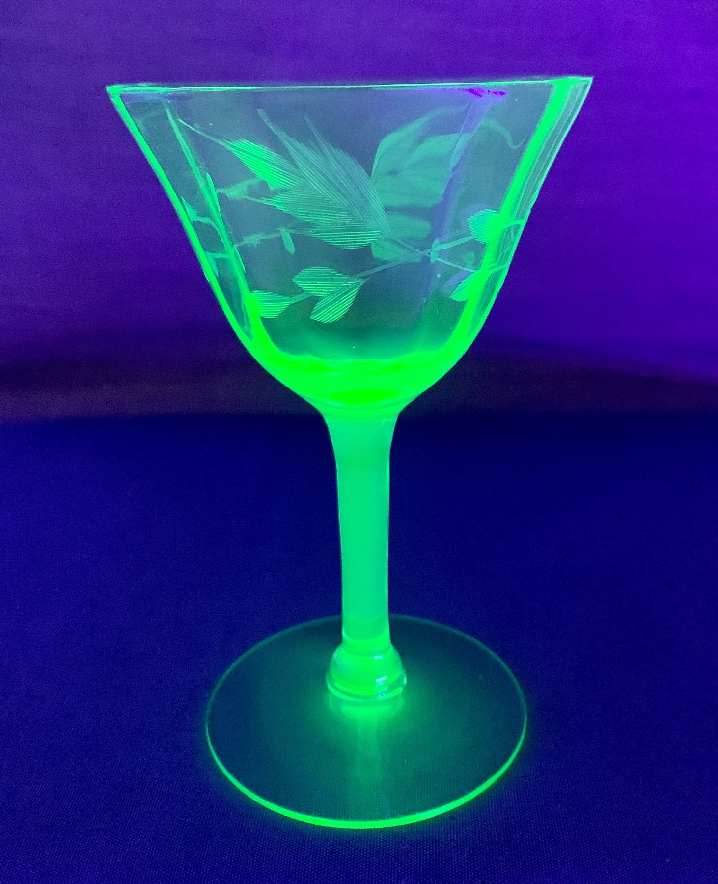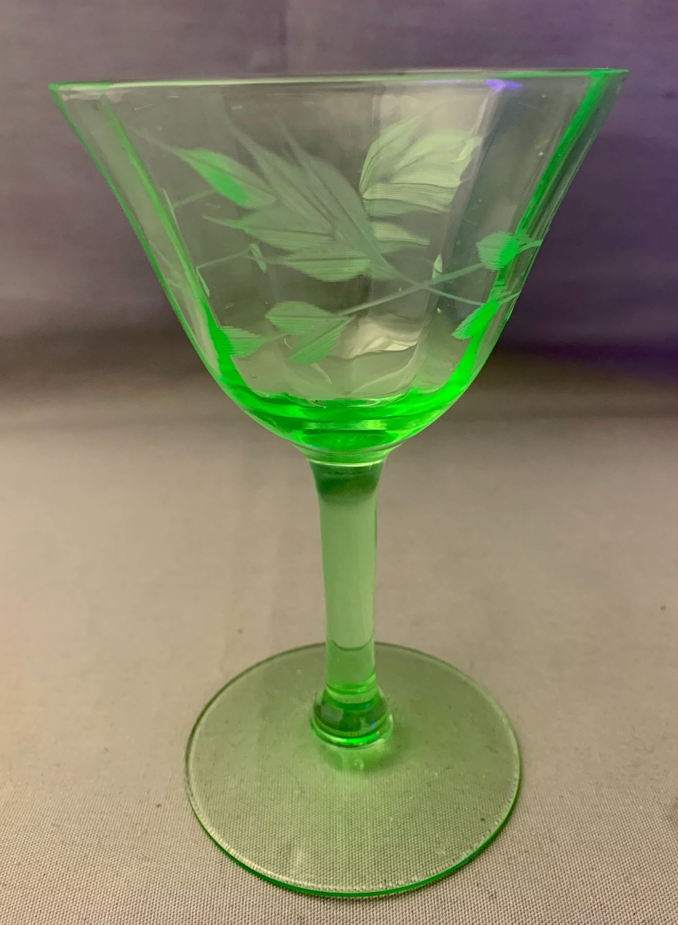 Uranium/Depression Glass Wheel-Cut Floral Stemmed Wine Glass - Rare, Circa 1930s